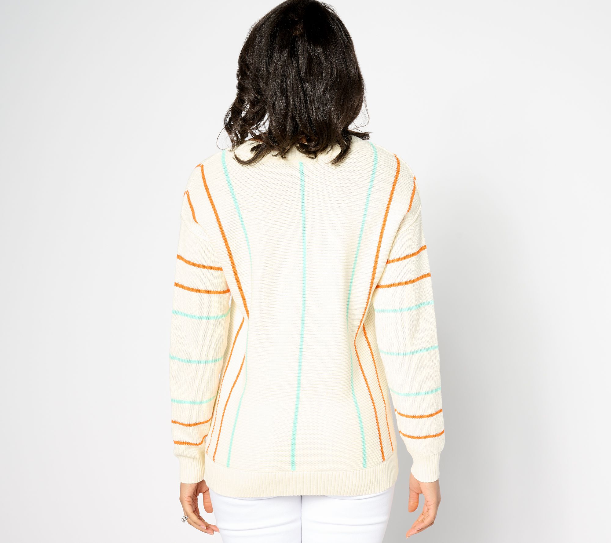 • Features: summer stripe motif, rib V-neckline, dropped shoulder, long sleeves, rib cuffs and hem band, contrasting braided raised stitch detail