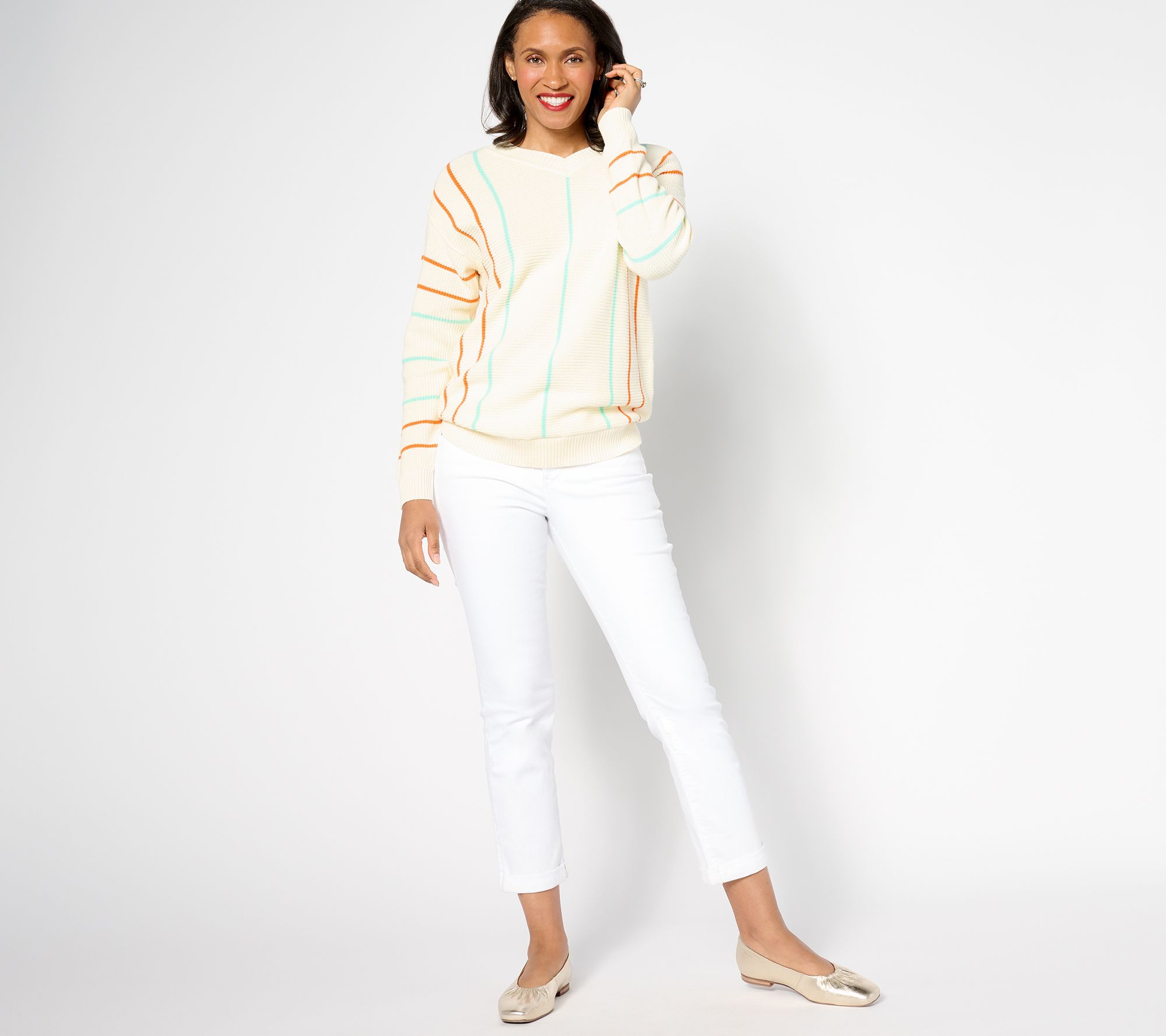 Shore bound? Don't forget your nouveau striped sweater (move over, nautical), done here in 100% comfy cotton. You'll need it for evening waterside strolls, catching up on the porch with friends, and chilly theaters and restaurants. From Studio ParkTM x Kerstin Lindquist.