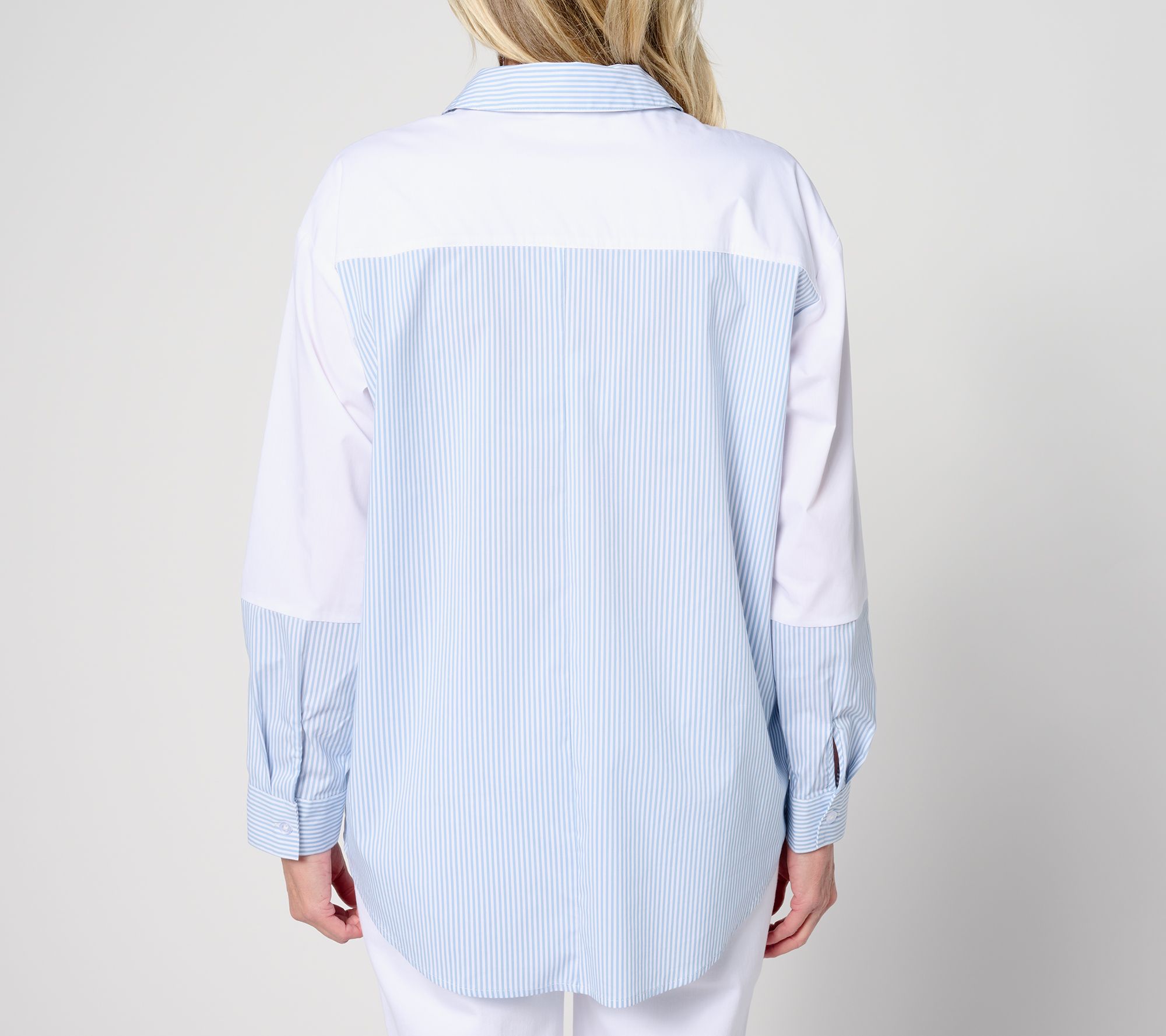 • Features: drop shoulder with long spiced sleeves and functional button cuffs, collar with collar stand, button closure, stripe body with solid yoke, hi/low shirttail hem bottom