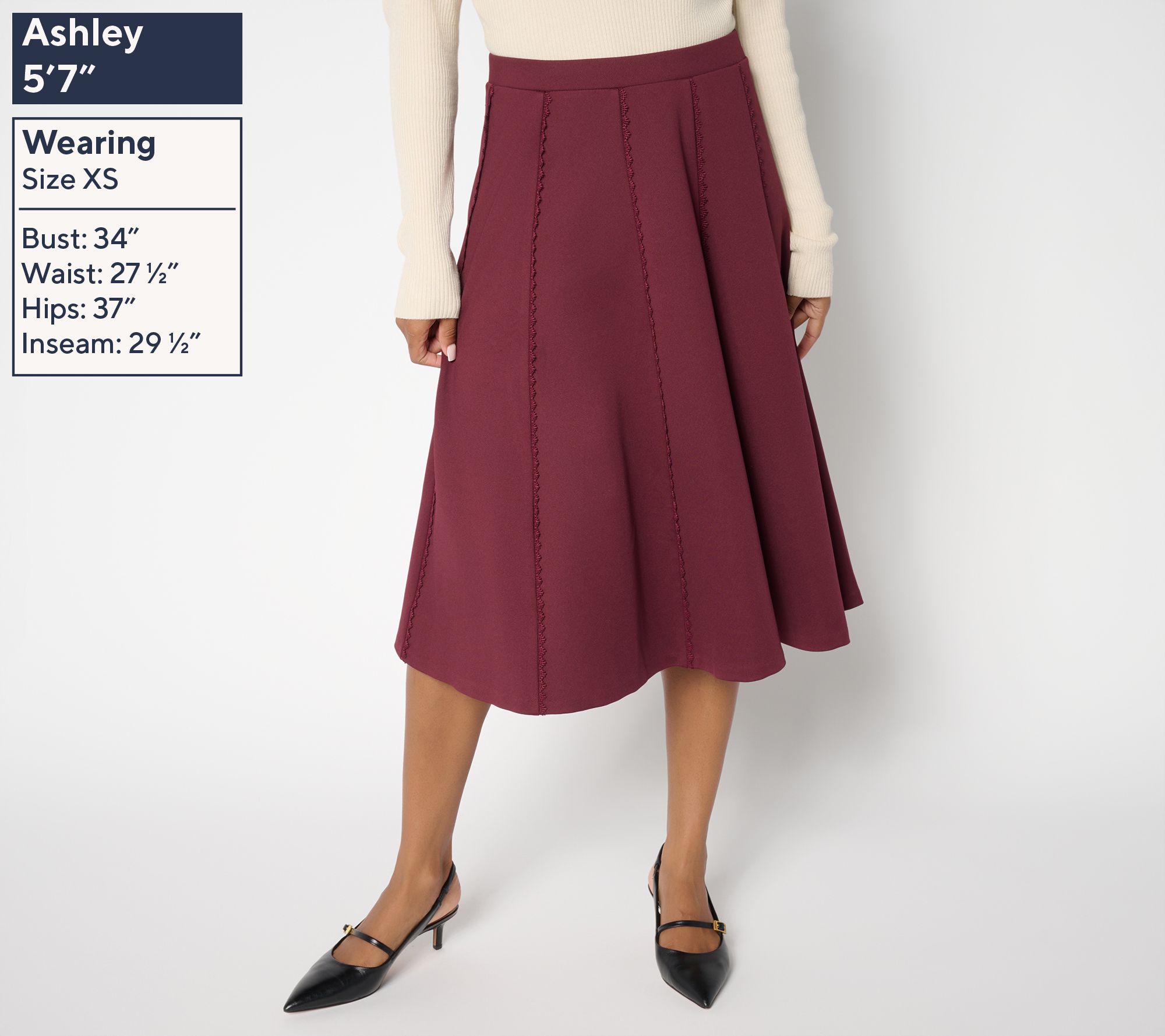 • Features: pull-on style, midi length, rick-rack trim, clean-finish hem, flat waistband