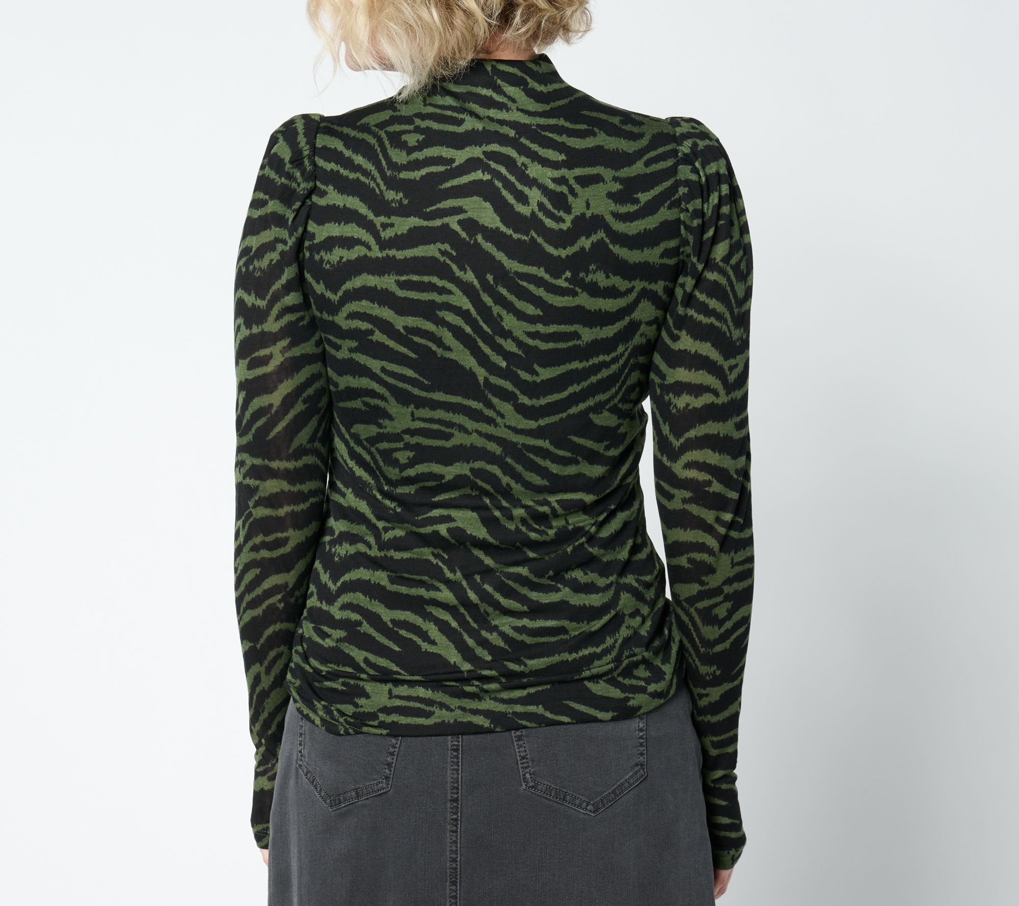 • Features: long sleeves with shirring at the sleeve cap, funnel neck, lined bodice, thumbholes in sleeves, turnback hem