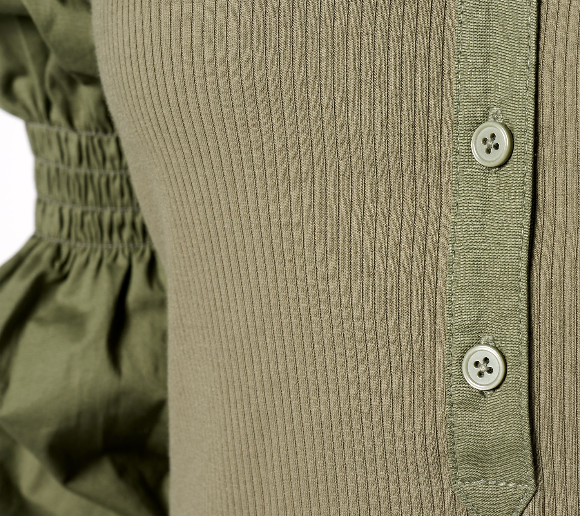 • Features: long woven poplin sleeve with smocked details and cuffs, front placket with two fixed buttons and three functional buttons