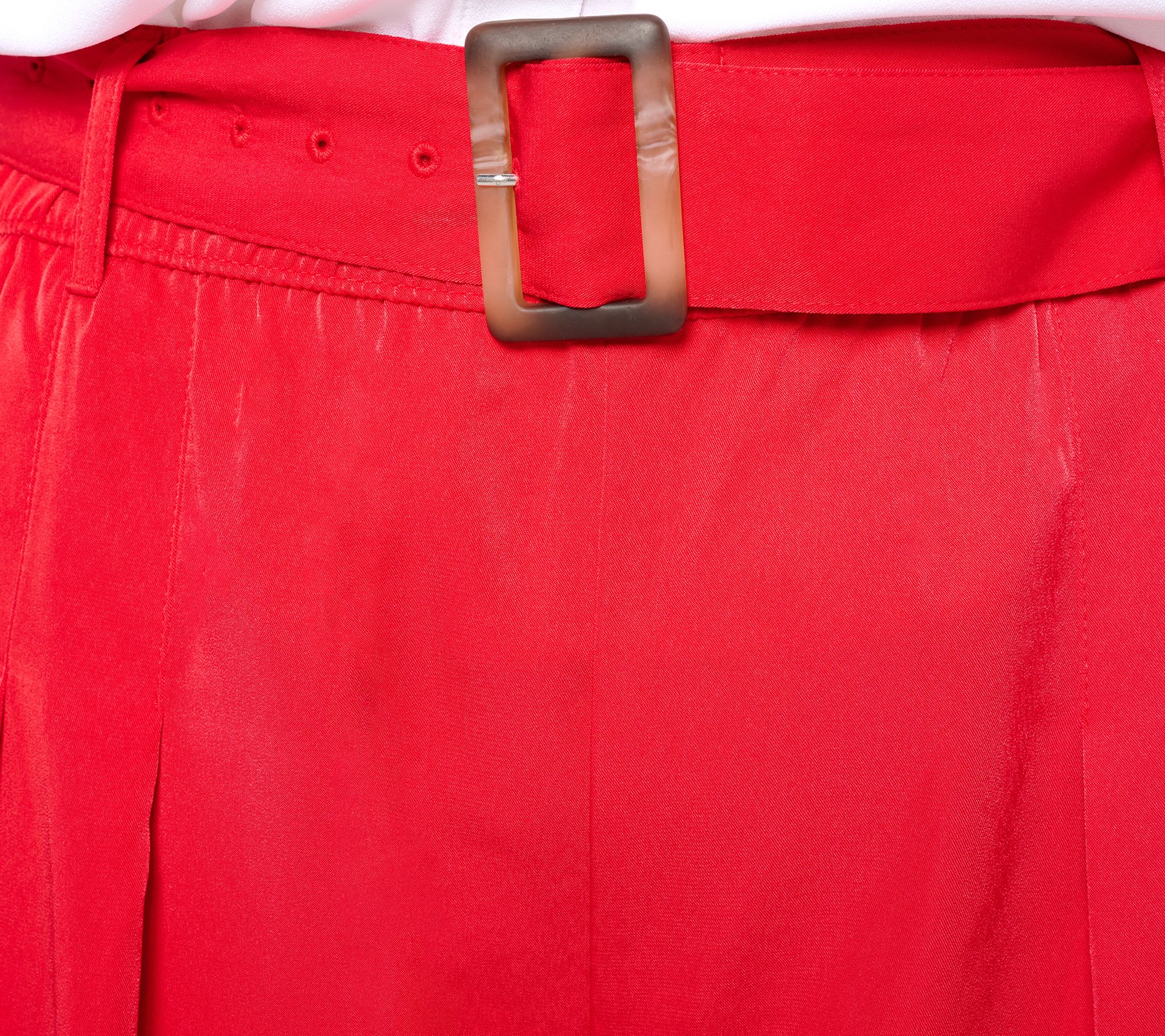 • Features: encased elastic waistband with removable self belt, front slash pockets, front pleats, belt loops with edge stitching, double turnback hem