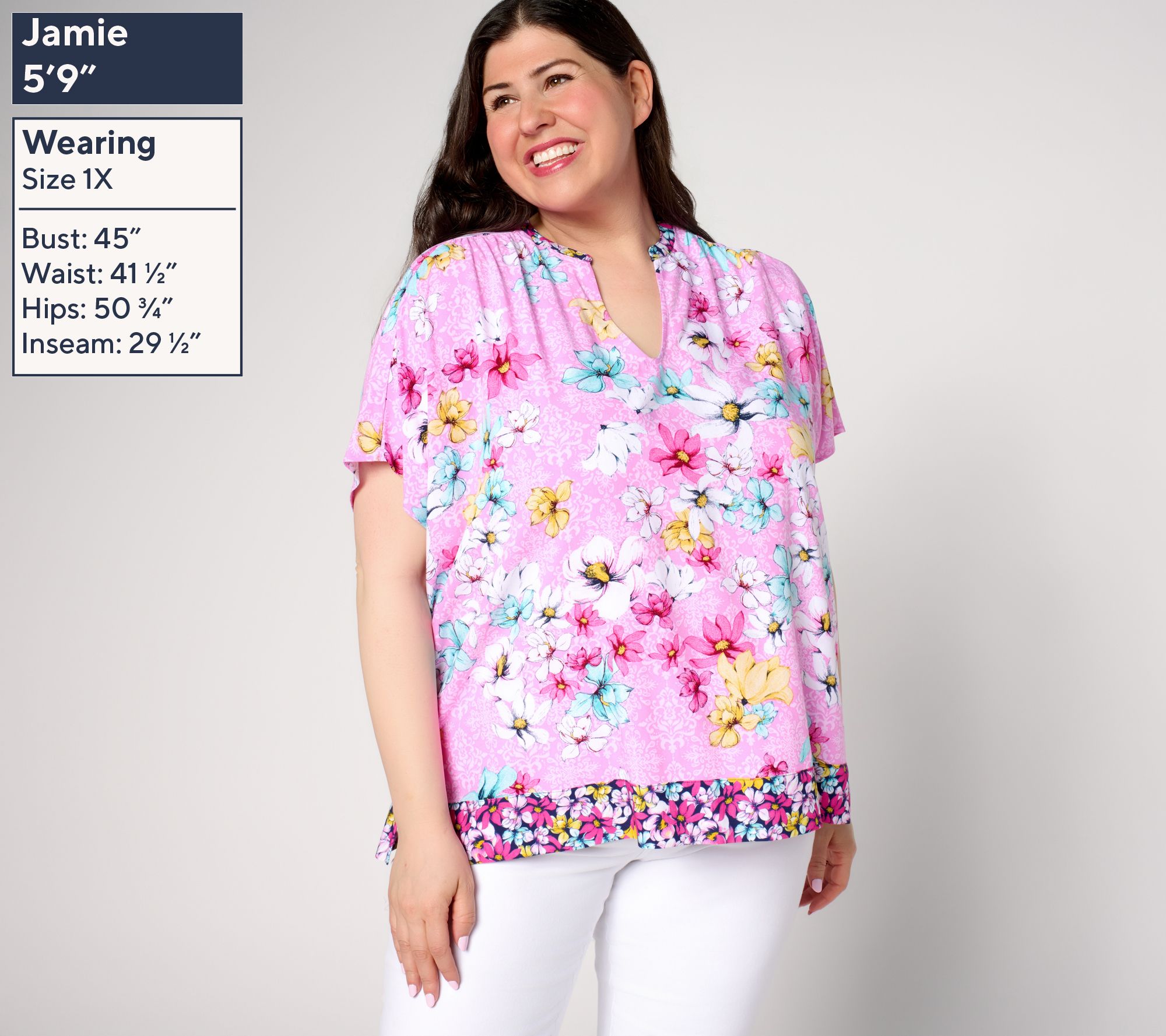 • Features: allover floral print, short dolman sleeves with shirring at shoulder seam, two-ply neckband, V-necklin, shirring at center back neckline, clean-finished side slits, border print sewn separately