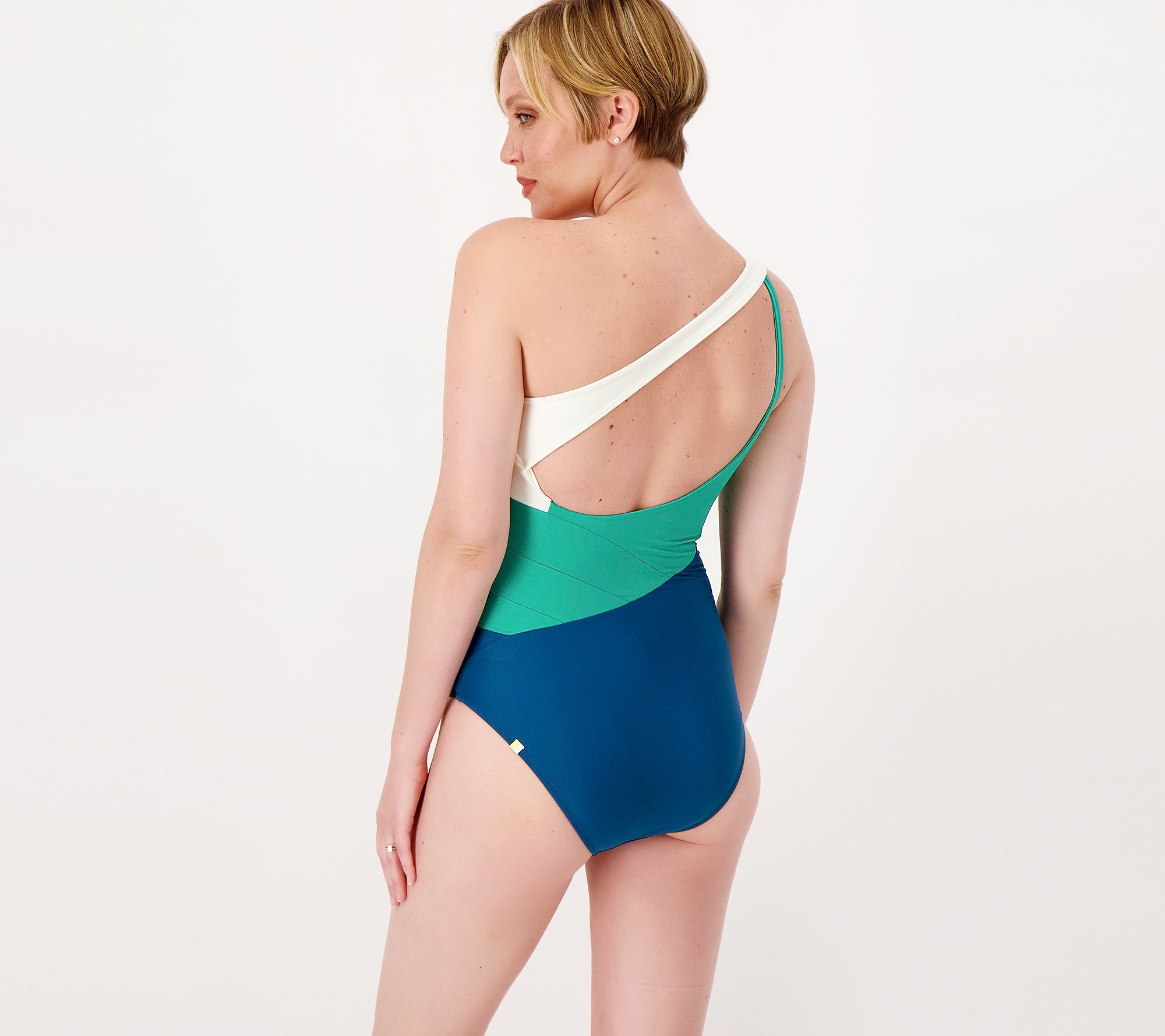 • Features: one-piece style, diagonal seaming, designed for full support without cups or padding, full seat coverage, two-way stretch, pilling-resistant, shape retention, UPF 50+