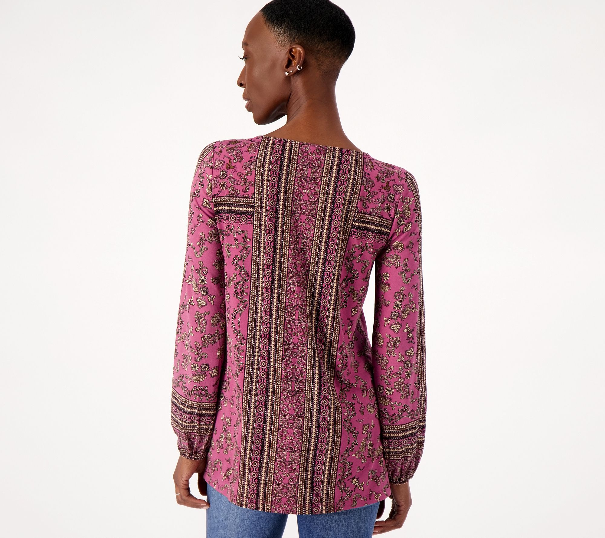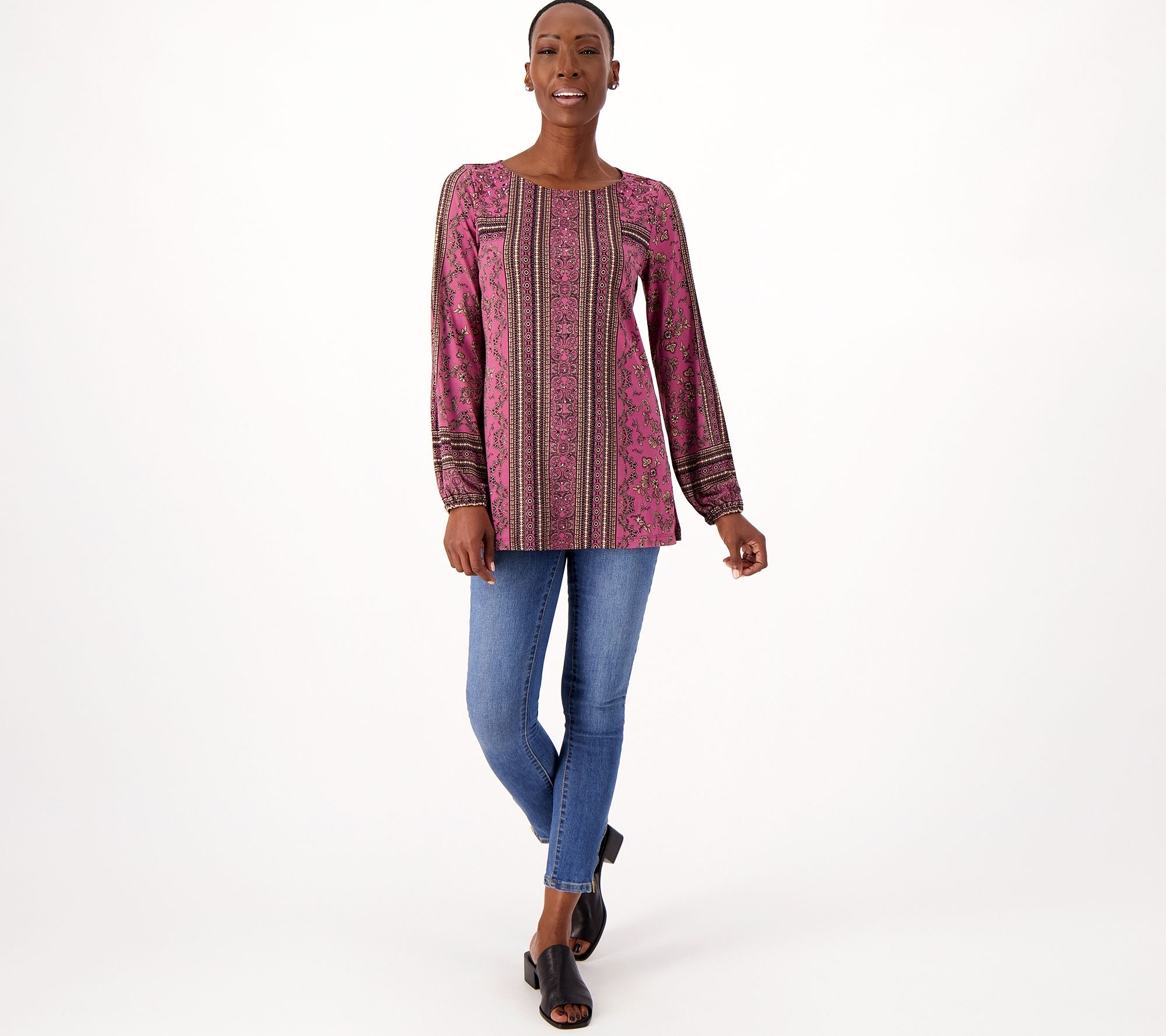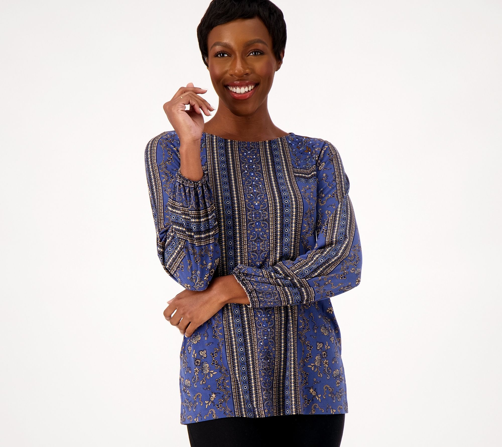 Business-casual at its best. Long blouson sleeves and a bateau neckline provide this printed tunic with extra style points. From Susan Graver.