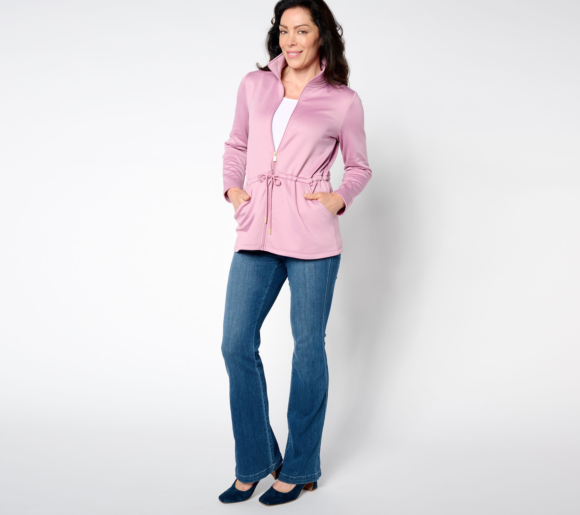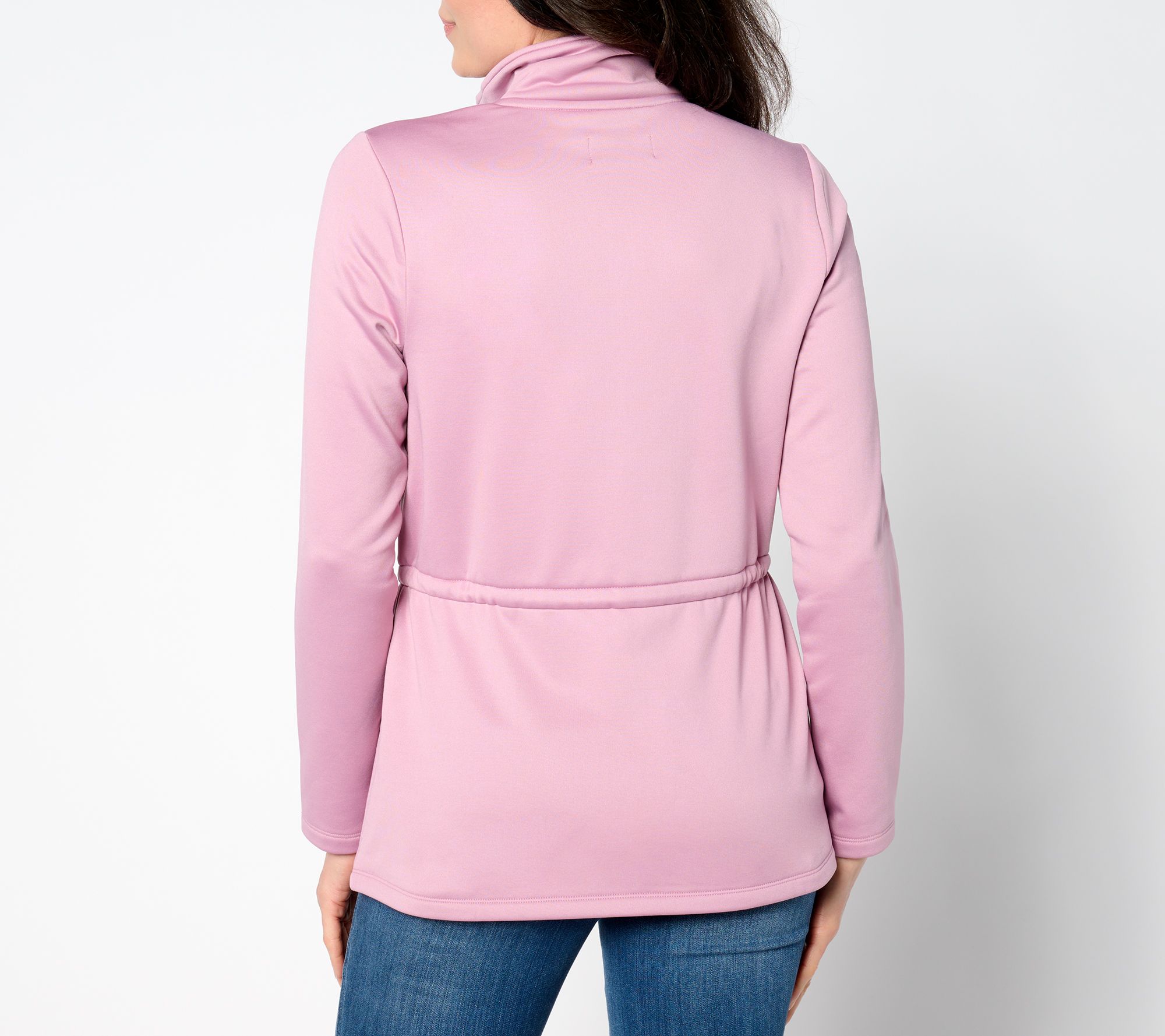 Casual days call for something chic and cozy, like this fleece jacket. The drawstring detail cinches at the waist for a flattering look and functional side pockets provide added convenience. Layer it over a tank top or T-shirt on cooler days for effortless style and comfort. From Susan Graver.