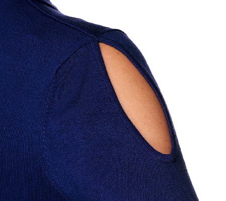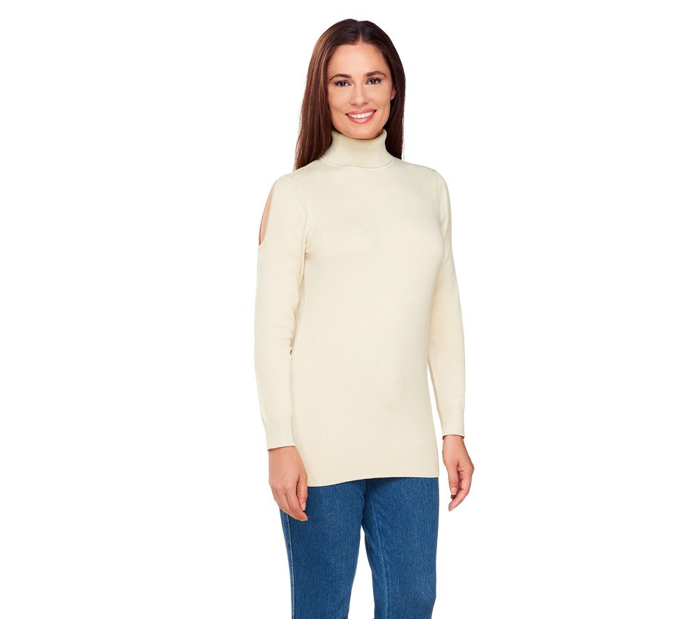 For a fun and inspired look, this Susan Graver turtleneck sweater puts a modern twist on a cold-weather classic by adding flirty shoulder cutouts. From Susan Graver.