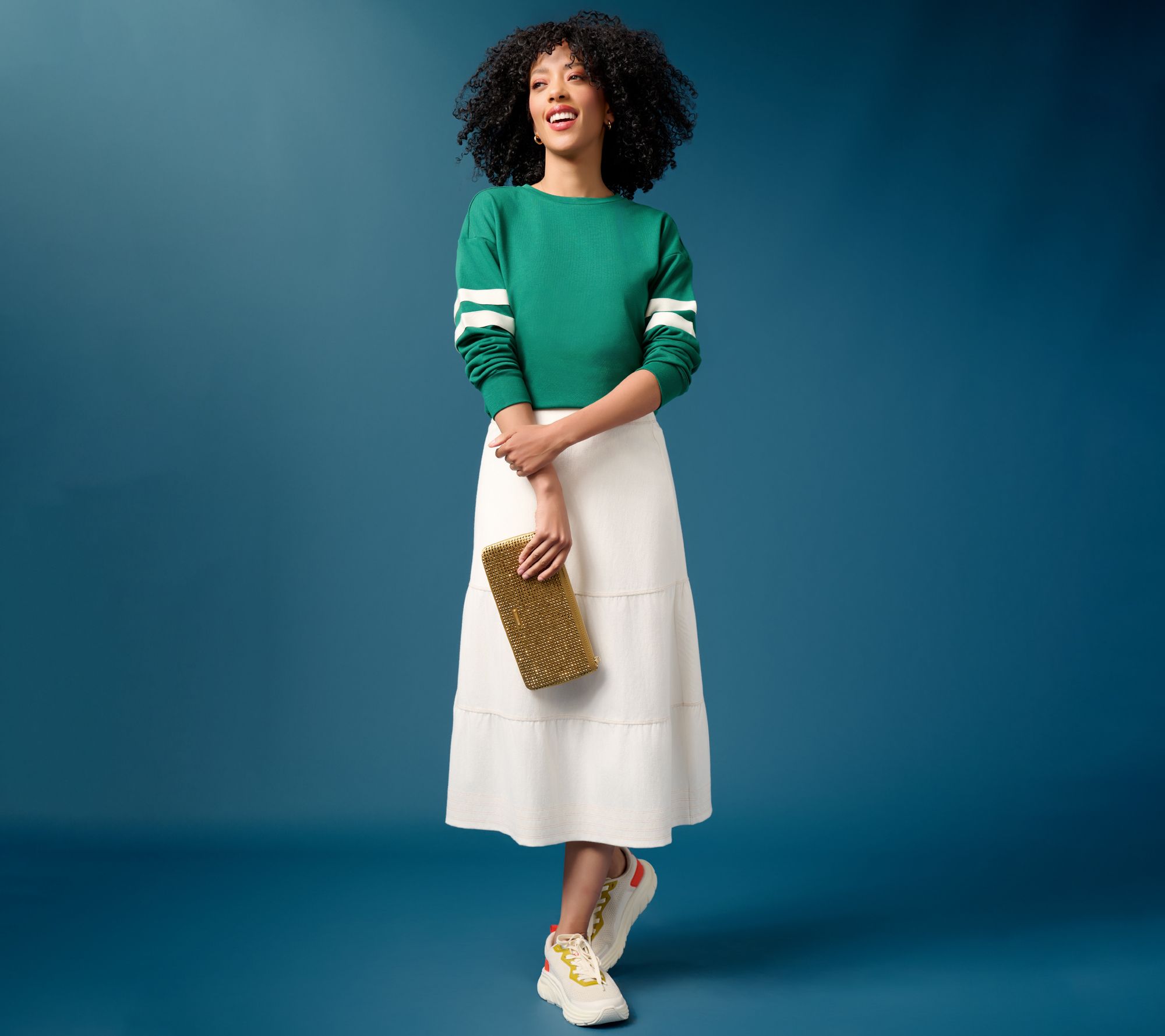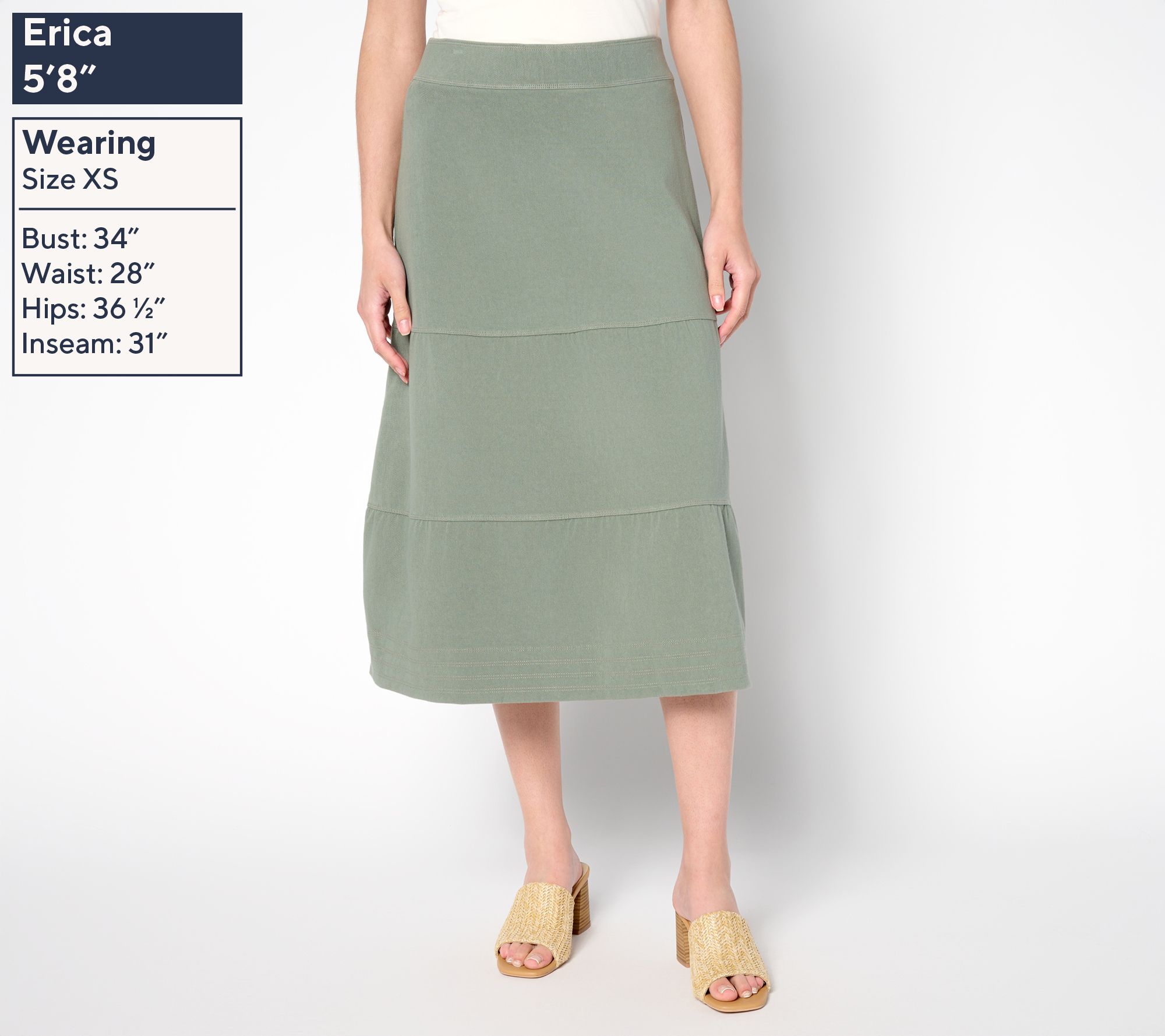 Unpredictable temps, run-around days, and hot flashes won't mess with your style vibe in this must-have midi skirt, crafted from cool-to-the-touch knit denim. Flowy, flattering tiers and the smoothest-ever waistband make it a regular in your rotation from sandal season to sweater weather. From Susan Graver.