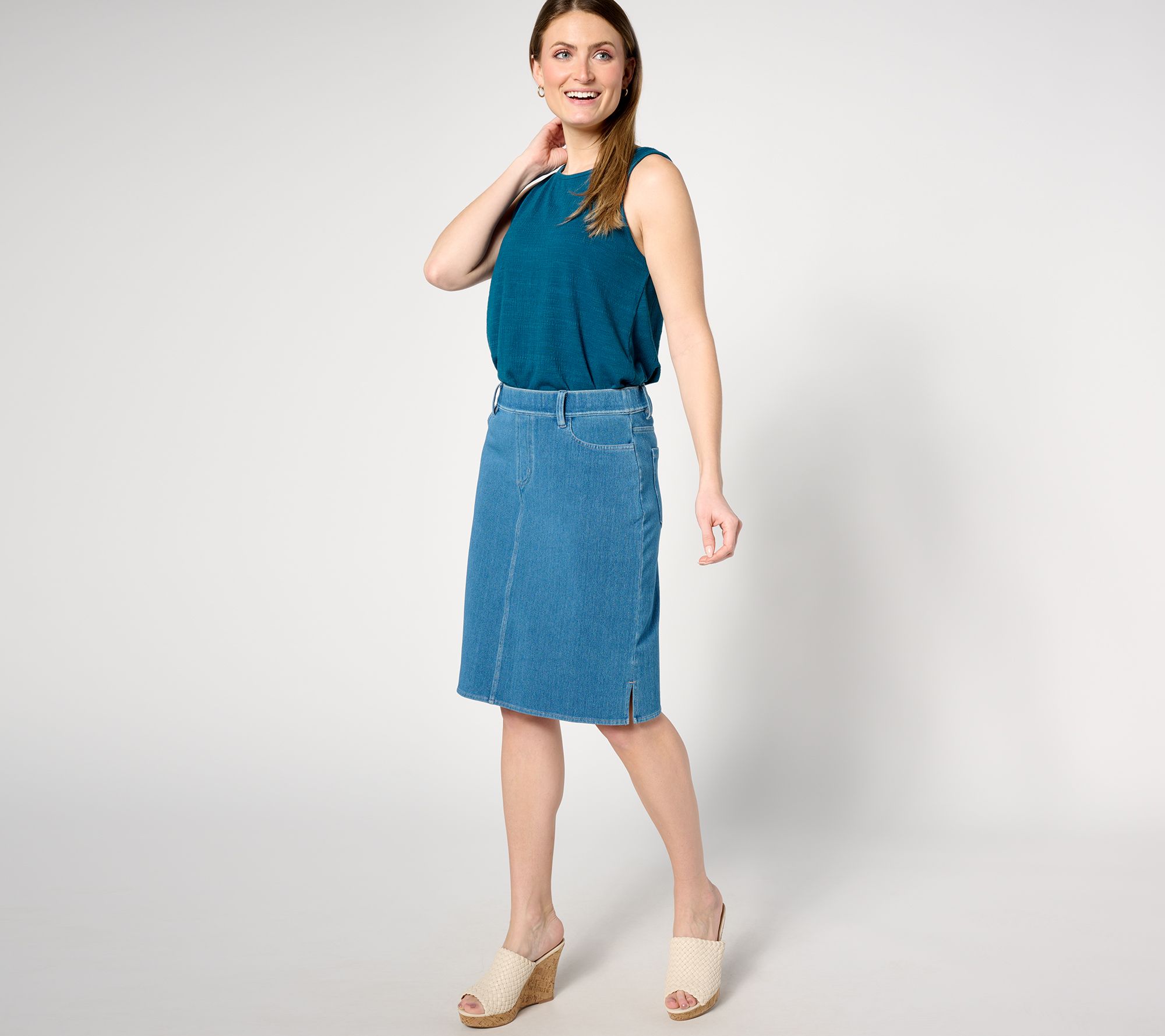 Who hasn't had a denim skirt in their closet sometime in the last four (or five!) decades? This wardrobe hero takes on a modern refresh as a free-spirited skirt with the look of denim but the feel of a knit. Now you can feel comfy walking, bending, and sitting for hours at a time in a fabric that flexes thoughout your day and feels cool to the touch. How's that for an upgrade? From Susan Graver.