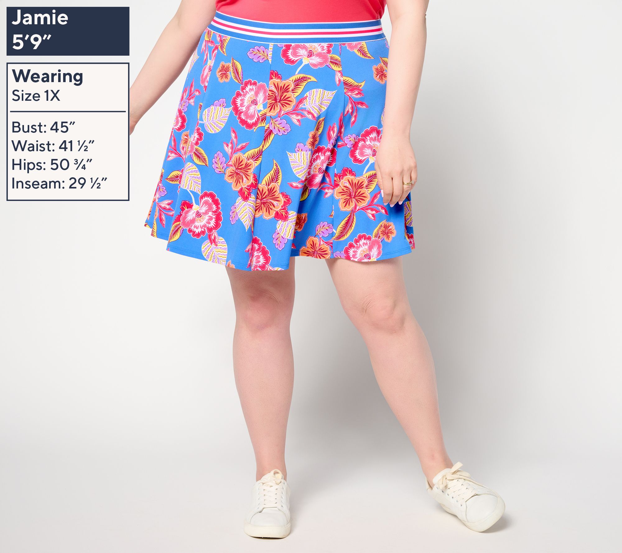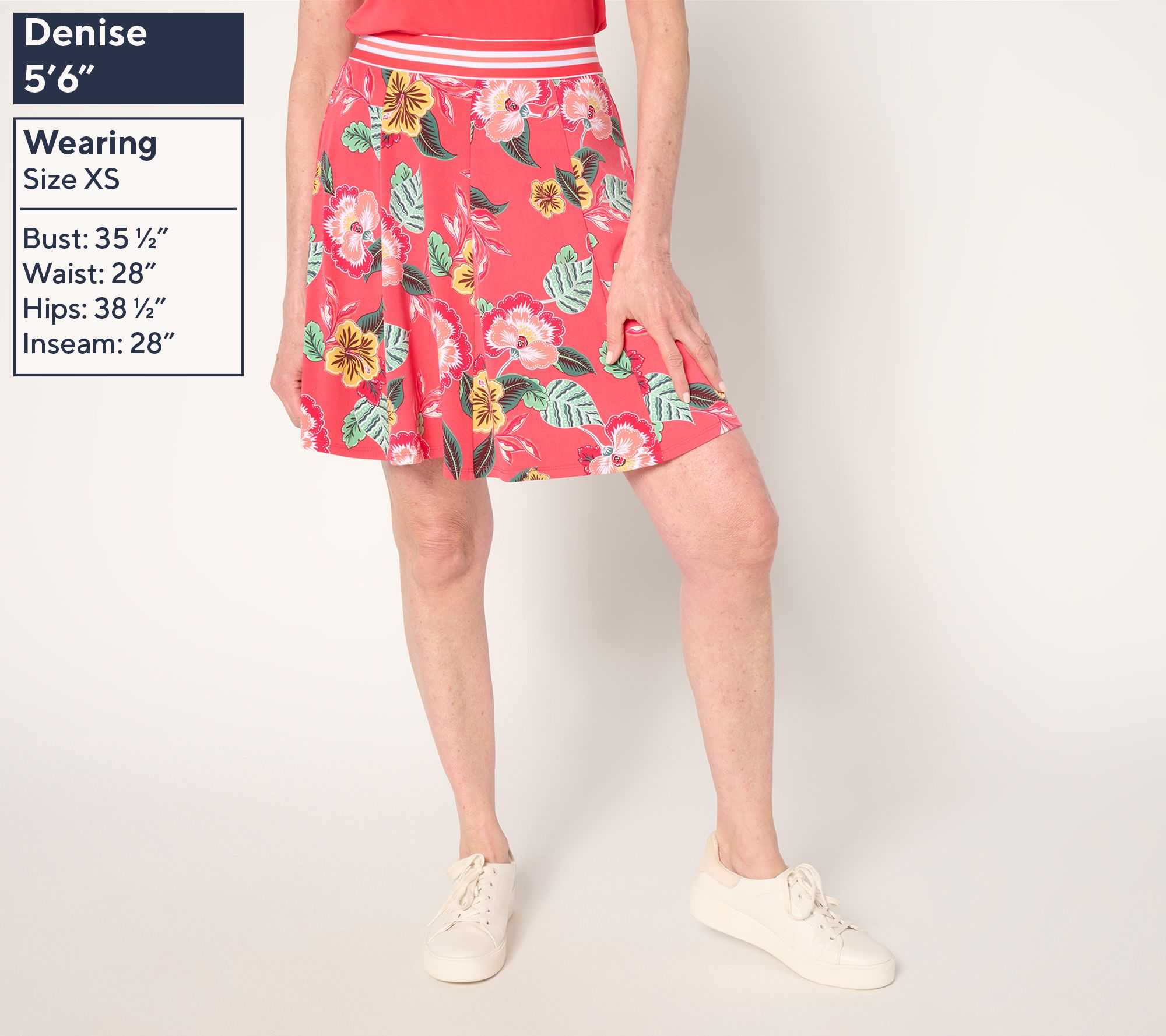 Pickup games, park strolls, or afternoon outings -- this printed Liquid Knit®skort gives you options. The striped elastic waistband adds sport-inspired energy, while attached solid knit shorts mean you can move with confidence wherever you go. Slip on with sneakers or sandals and you're ready for activity or relaxation, no quick changes needed. From Susan Graver.