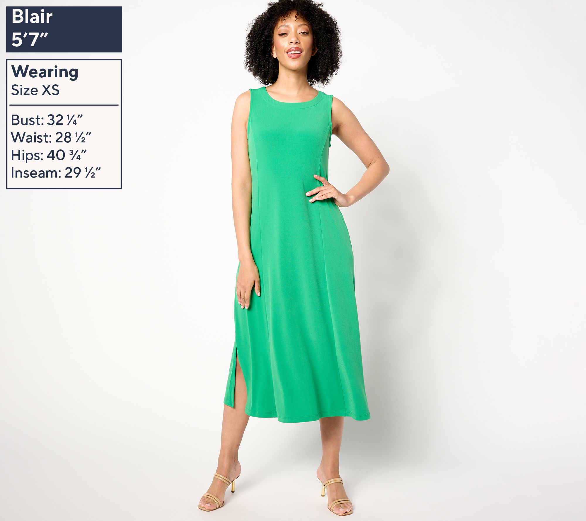 • Features: midi length, sleeveless, high crew neckline, side-seam pockets, princess seams, back button-closure keyhole