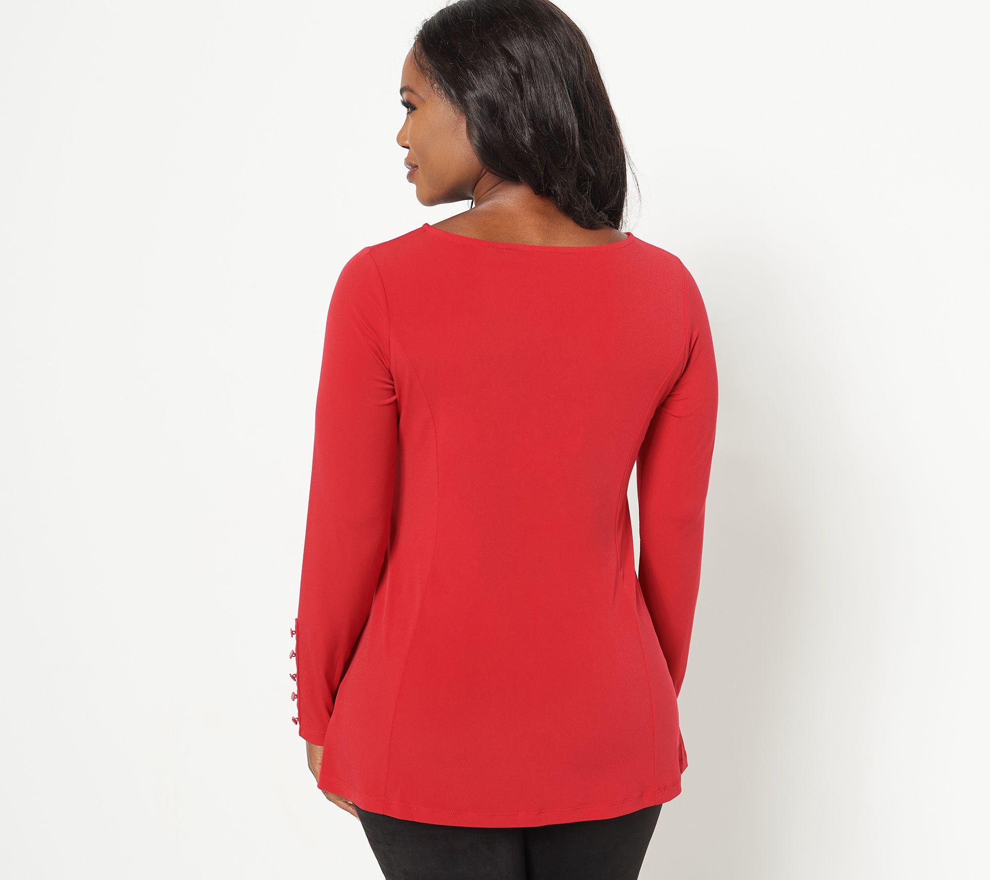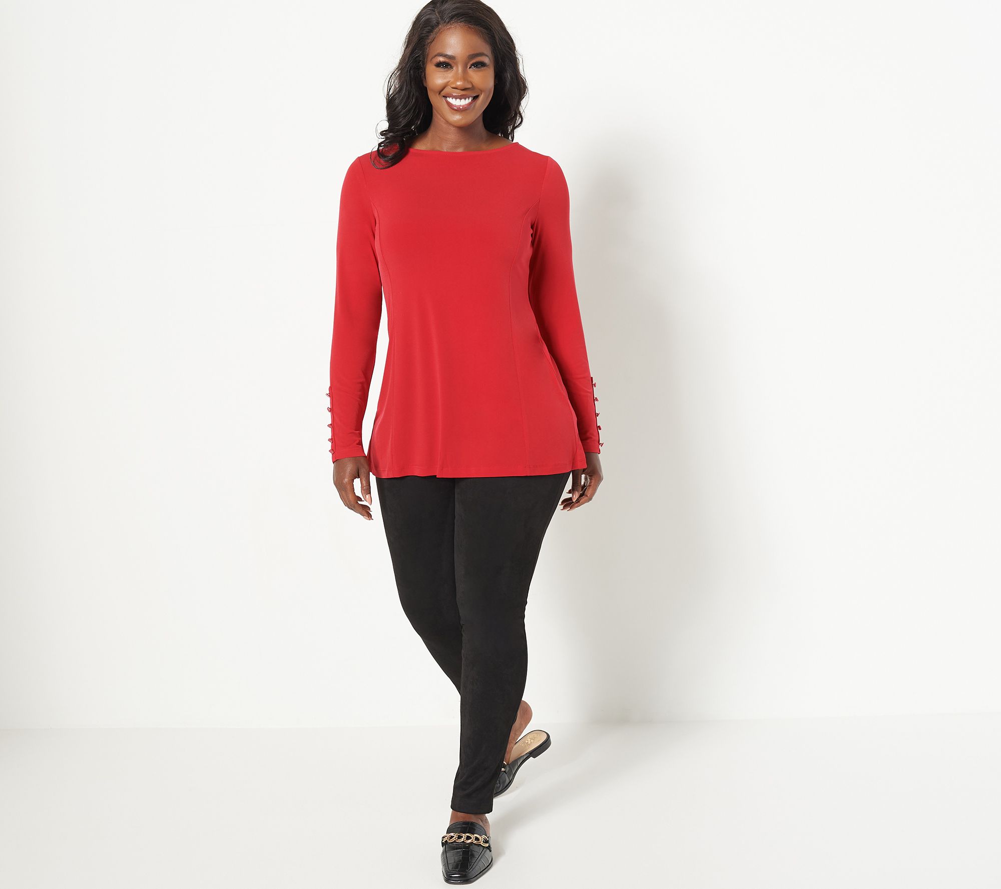 Button details and luxe Liquid Knit® elevate this everyday-wear top from basic to wardrobe-winner! Pair it with checkered dress-coats, smooth leather jackets, and distressed denim pants, for mix-and-match ease that makes this tunic an absolute essential. From Susan Graver.