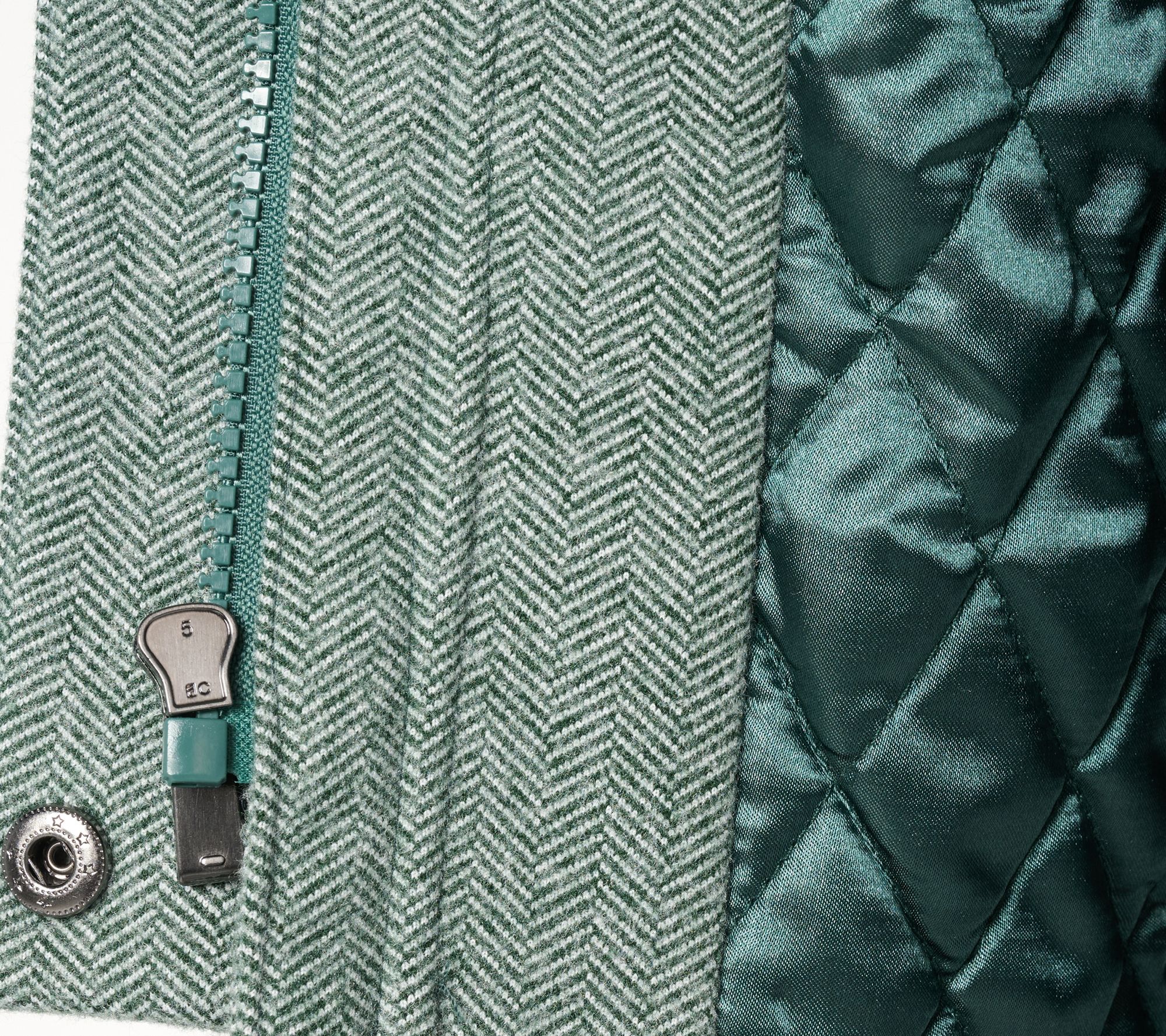 • Features: herringbone pattern, quilted lining, forward shoulder seam, long set-in sleeves, front storm flap/placket covering zipper, stand collar with snap closures, front and back princess seams, functional welt pockets with flaps