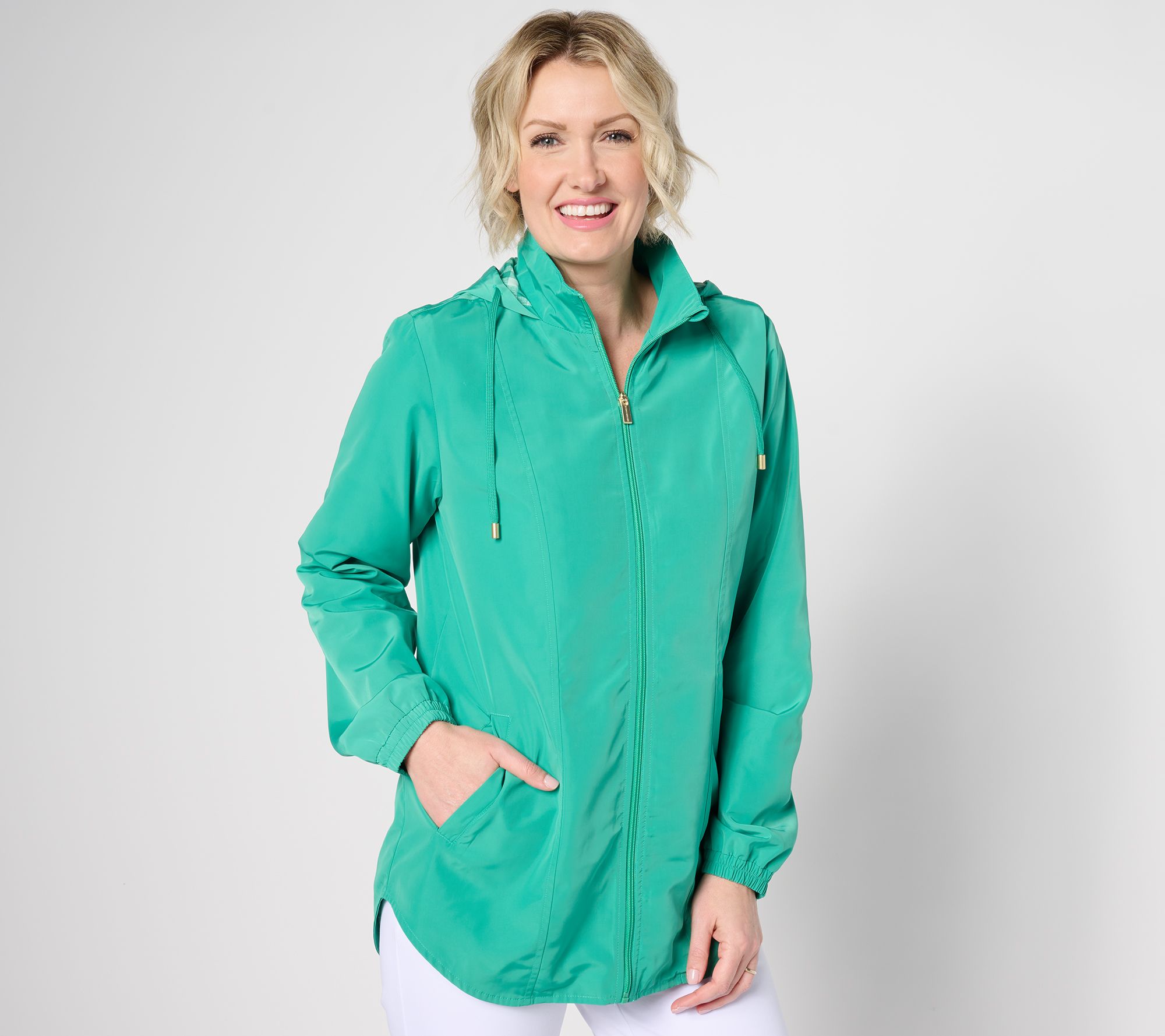 When the weather is iffy, you'll surely reach for this wear-everywhere windbreaker that features a flattering curved bottom hem for a more sporty look. The attached hood helps keep sprinkles from spoiling your 'do. From Susan Graver.
