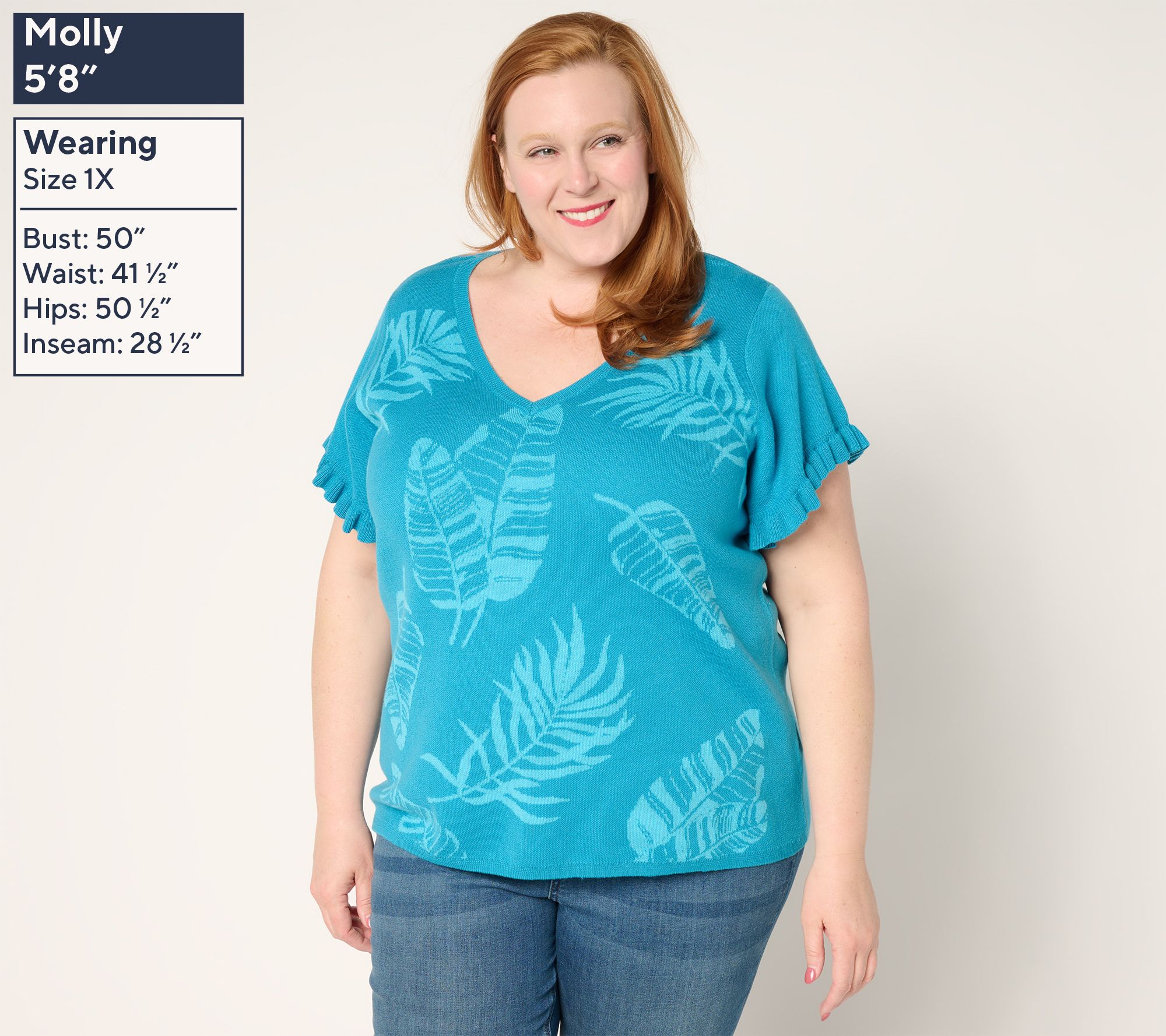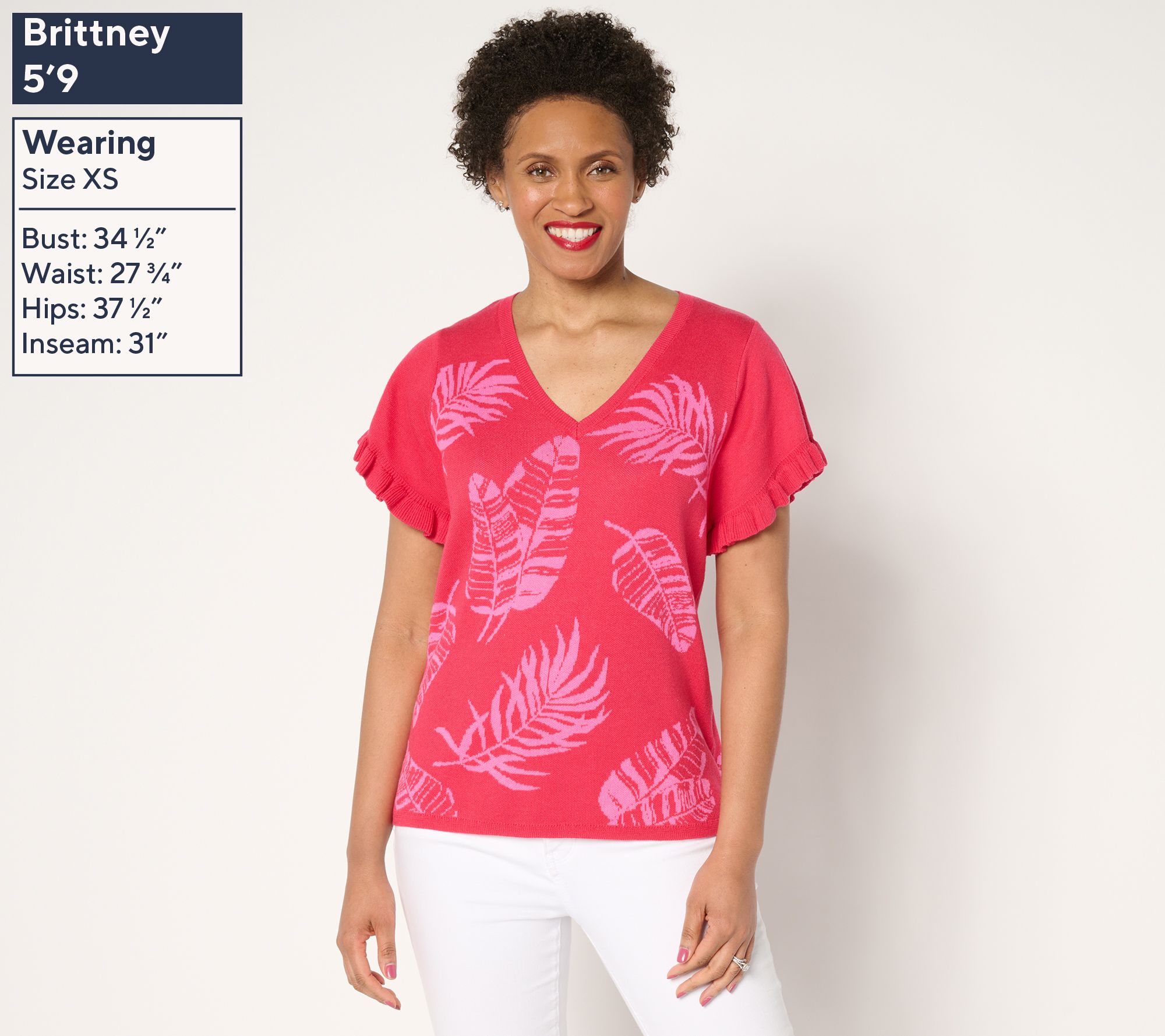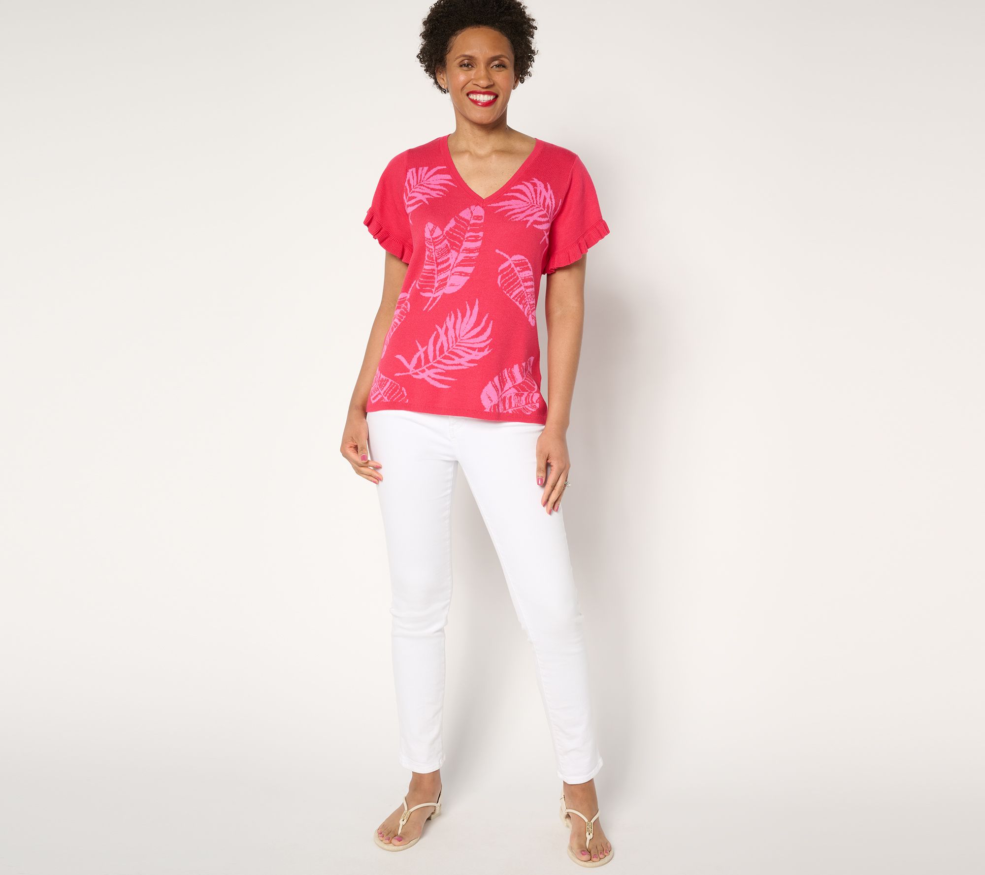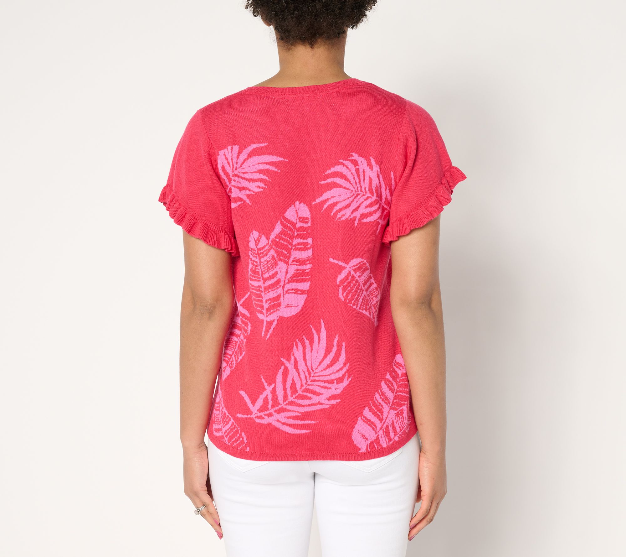 Make a pretty presentation wearing this jacquard sweater, thoughtfully designed with flutter sleeves for an airy, feminine feel. The semi-fitted silhouette pairs easily with your favorite skirts, jeans, or tailored trousers. Ribbing at the neck and hem adds a hint of elevated style that effortlessly transitions from a day at the office to an evening out with friends. From Susan Graver.