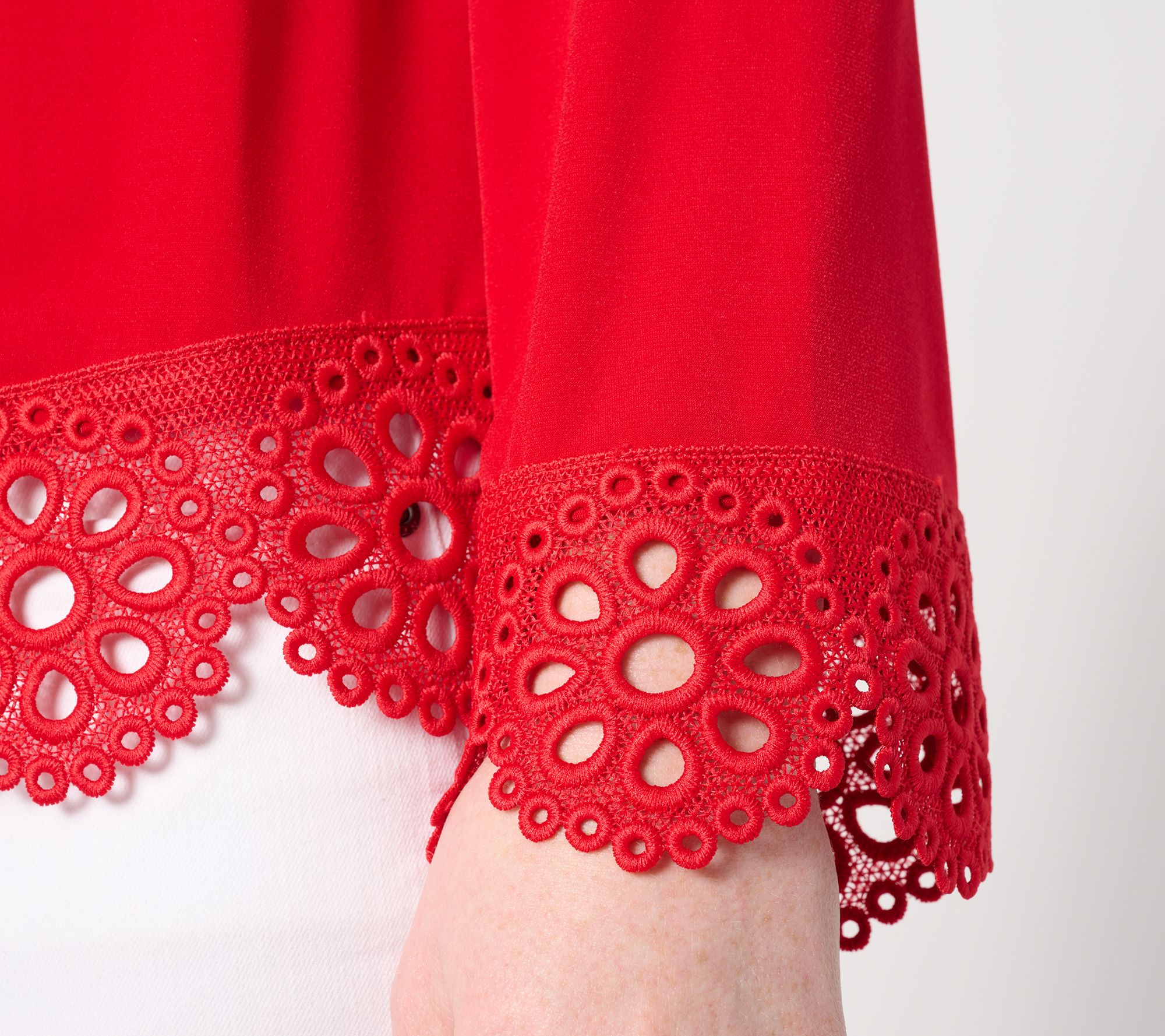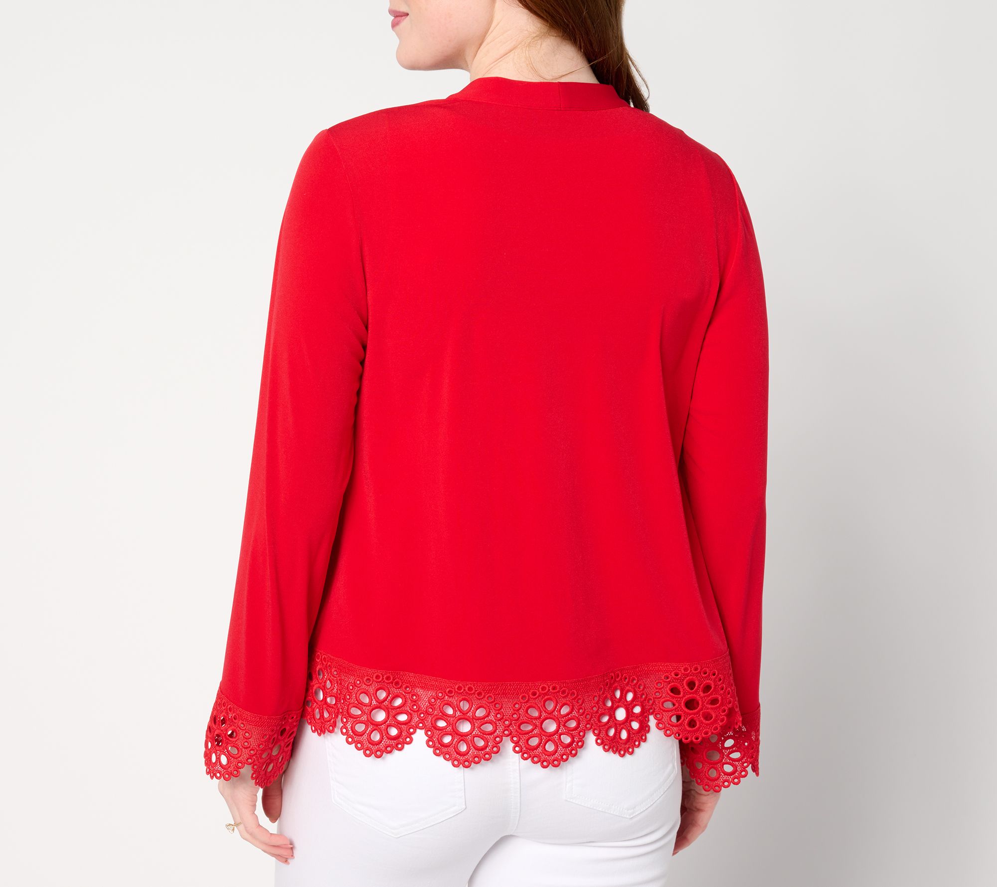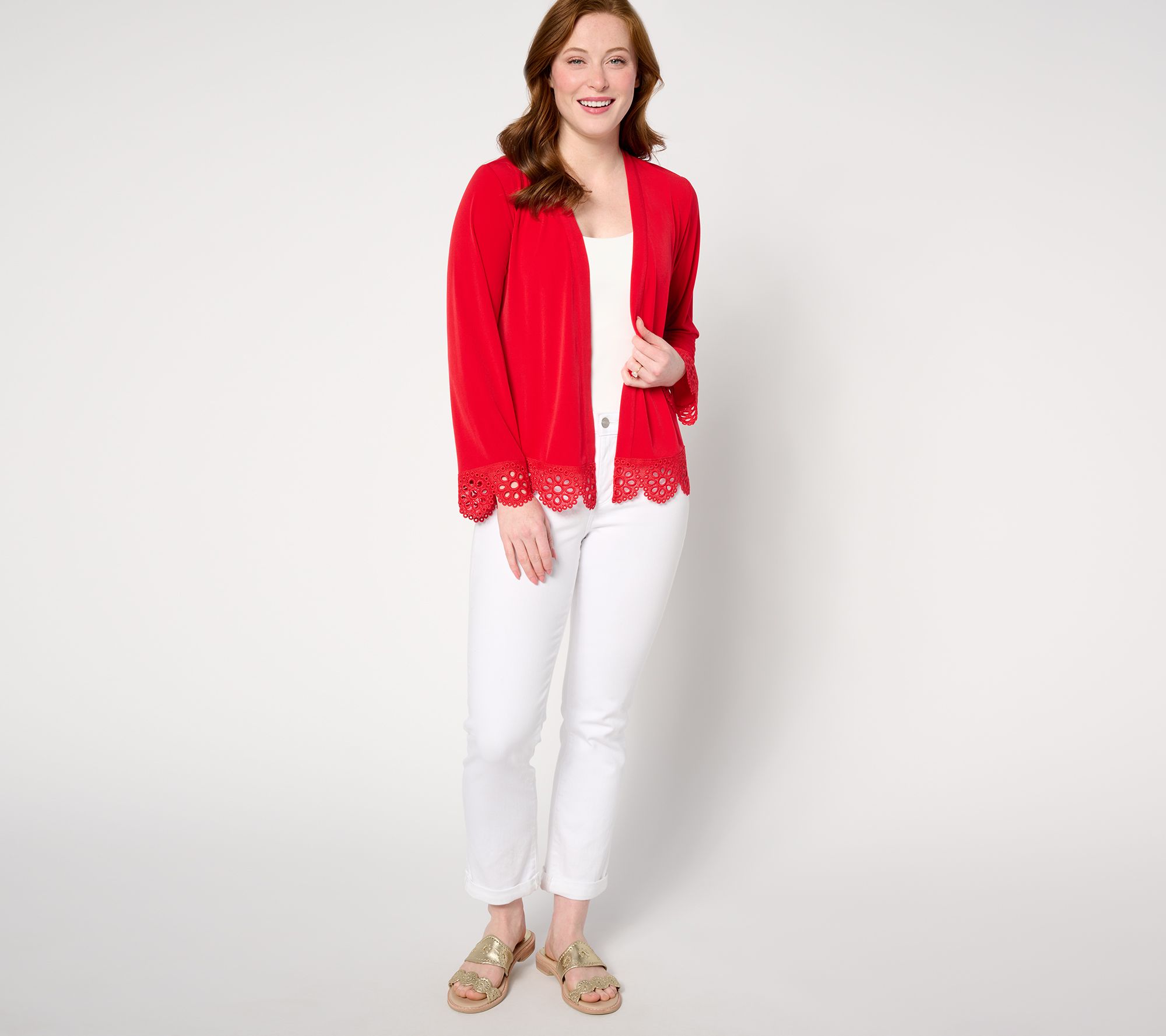 • Features: open front, 3/4-length sleeves, dyed-to-match scallop lace trim, straight bottom hem
