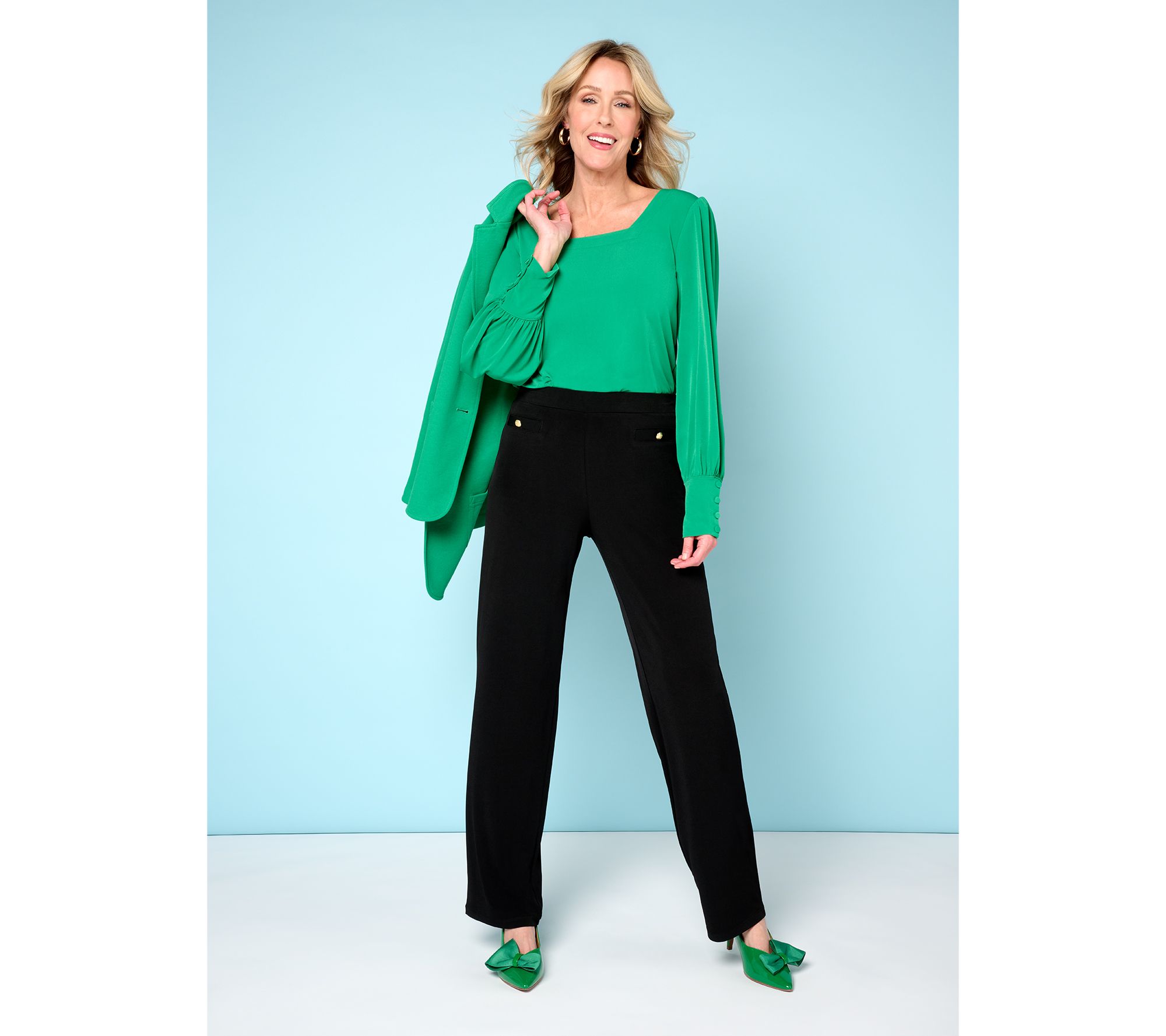 A wonderful addition to your wardrobe options, this Susan Graver top pairs the fabulous feel and fluid drape you love from the luxurious Liquid Knit fabrication with beautiful blouson sleeves accented with standout button cuff details. From Susan Graver.