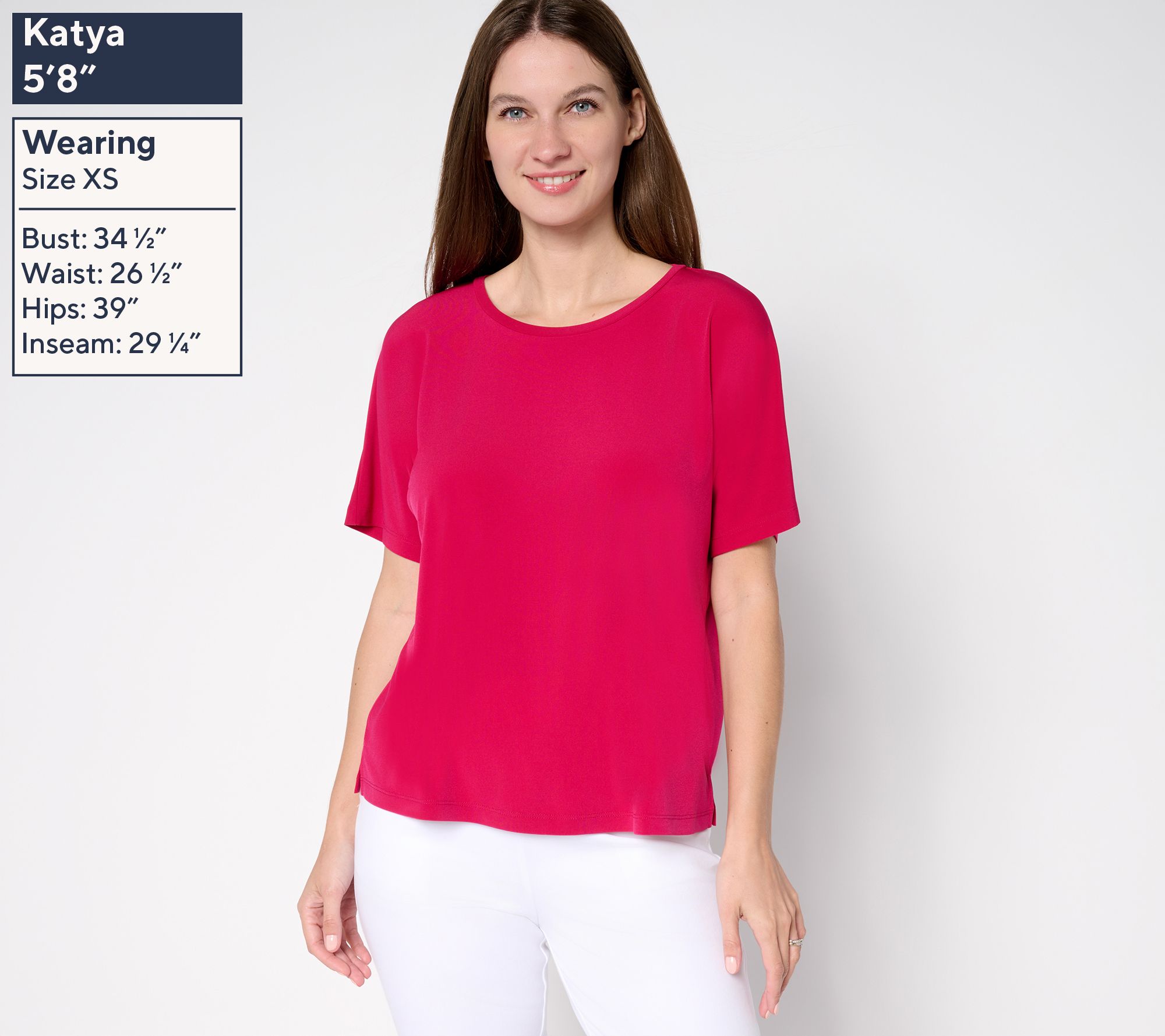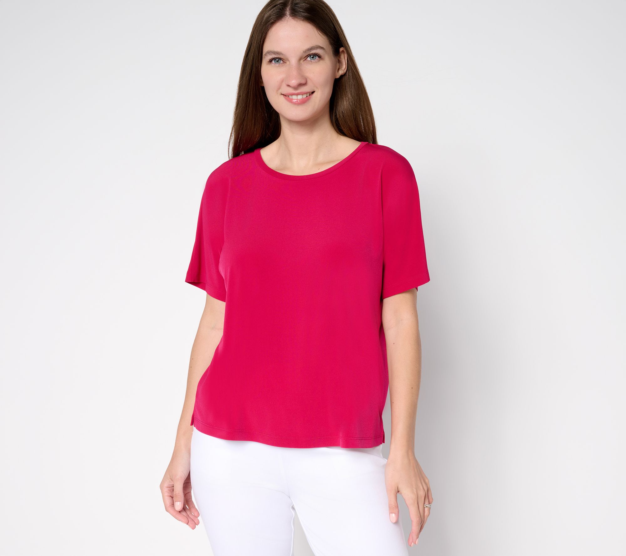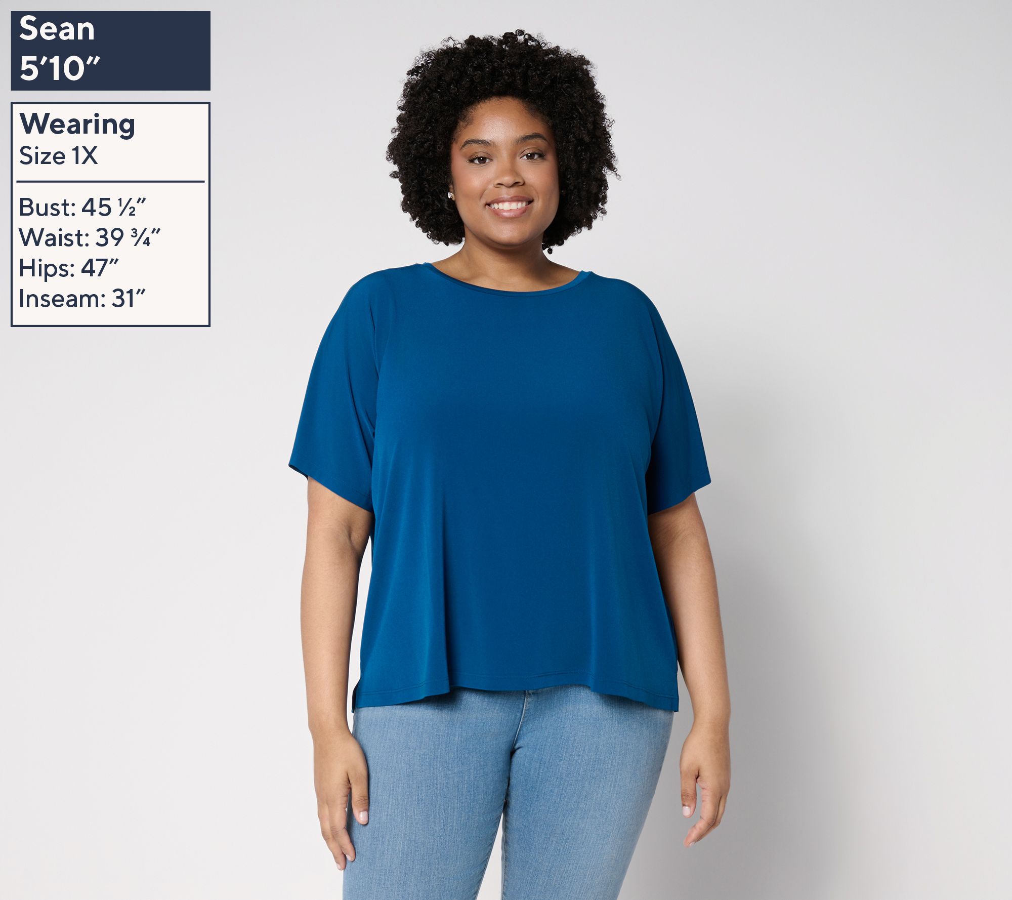 Easygoing days call for style that feels effortless. This dolman-sleeve top slips on comfortably, thanks to the soft Liquid Knit® fabric and relaxed cut, making it a go-to for everything from coffee dates to weekend errands. A jewel neckline and straight hem with subtle side slits add that little something extra, while the slightly shorter length layers beautifully over your favorite denim or skirts. Dress it up with a statement necklace when the occasion calls for carefree confidence. From Susan Graver.