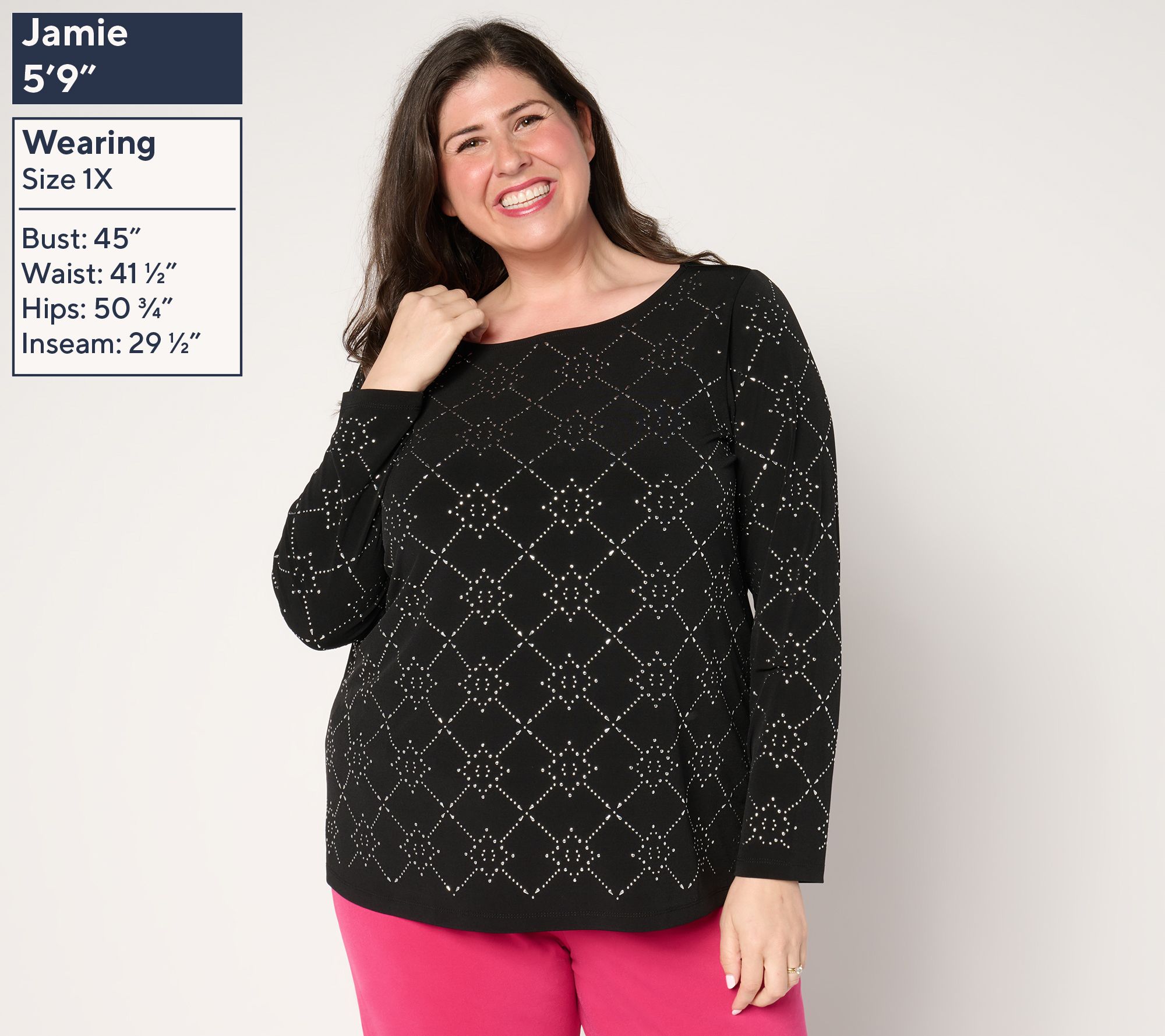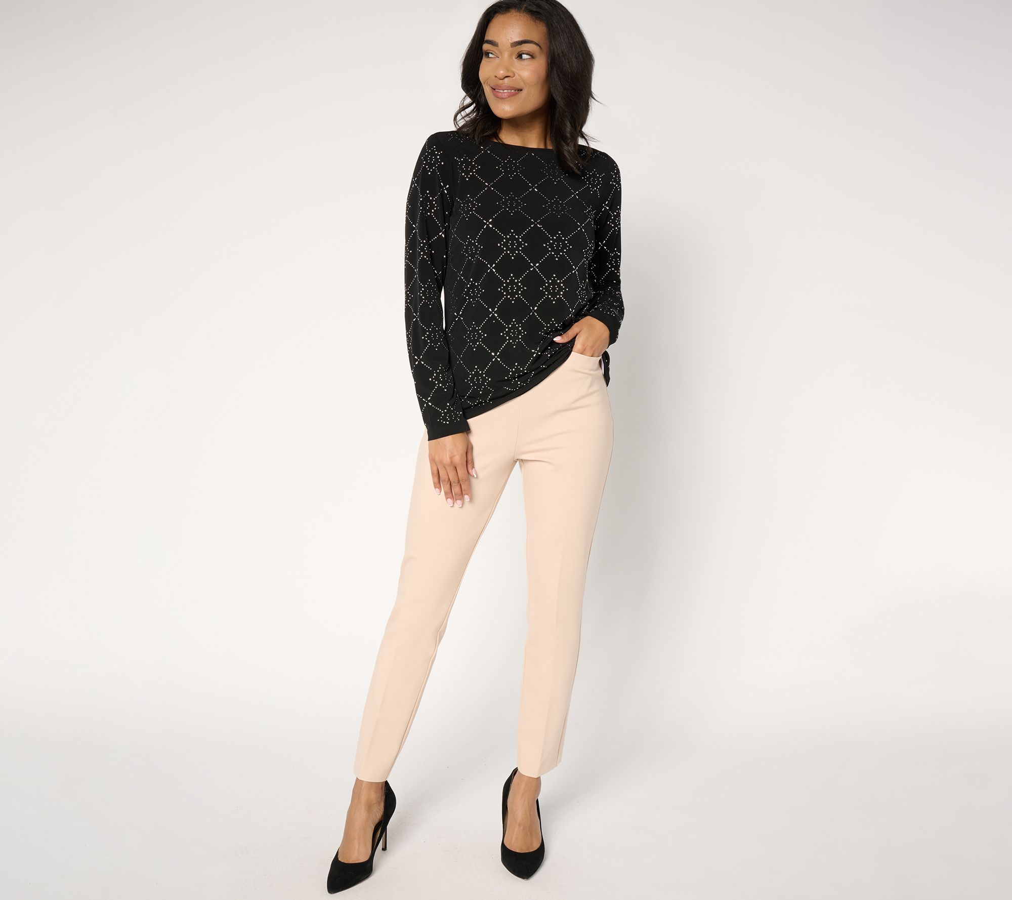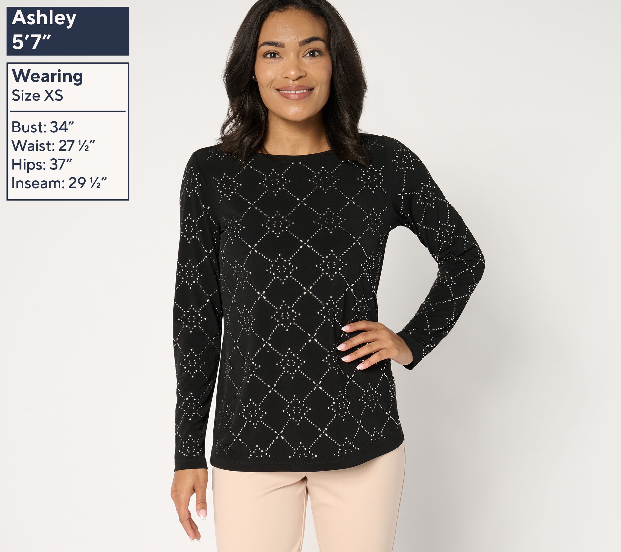 Thought you knew Liquid Knit®? Not like this! This top takes the mega-flattering, feel-good fabric and dresses it up with an intricate embellished pattern, so it feels more elegant than ever. From Susan Graver.