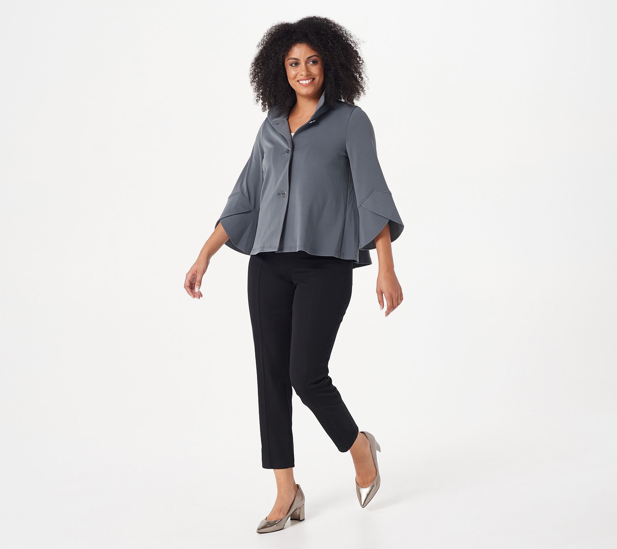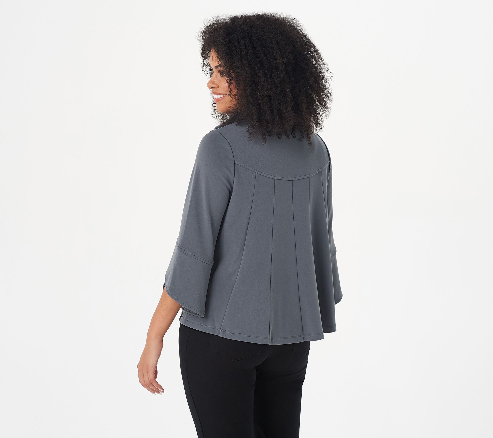 Isn't this the most adorable jacket ever? With Liquid Knit® fabrication for a fluid feel and those flounced 3/4-length sleeves for effortless style, this is a must-have piece. From Susan Graver.
