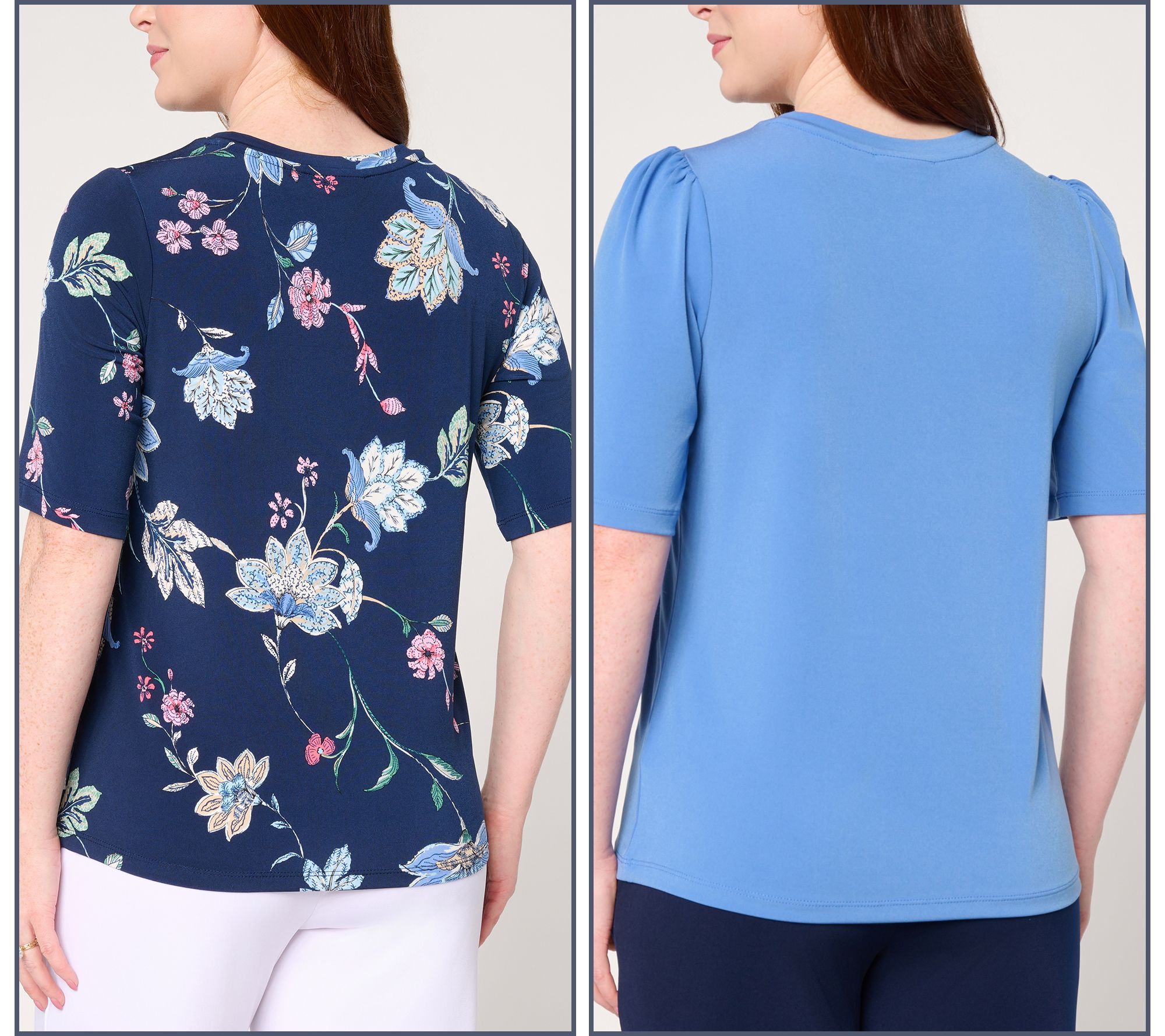 Why fall in love with one when two is twice as nice? Broaden your wardrobe options with this set of two Liquid Knit® tops from Susan Graver. One features a bold print while the other offers a sleek solid-color look with puff sleeves, both with eye-catching chain trim at the neckline. Pair them with weekend denim or daily workwear -- and choose your mood. From Susan Graver.