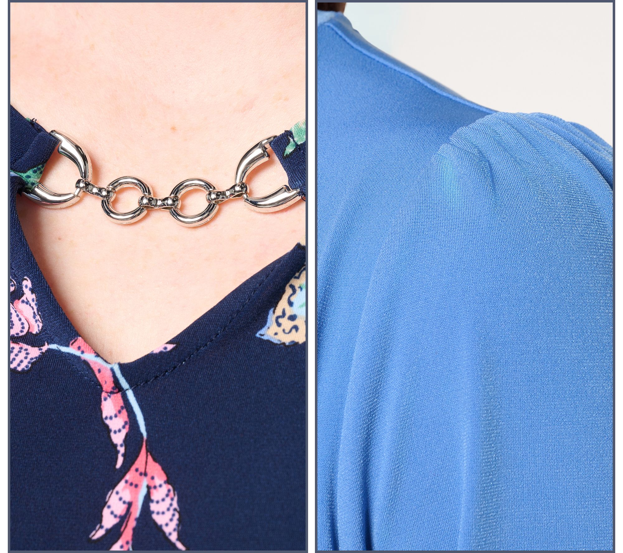 • Features: pullover style; novelty chain detail in silvertone or goldtone at front neckline; V-cutout at neckline; solid-color top has puff elbow-length sleeves; printed top has regular elbow-length sleeves