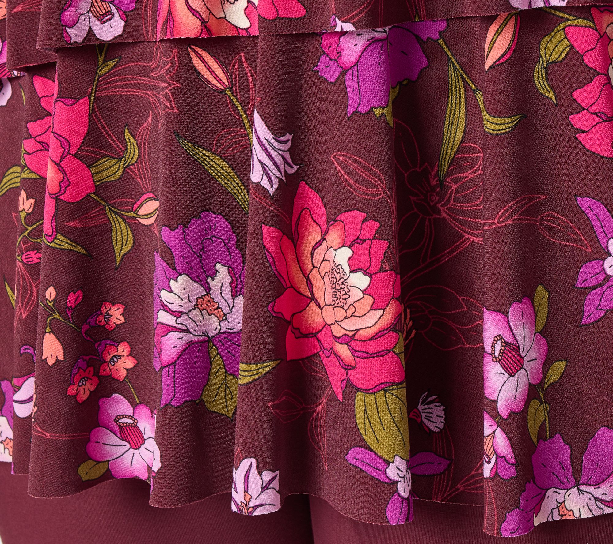• Features: solid or printed, scoop neck, 3/4-length sleeves, tiered design