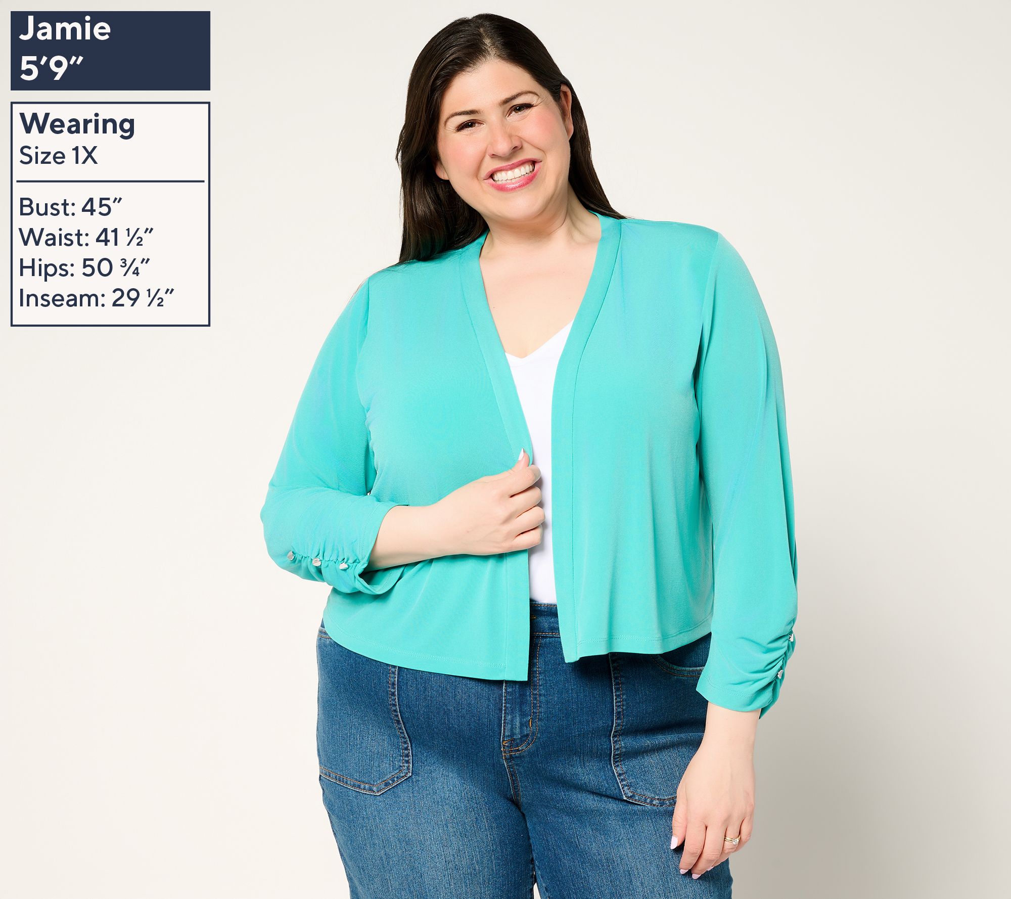 • Features: 3/4-length sleeves with shirring and non-functional buttons, open front style