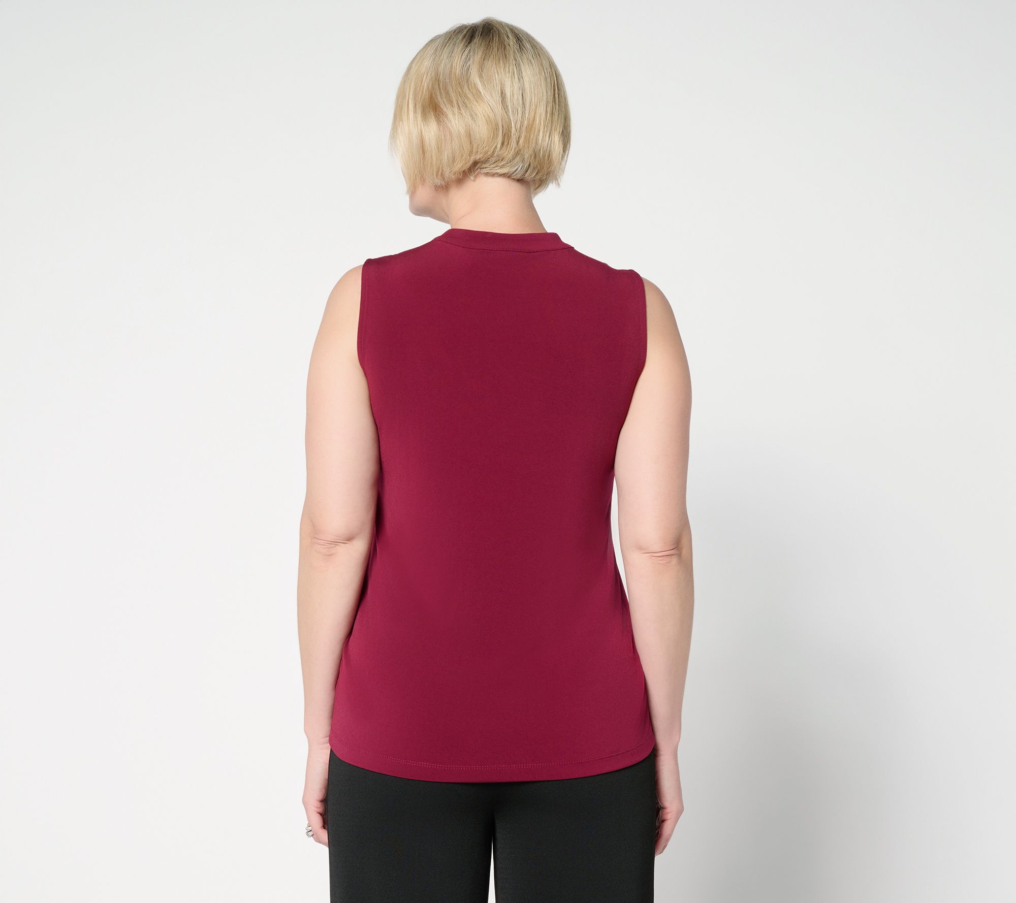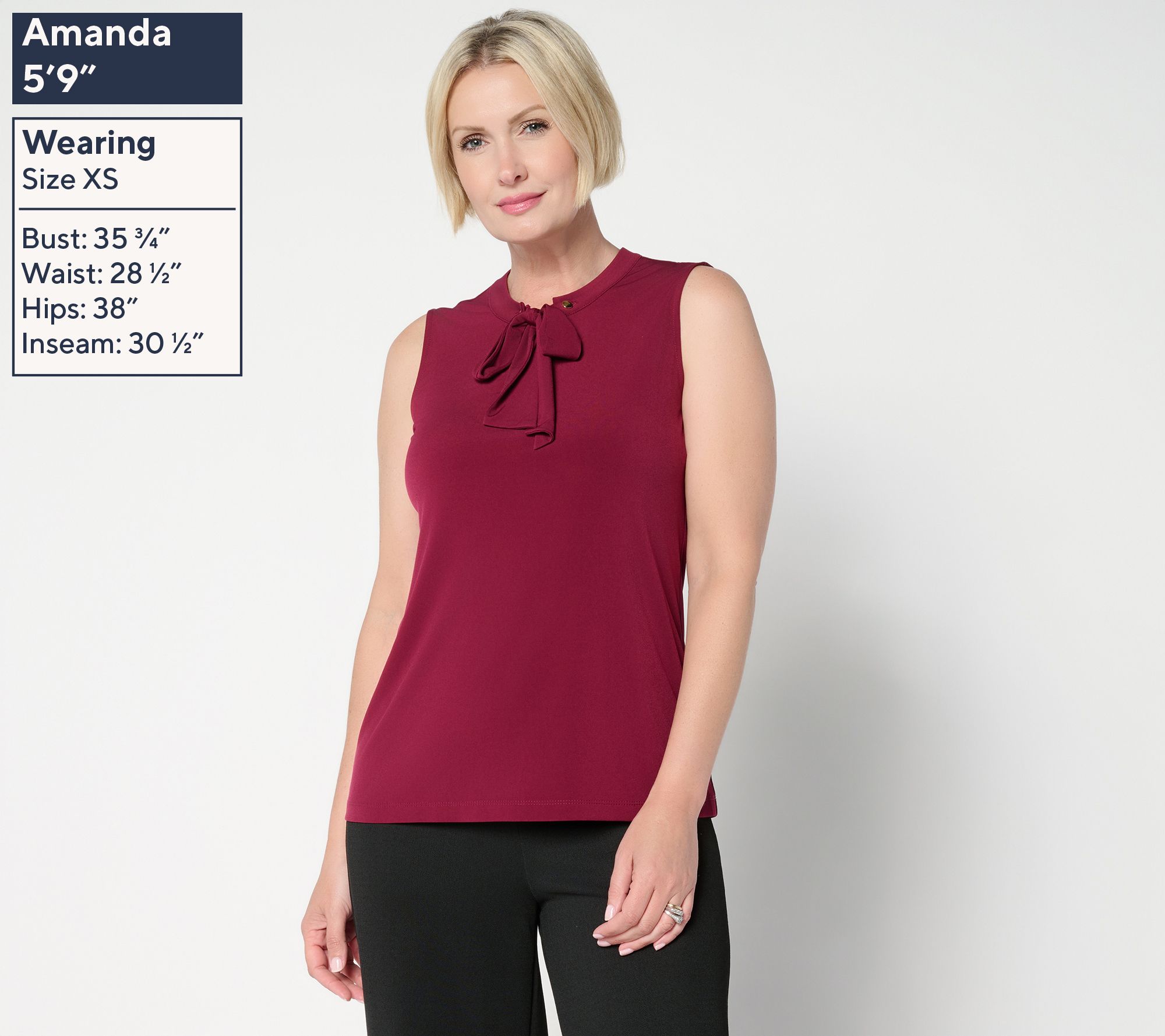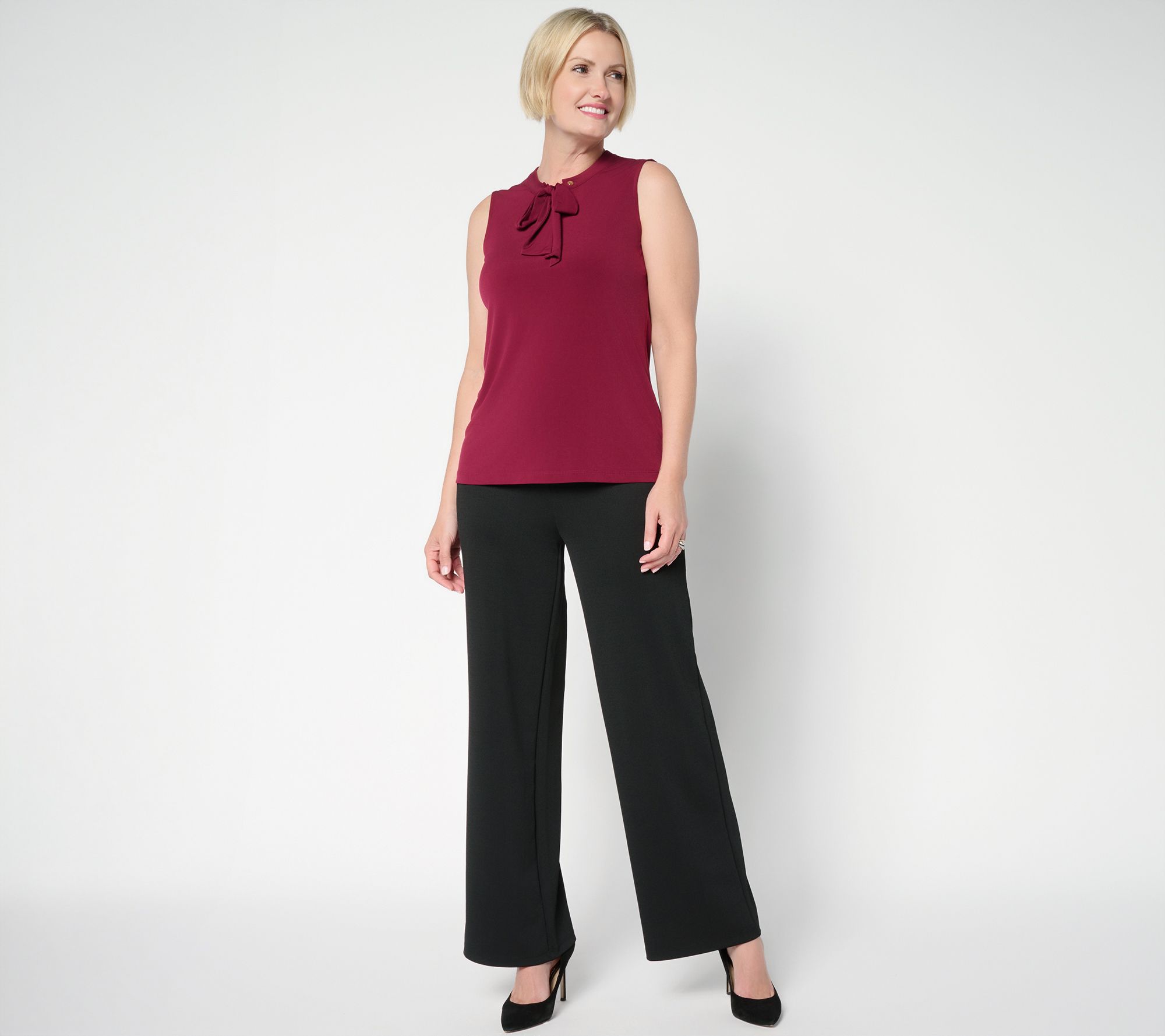 Put a bow on it. Polish off your OOTD with this sleeveless Liquid Knit® top that features soft front ties you can style knotted, in a sweet bow, or leave loose. It's the ideal complement to skirts and trousers, or pair with a blazer or cardi for a more profesh look. From Susan Graver.