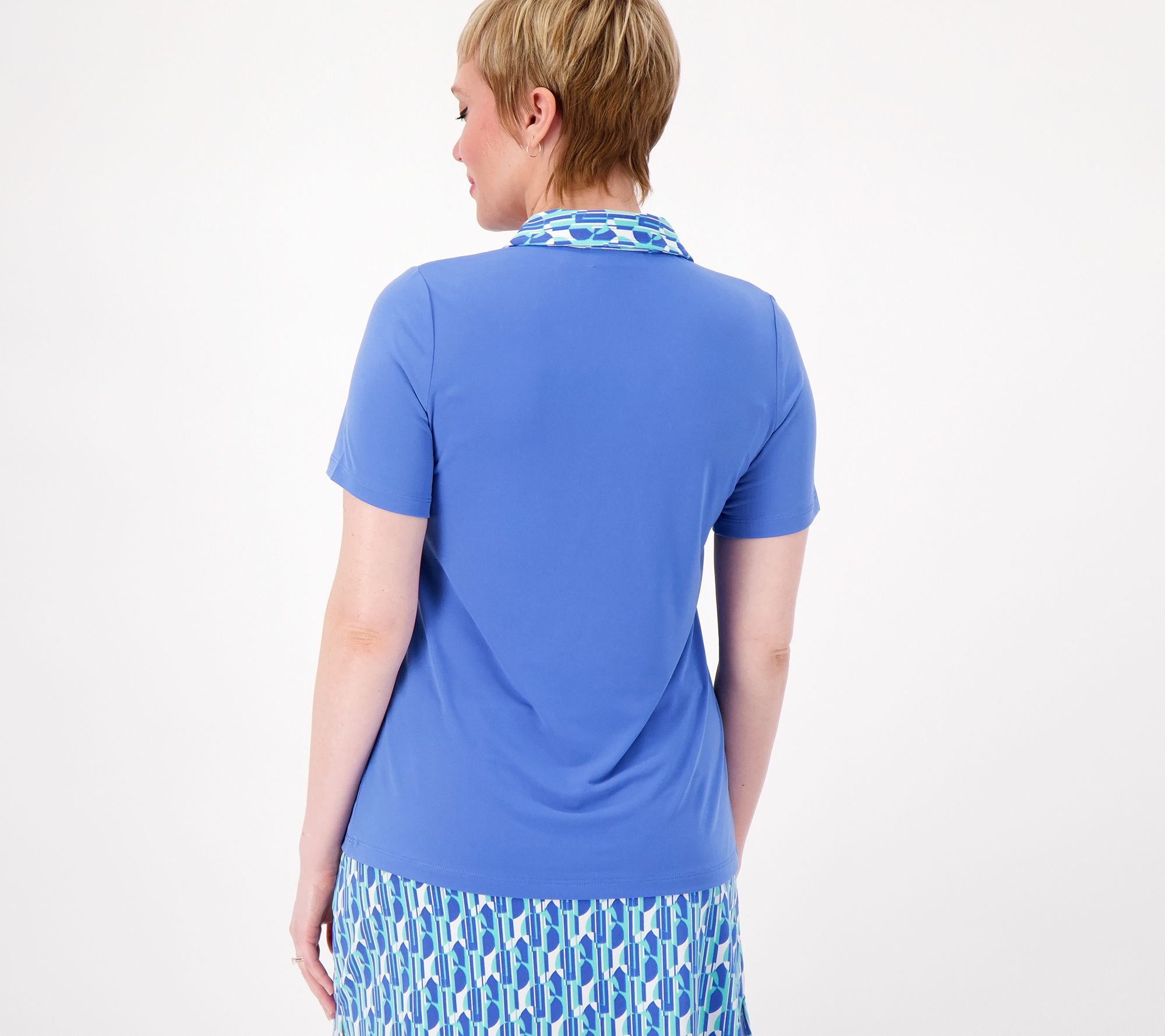 "As Is" Susan Graver Liquid Knit Split Neck Collared Top w/ Printed Combo