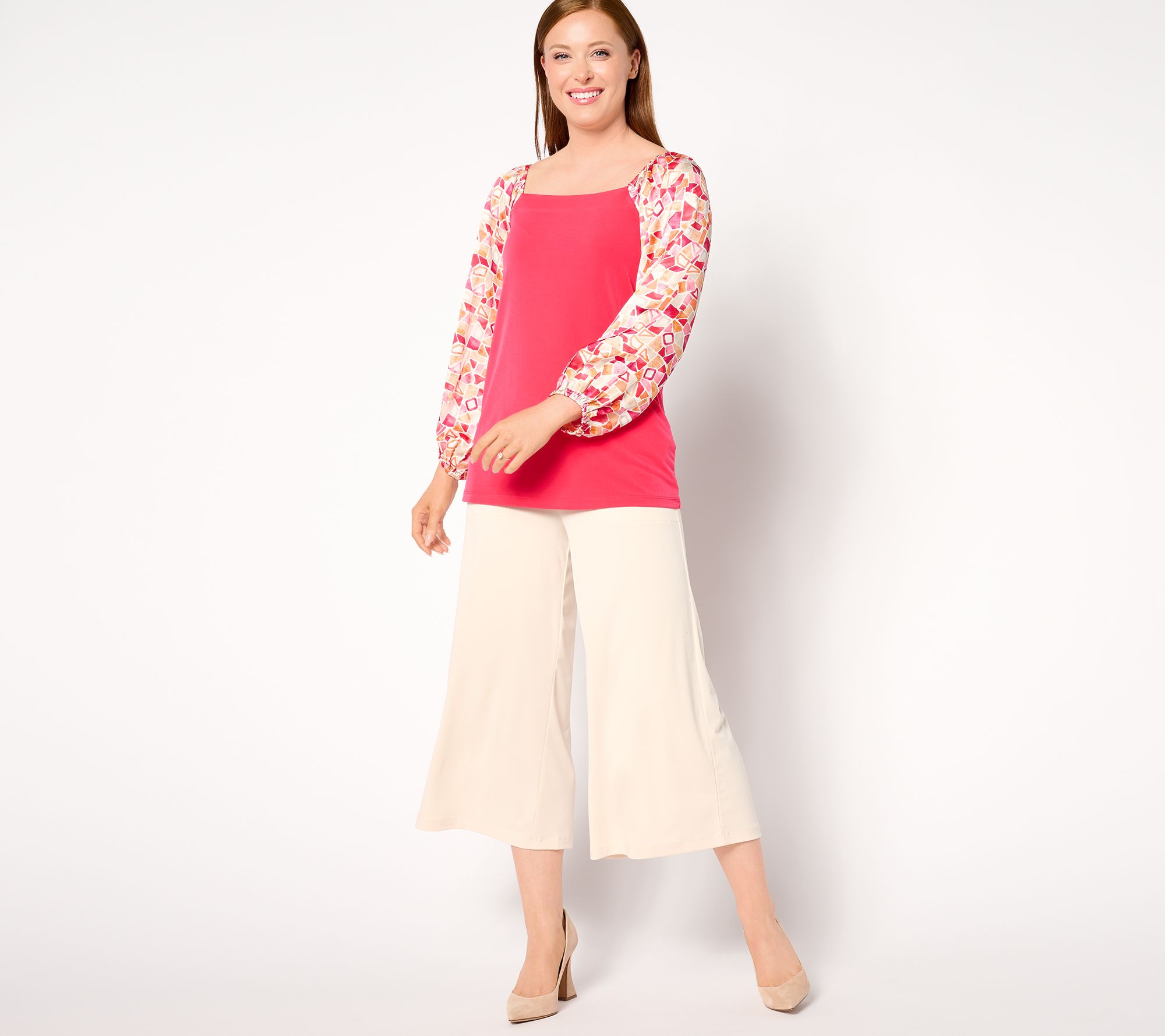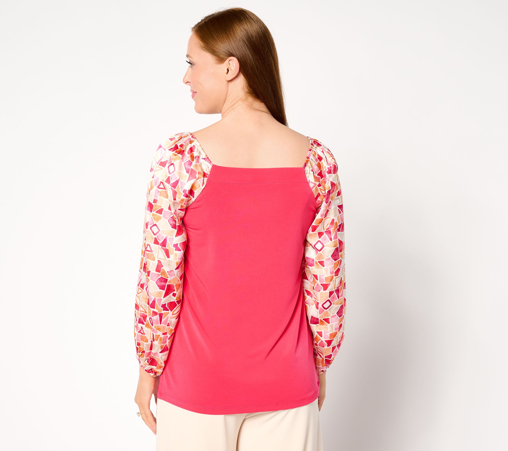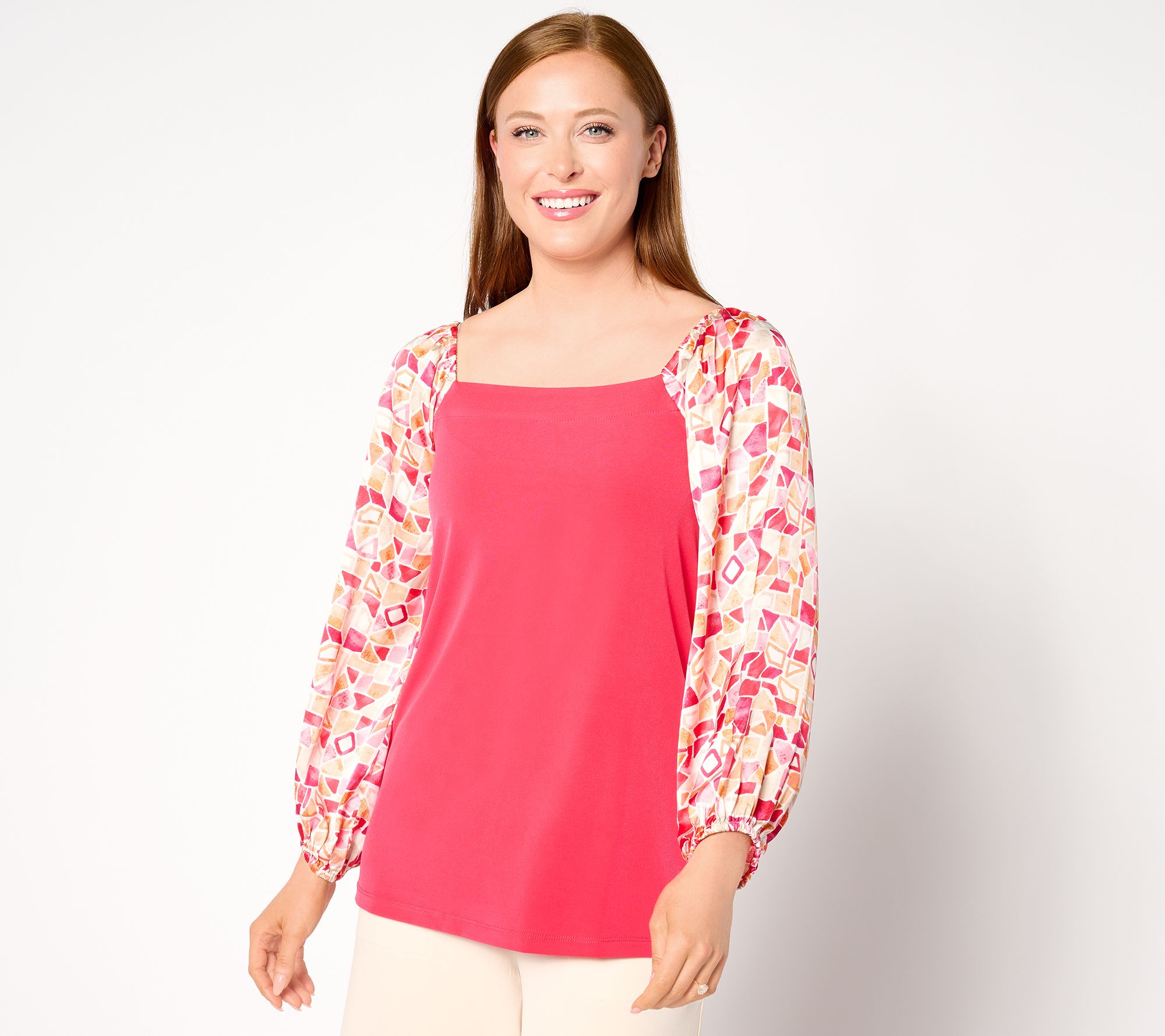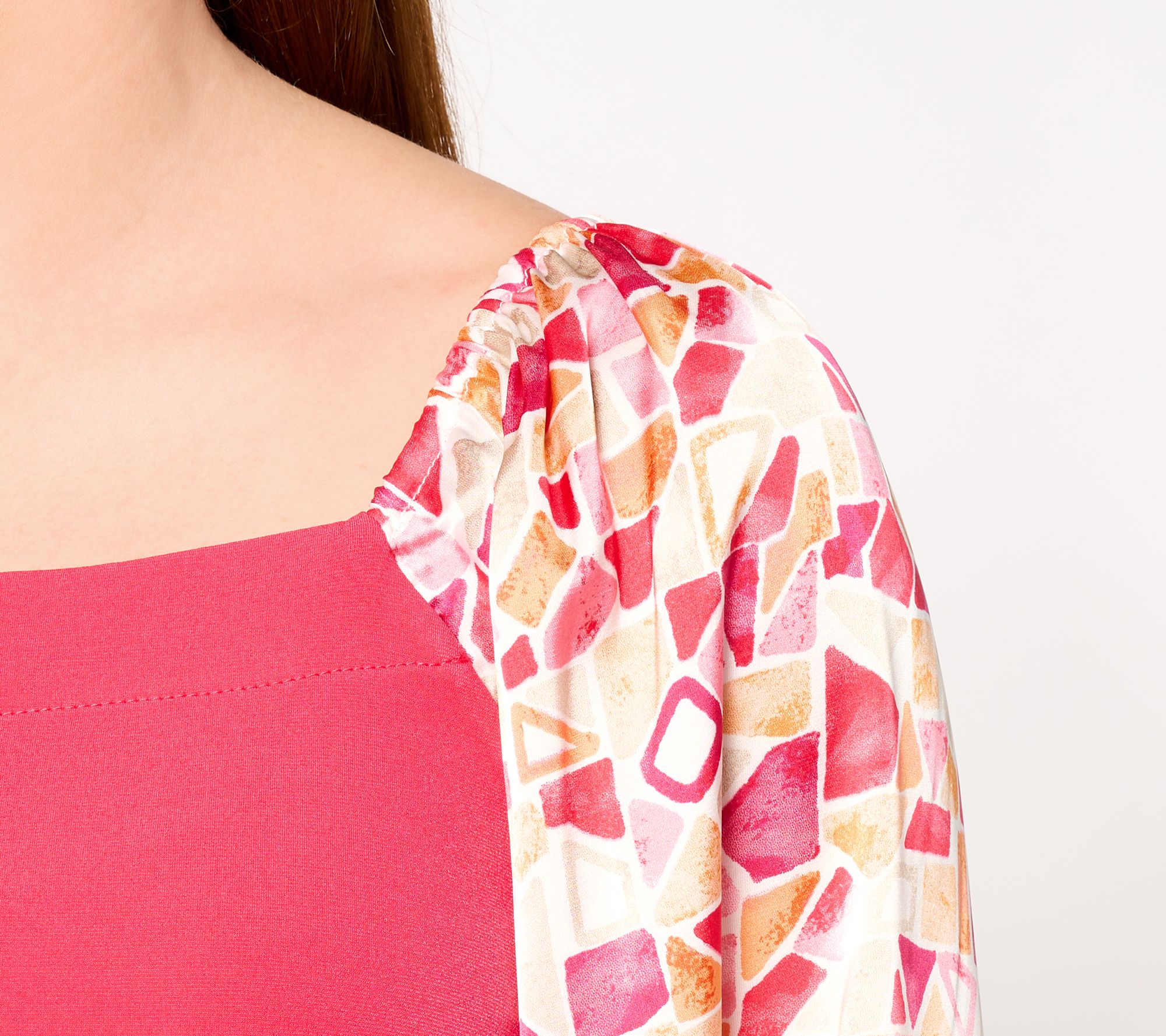 Points for personality! The fluid Liquid Knit fabric of this A-line top makes it a flattering choice, while printed sleeves make it a distinctive choice. From Susan Graver.