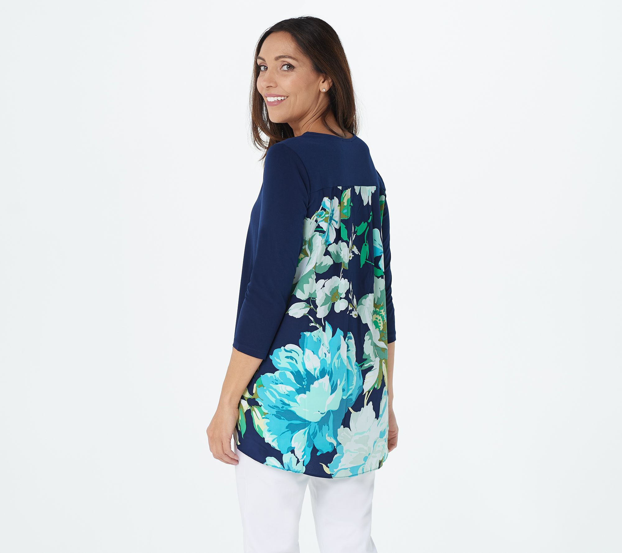 • Features: circle neckline, 3/4-length sleeves, solid front, printed back, tunic length