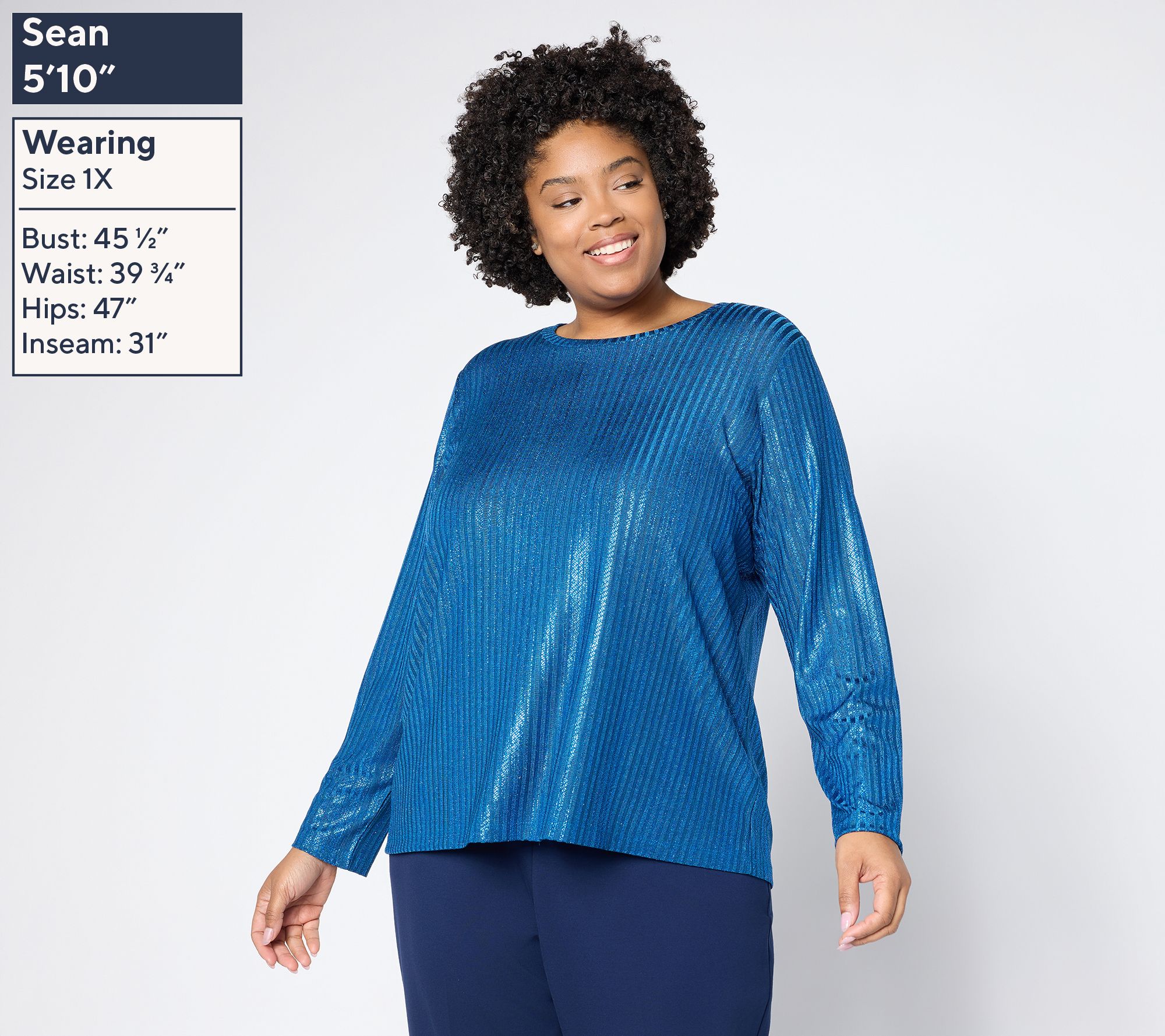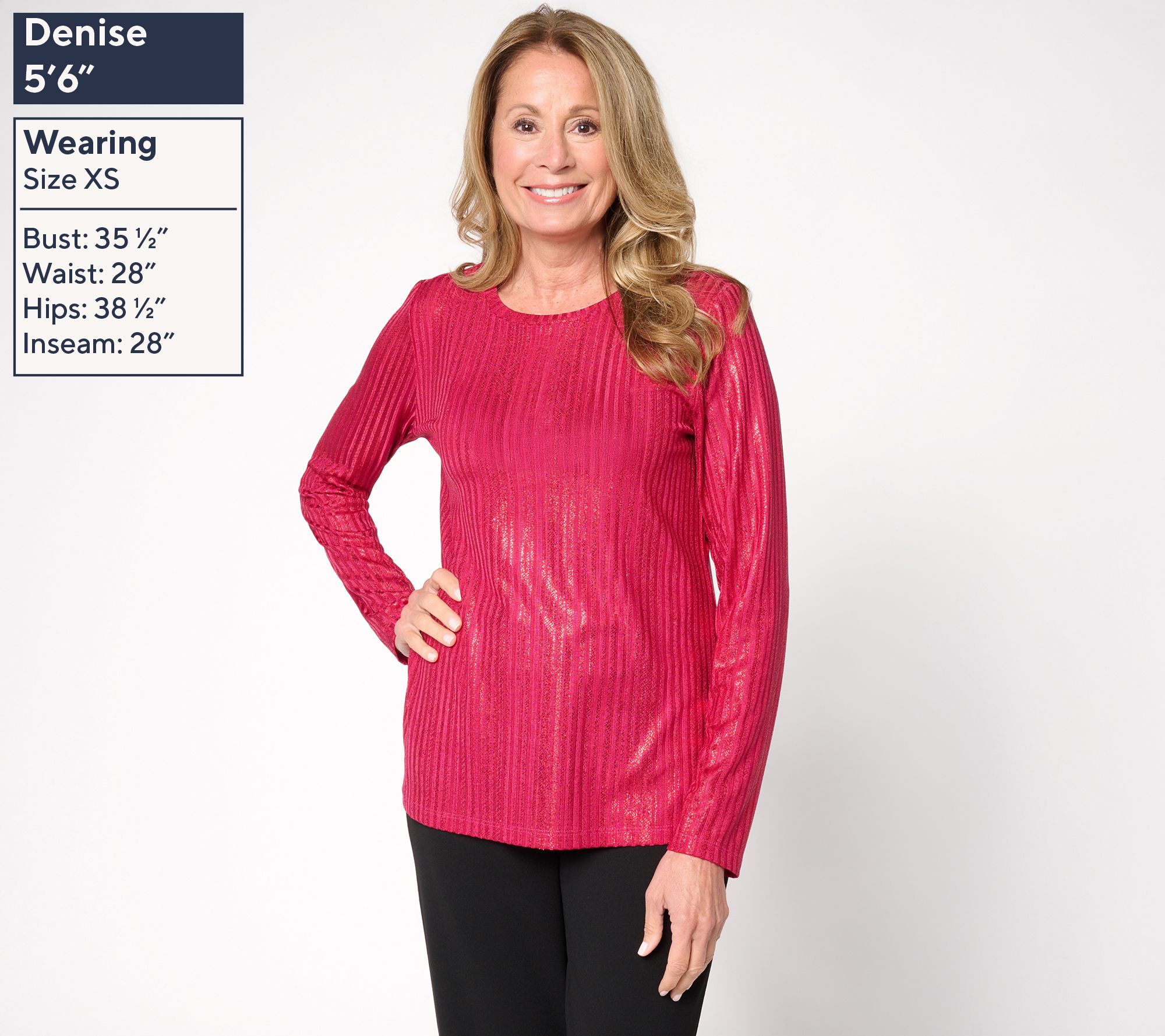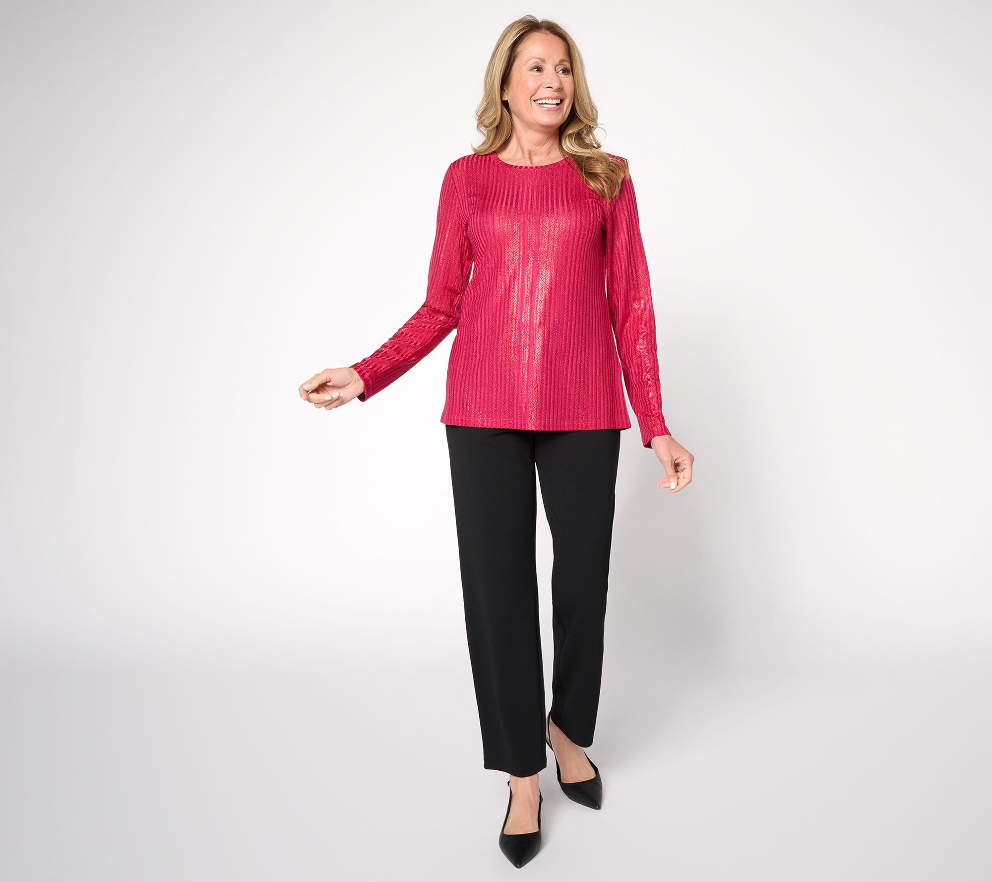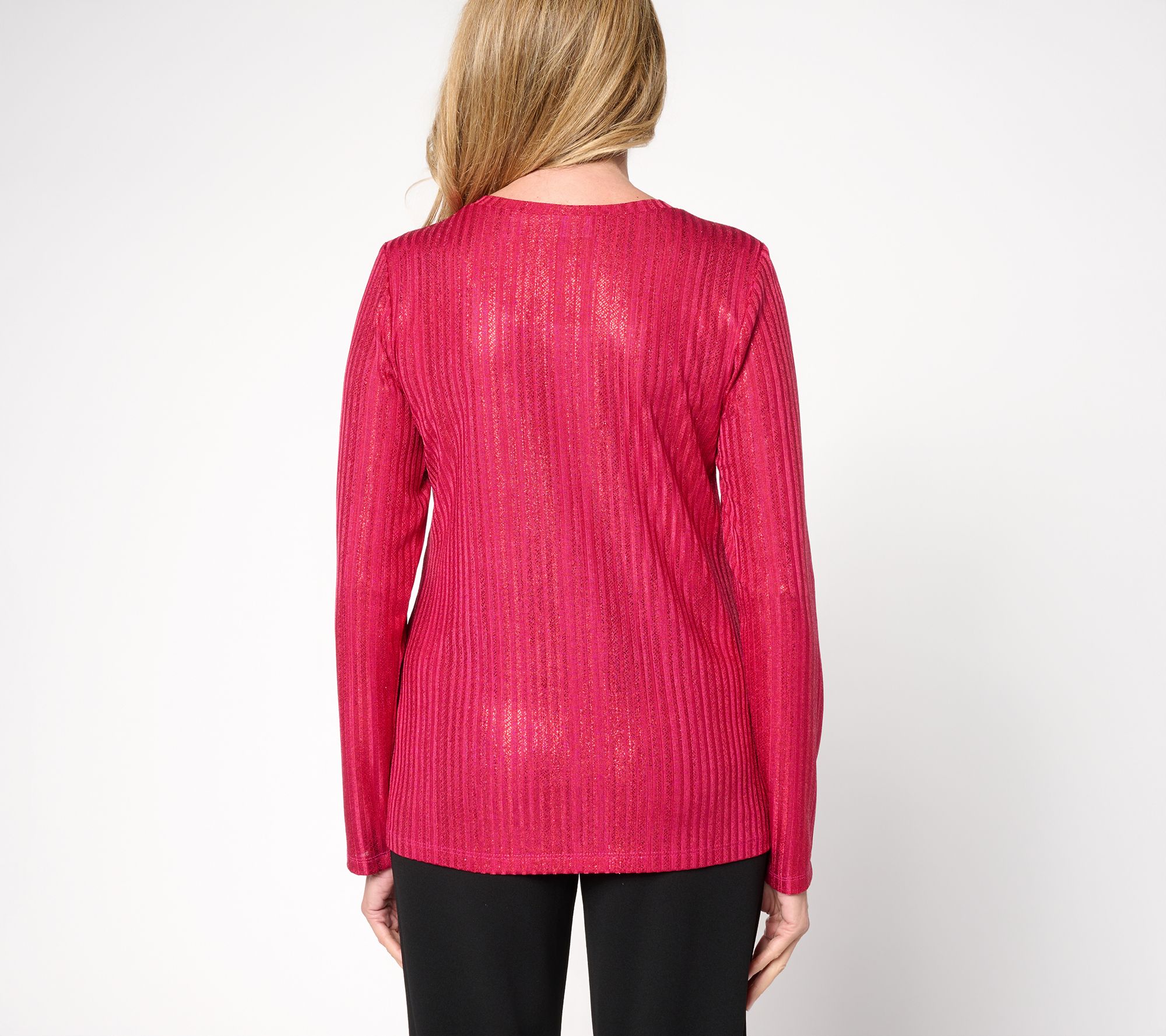 Susan Graver's crewneck top definitely outshines the rest. Its ribbed texture and shot of shimmer creates the dress up moment you deserve. A sprinkle of stretch keeps you comfortable and moving from one event to the next. From Susan Graver.