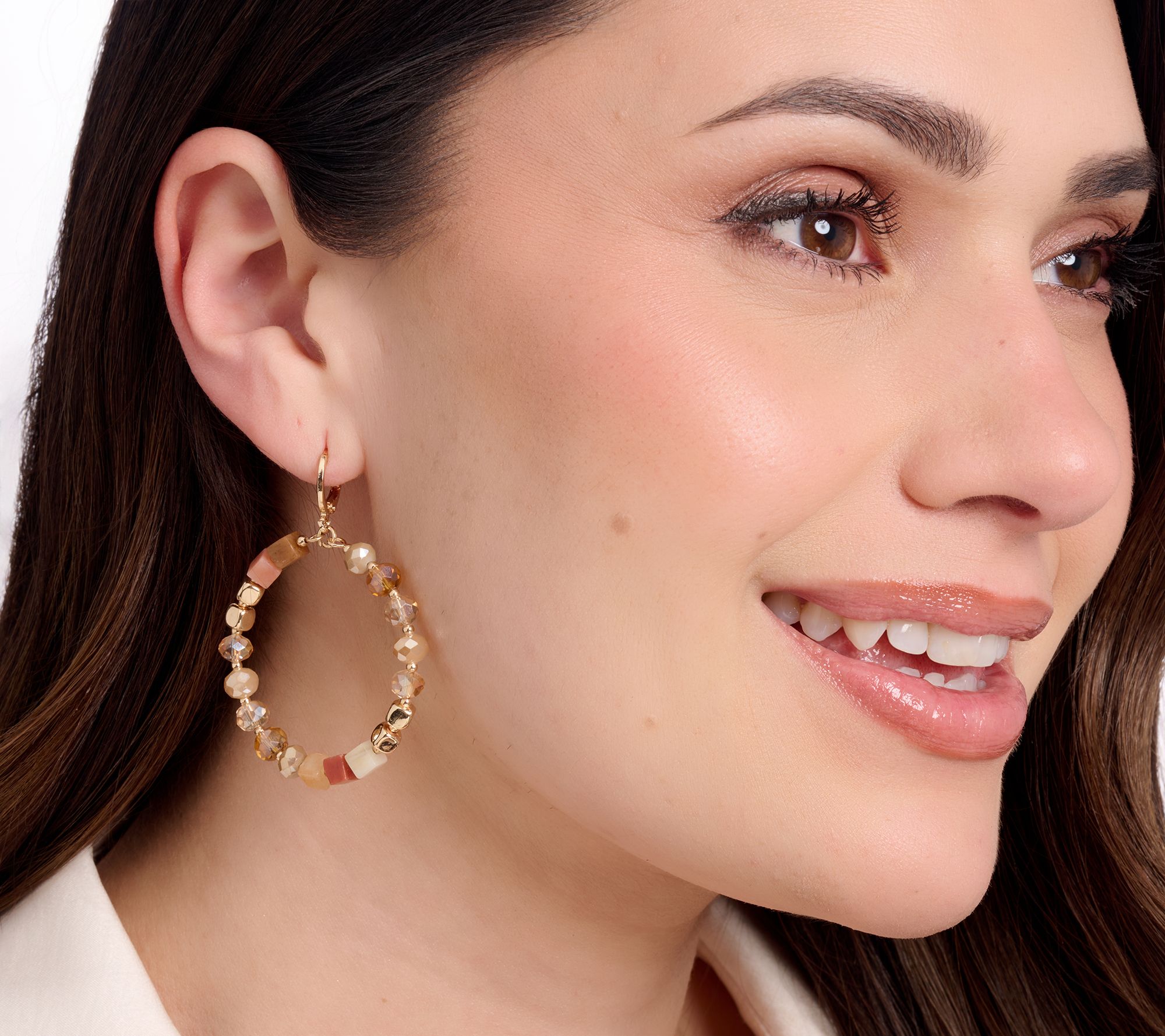 • Hoop design; mixed media materials including goldtone beads, faceted glass oval beads, and acrylic cube beads; sculpted detailing
