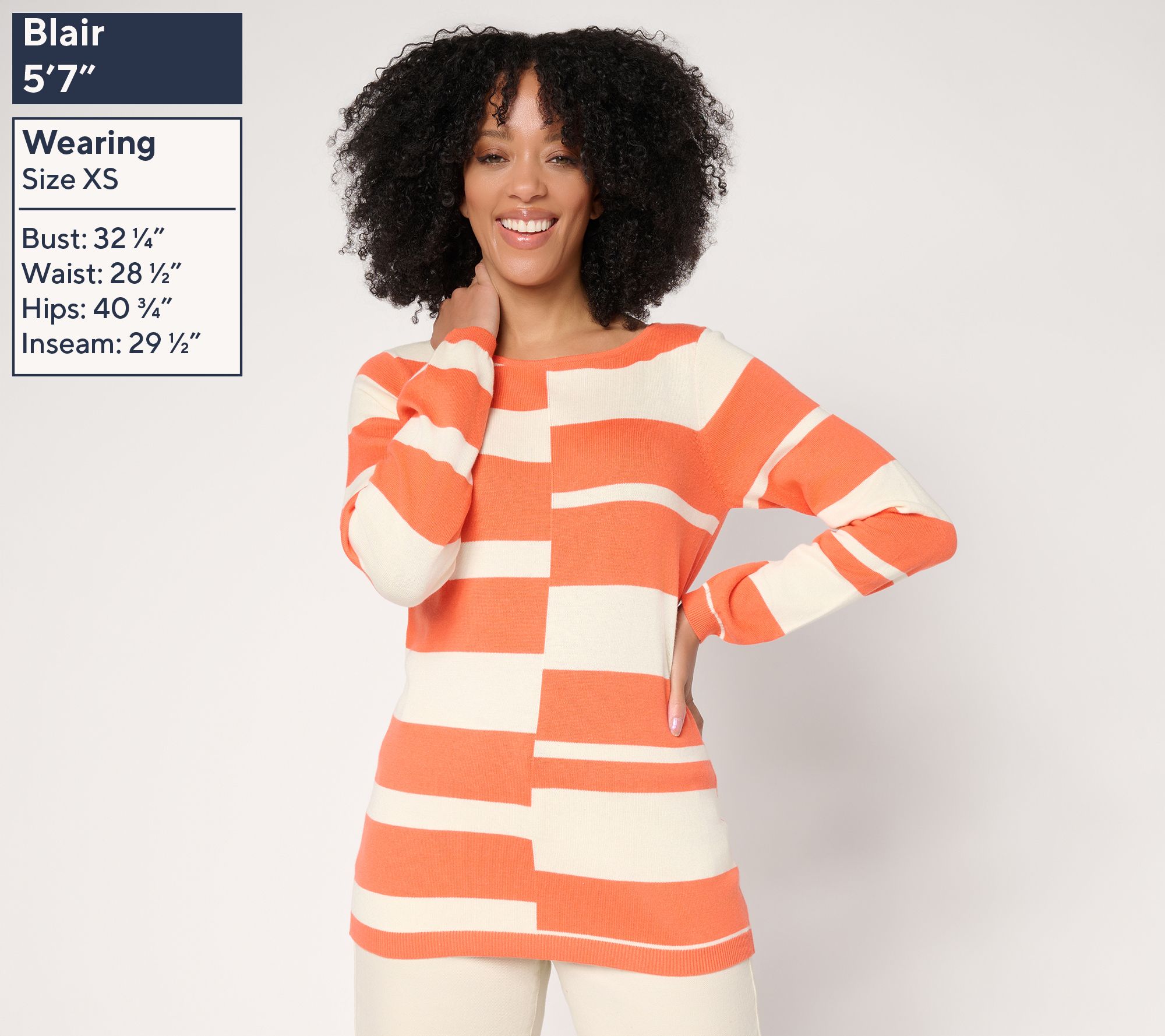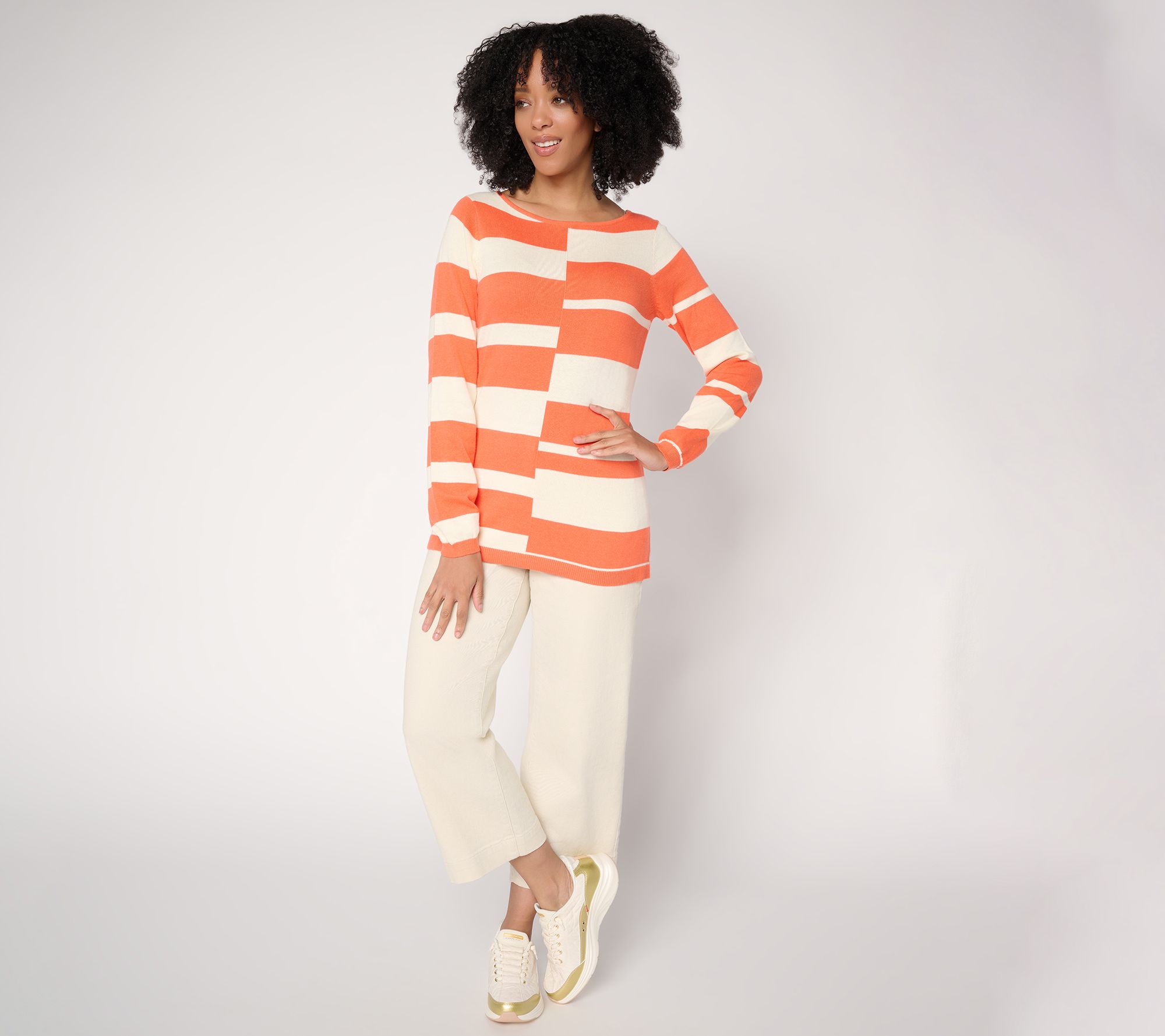 Whether brunching with friends or strolling through the park, this striped intarsia sweater adds charm to any outing. The bateau neckline and sleek silhouette create an effortlessly flattering shape, while soft cotton-rayon yarn keeps you cozy all day. From Susan Graver.