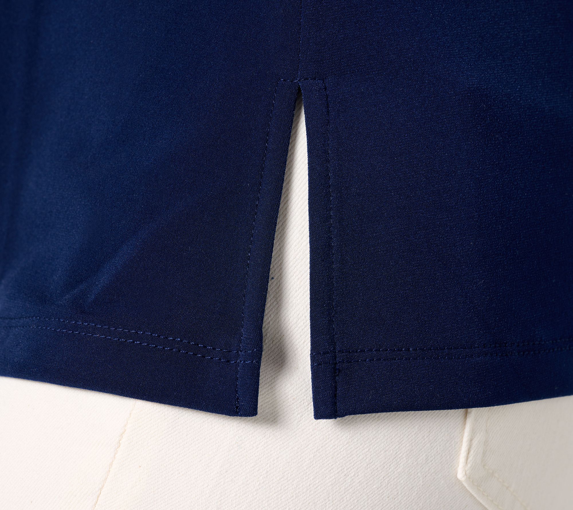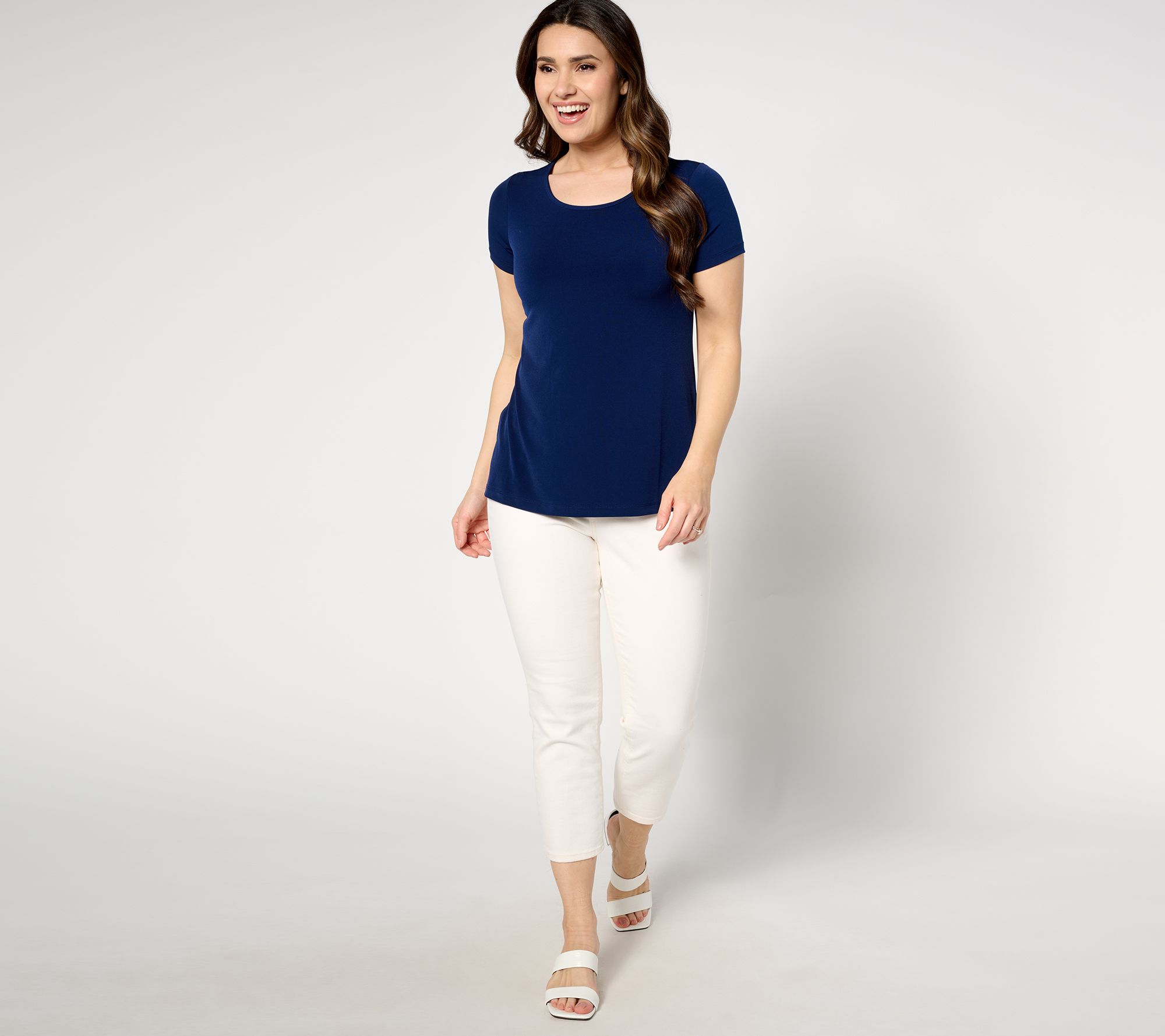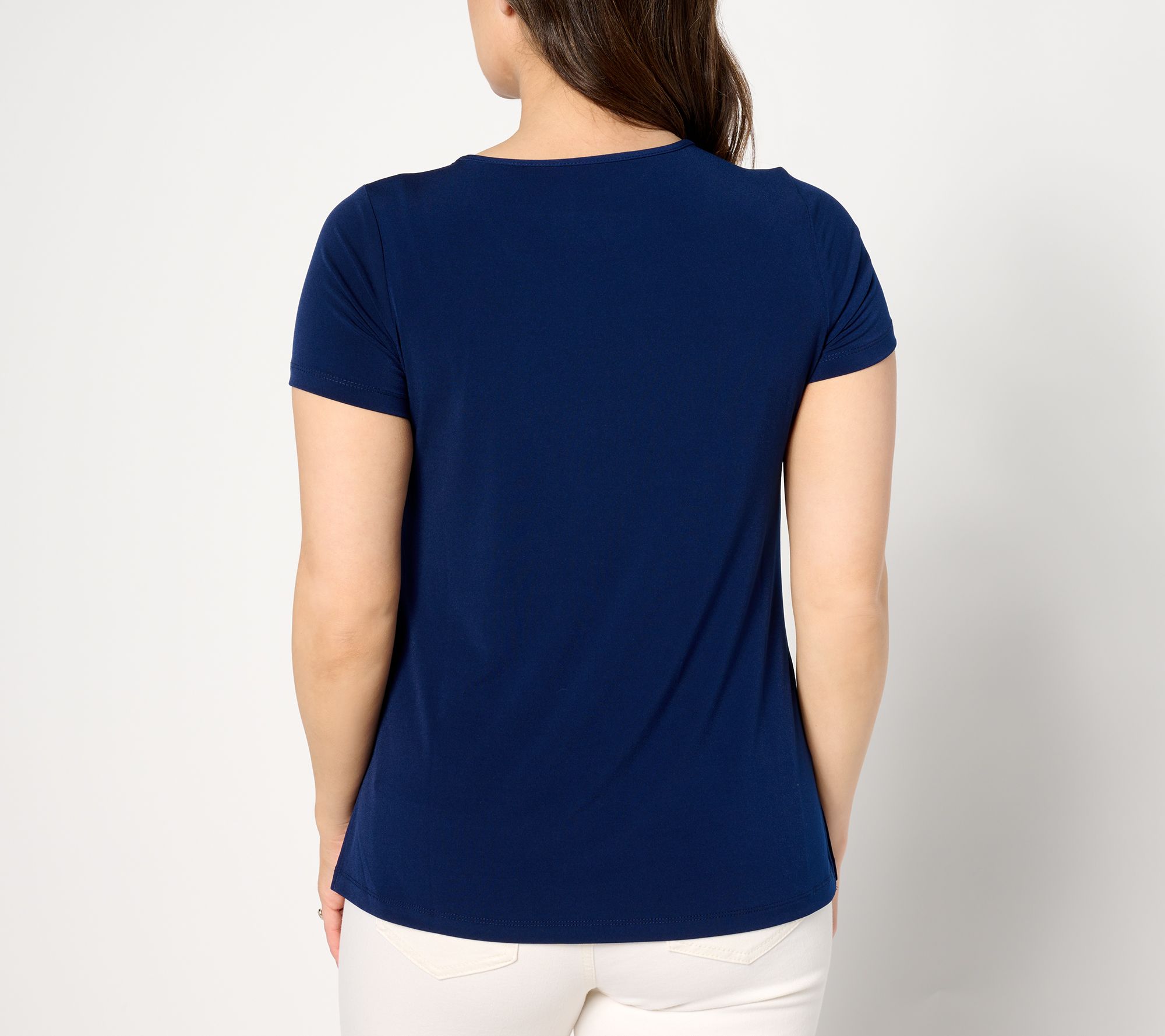 When a cotton tee feels too caszh, reach for this polished Liquid Knit® top to level up your look. Like it a little roomy, too? The A-line shape won't suction to your silhouette. So much ahhhh! From Susan Graver.