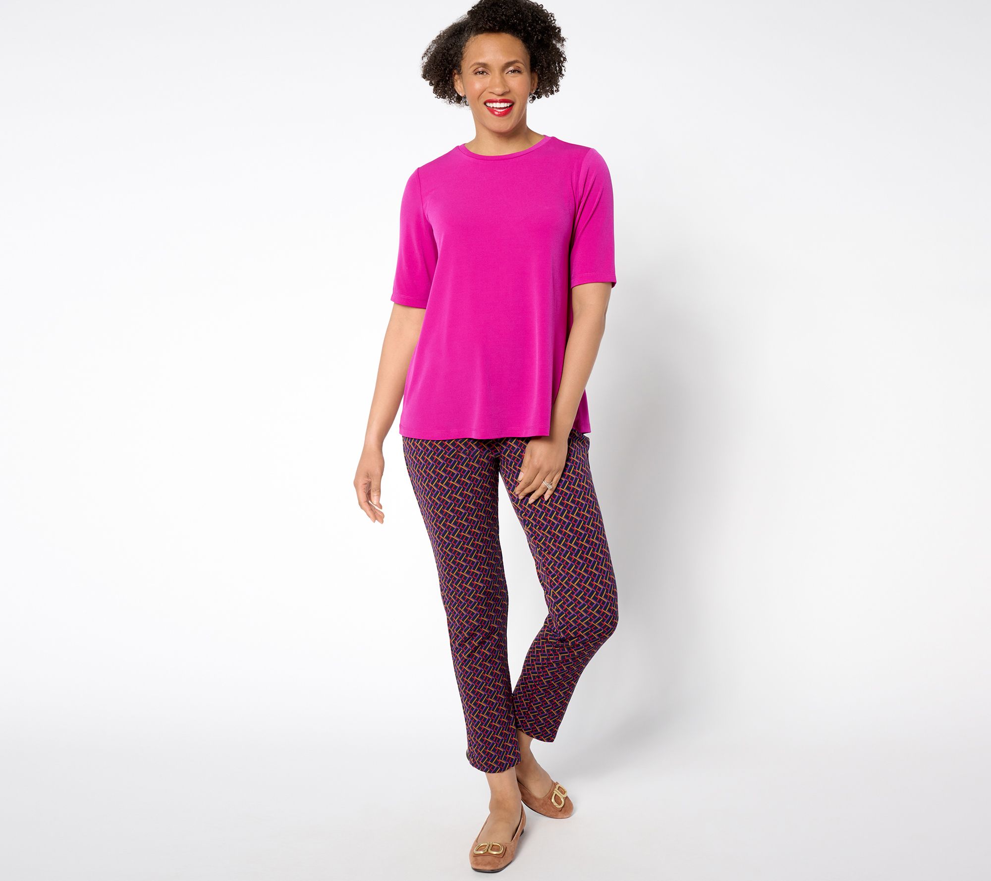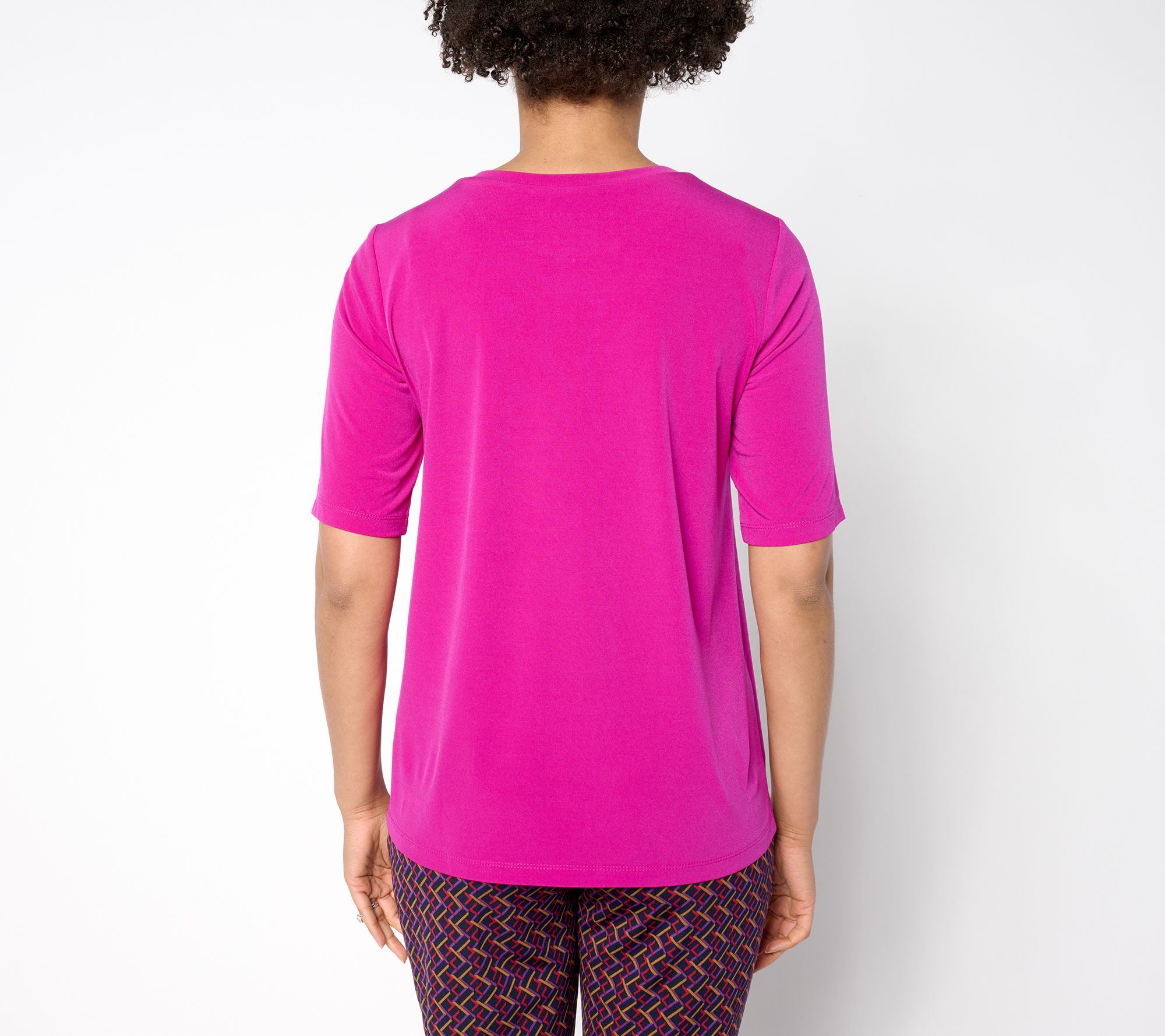 This classic crew-neck top is a must-have for any stylish woman. The Liquid Knit fabrication skims the body and provides a smooth feel, while the elbow-length sleeves are oh-so flattering, From Susan Graver.