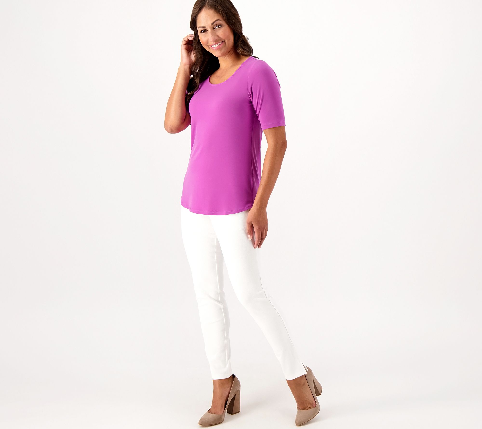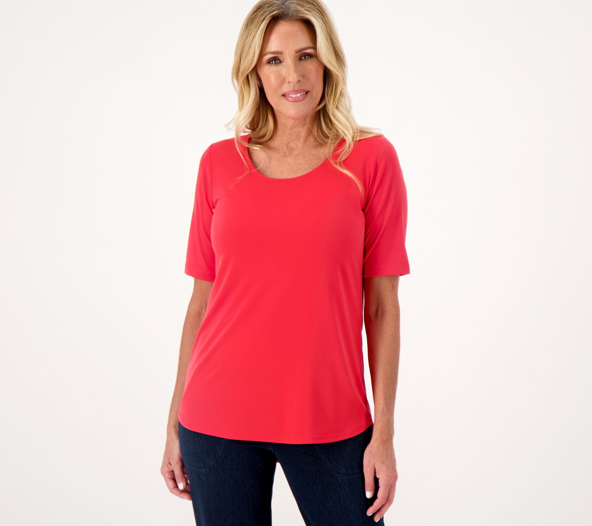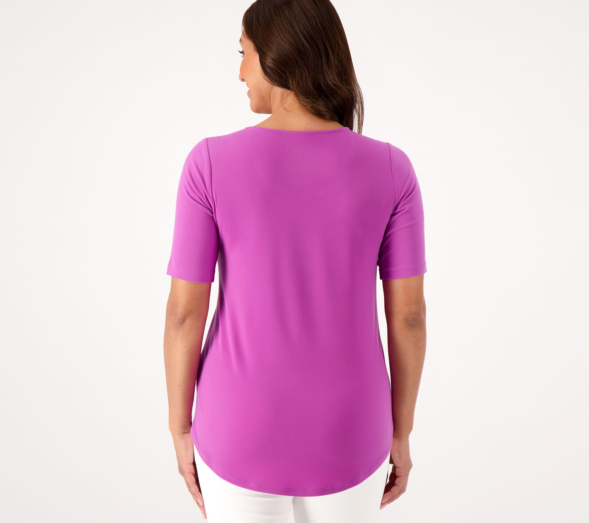 • Features: scoop neckline, curved hi/lo hem, elbow-length sleeves