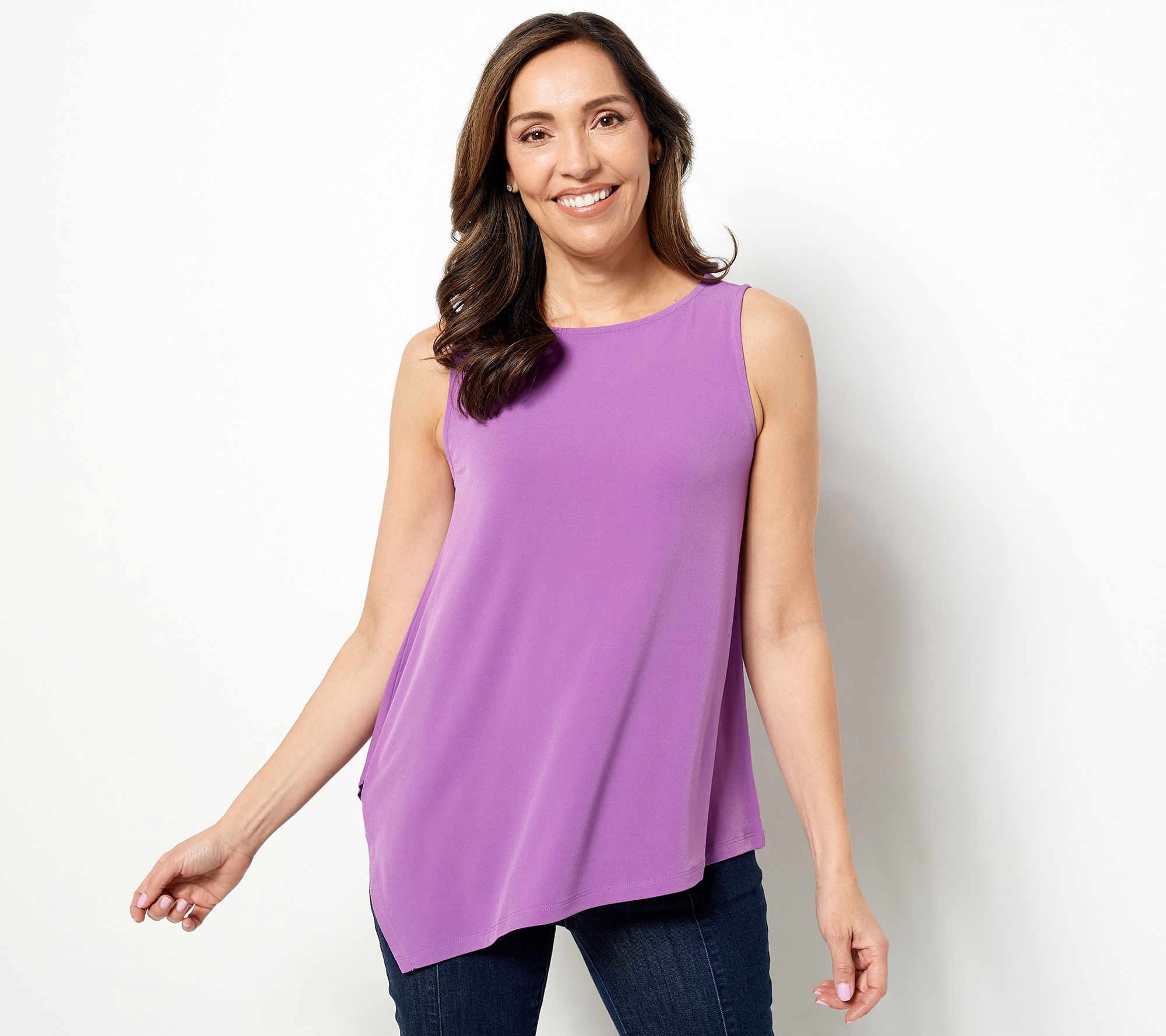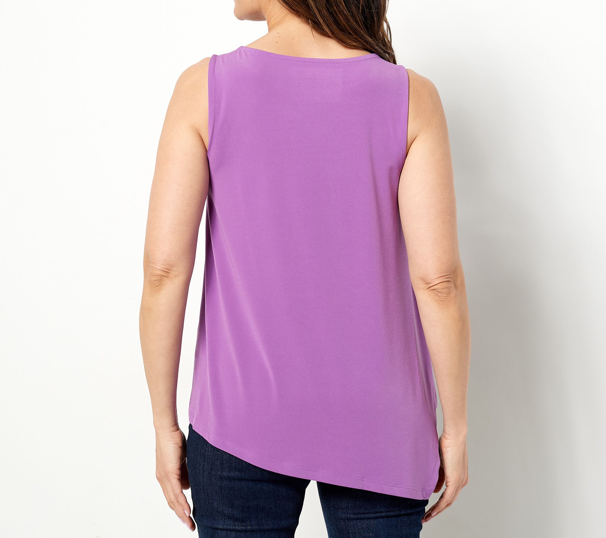 Give your warm-weather wardrobe a subtle refresh with this tunic tank. Its asymmetrical hem gives it a quiet splash of energy and its Liquid Knit® fabric provides a smooth and comfy feel. From Susan Graver.