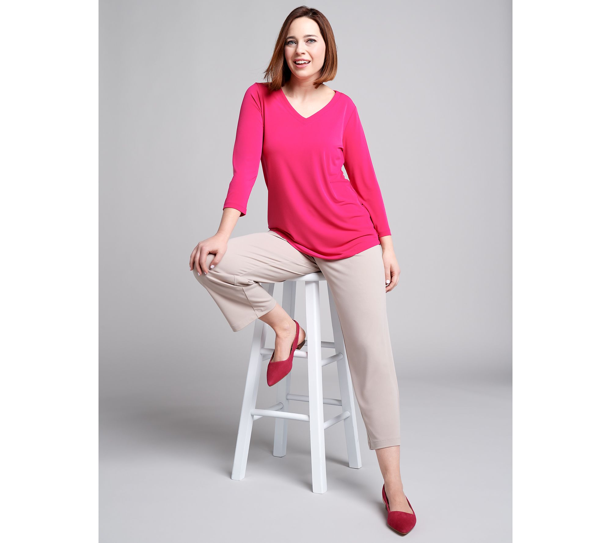 • Features: V-neckline, solid color, 3/4-length sleeves, shirttail hemline