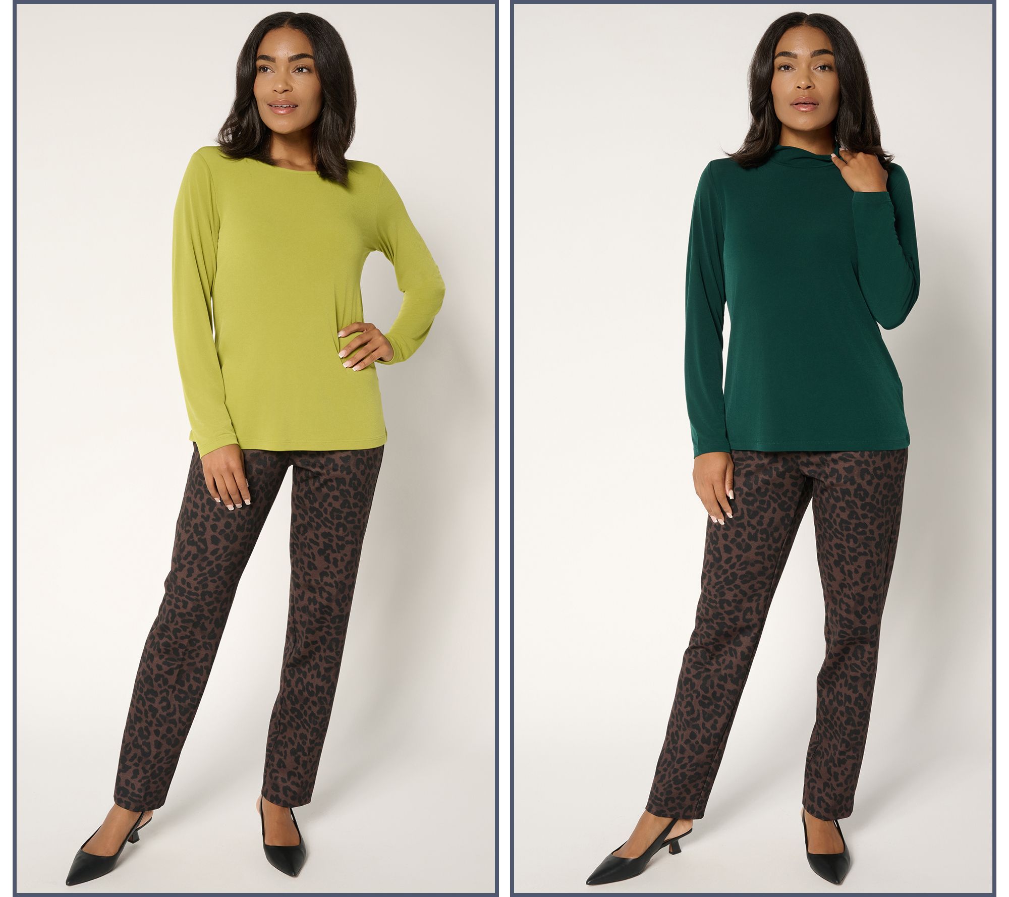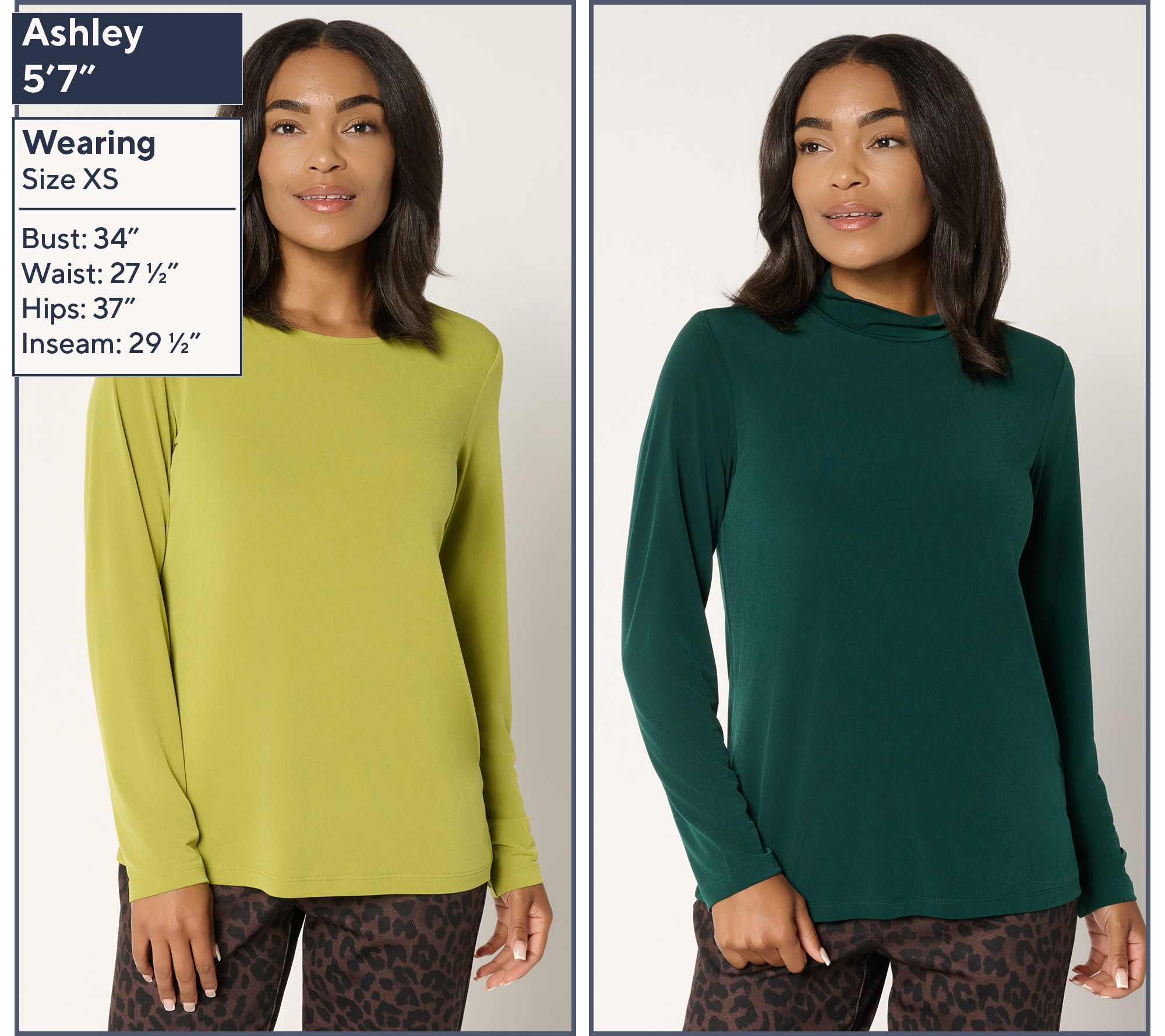 Double up on a wardrobe winner with this set of two knit tops. Crafted in luxe Liquid Knit®, both long-sleeve tops offer everyday ease with a semi-fitted silhouette and straight hem. One features a crew neckline and the other a mock neck for effortless versatility as a casual layer or a smart separate. From Susan Graver.