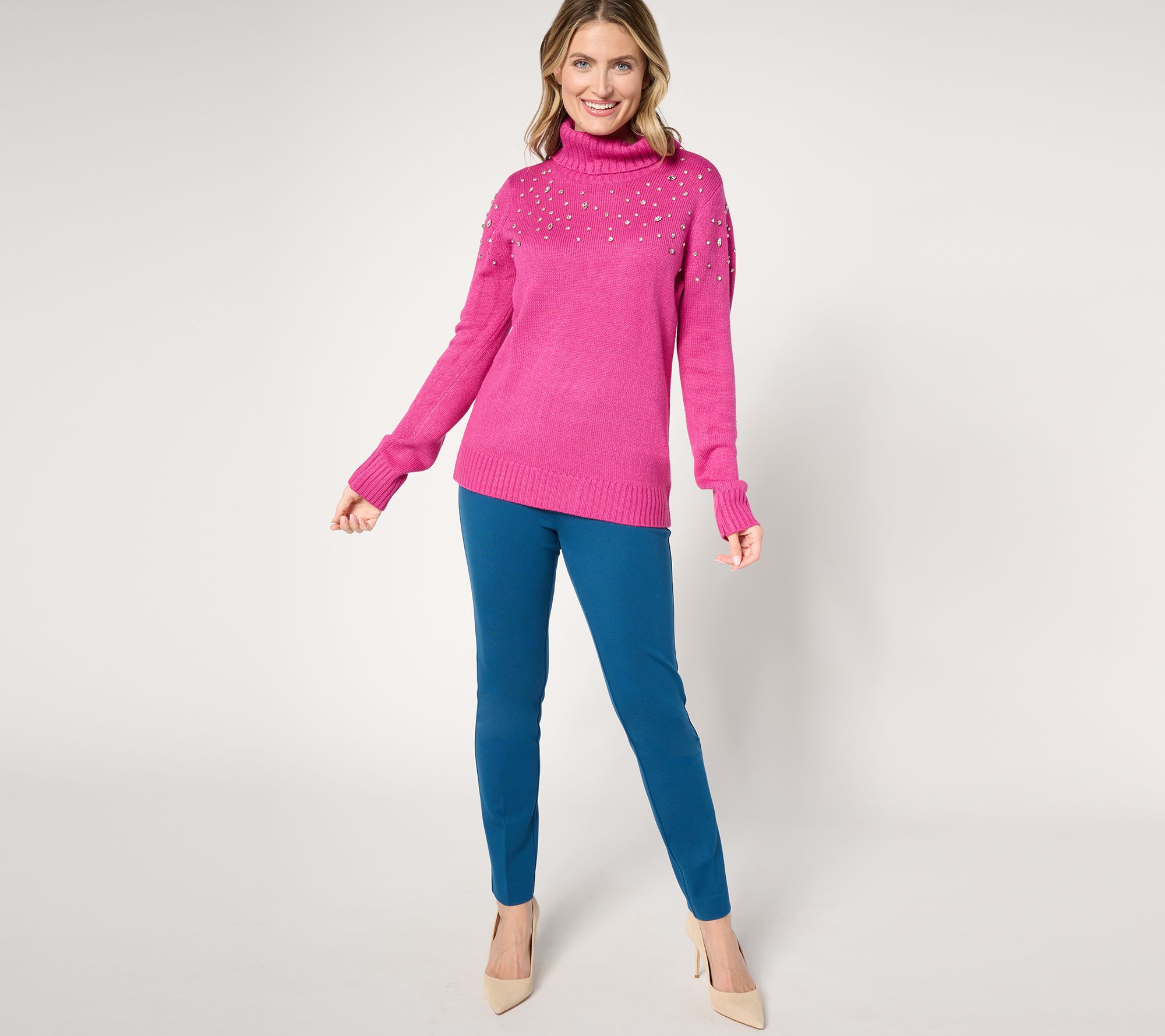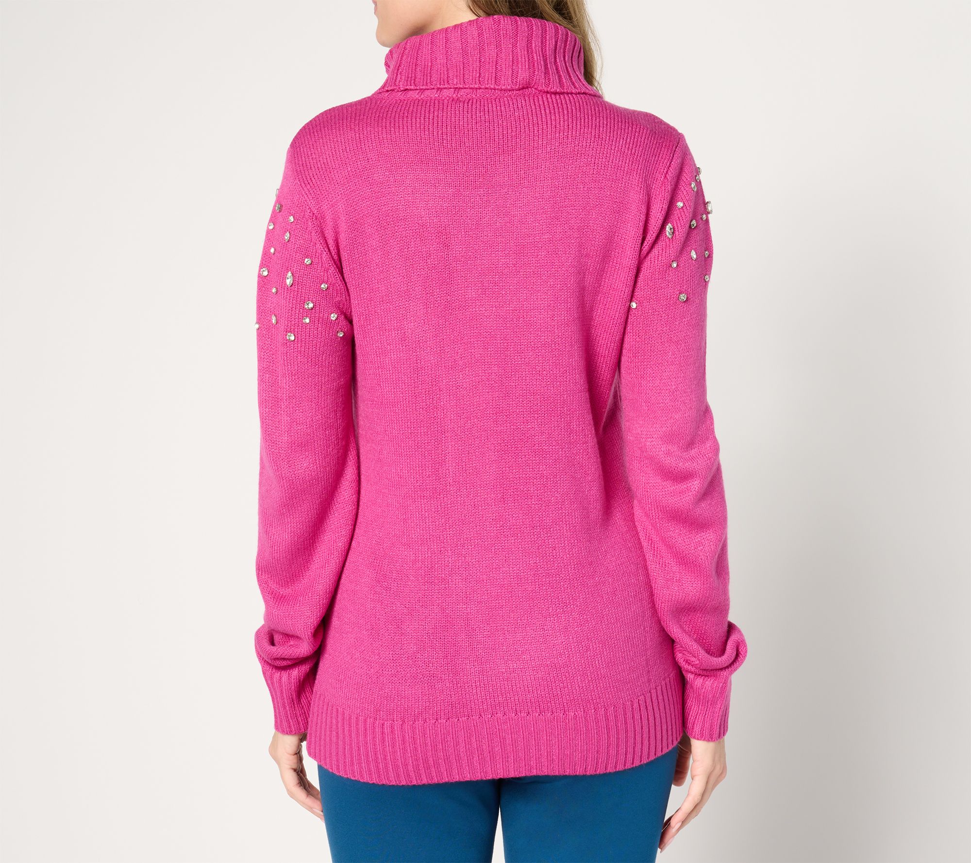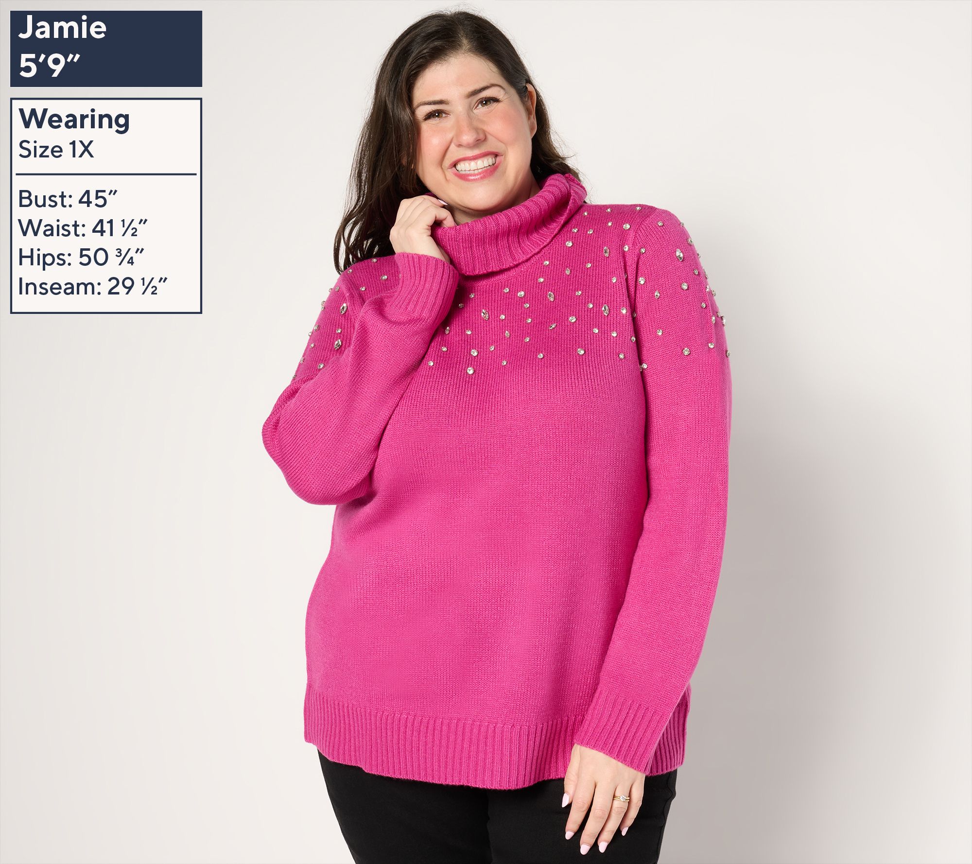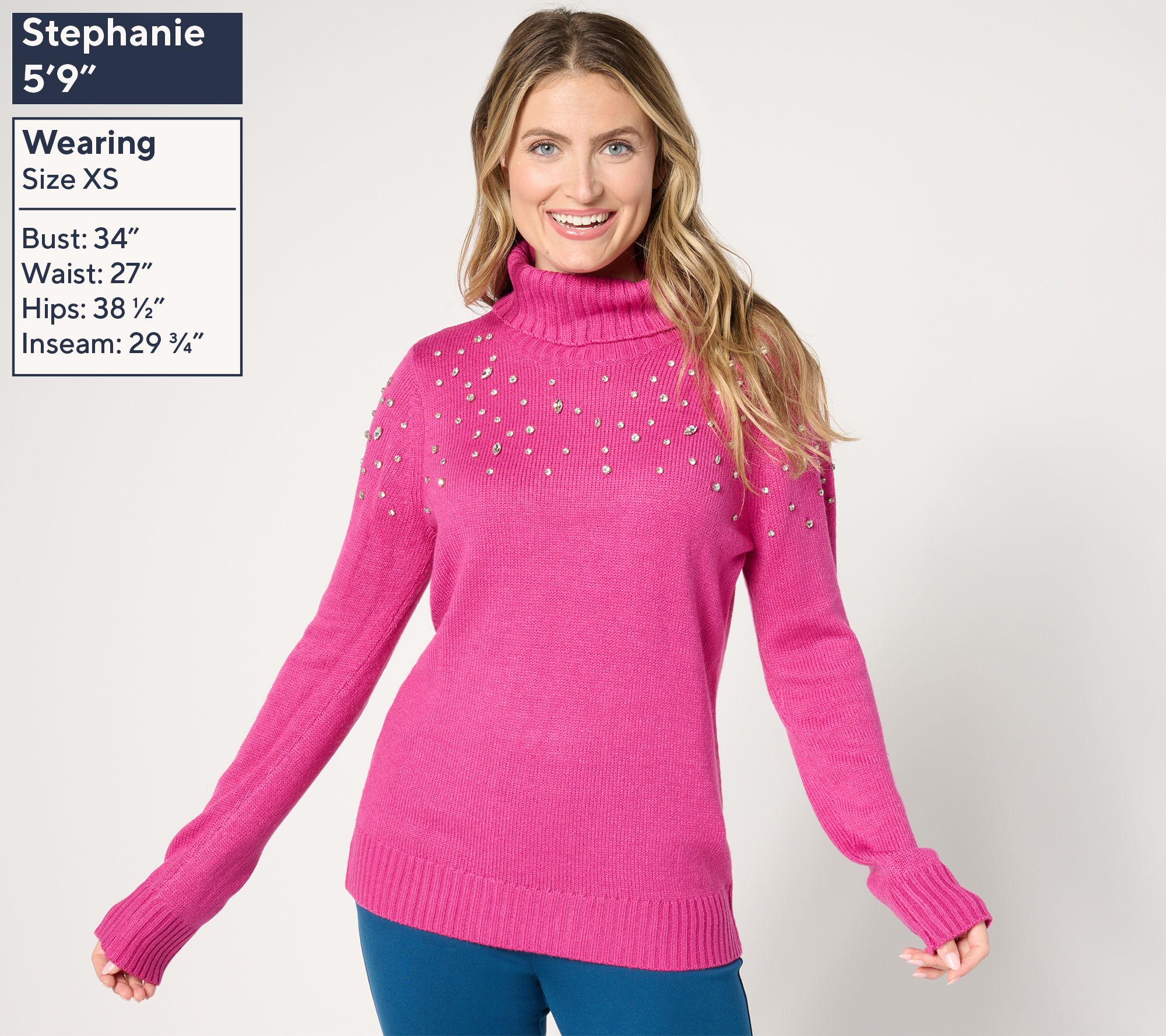 Give your seasonal style a glam up with this embellished cowl neck sweater. Dotted with eye-catching rhinestones, the chic design also boasts a ribbed collar, hem, and bottom band to create an elevated cozy look that's a fab find for festive gatherings and casual outings alike. From Susan Graver.