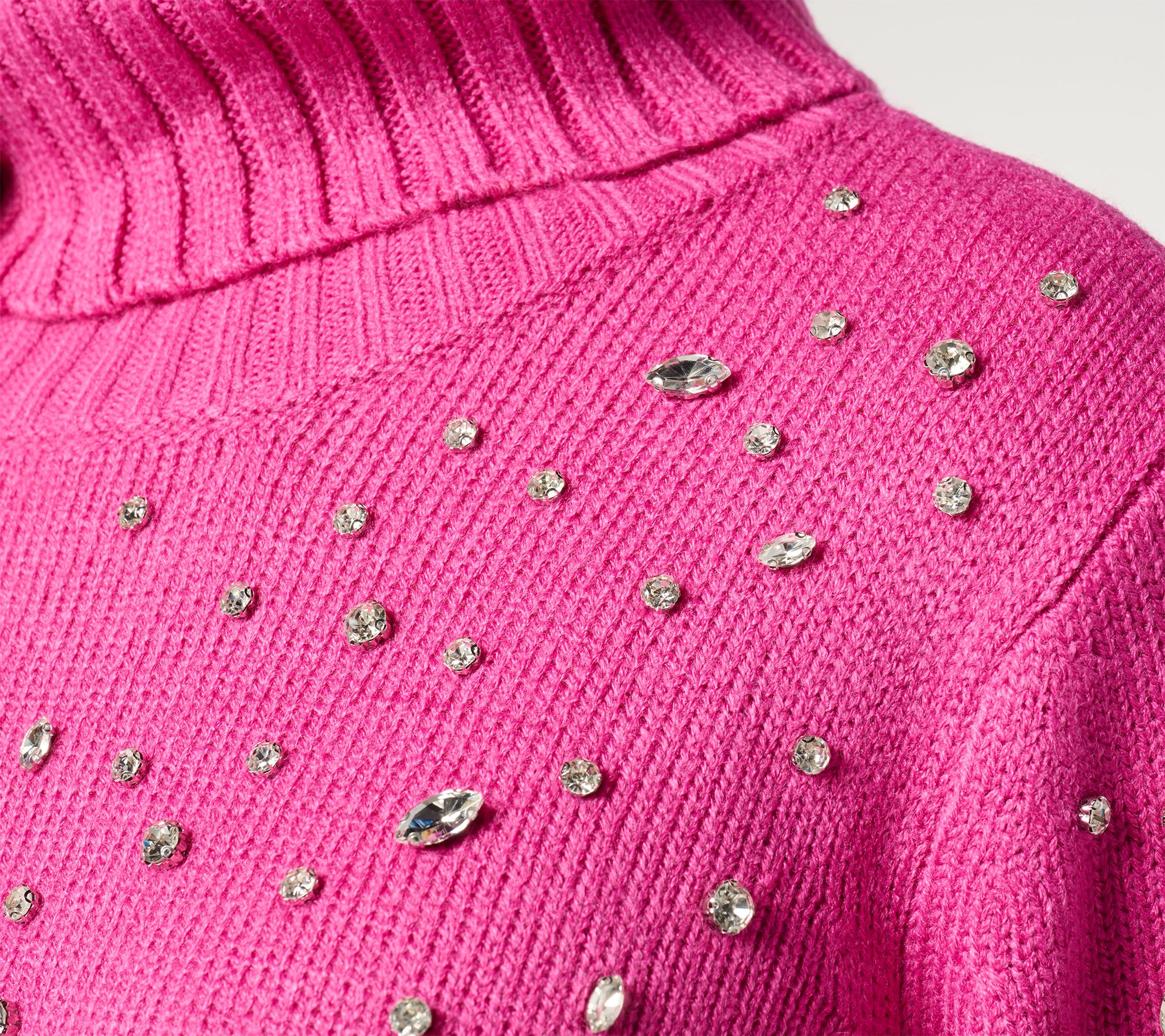 • Features: ribbed collar, hem, and bottom band; rhinestones at top body and sleeve cap; cowl neckline, long sleeves