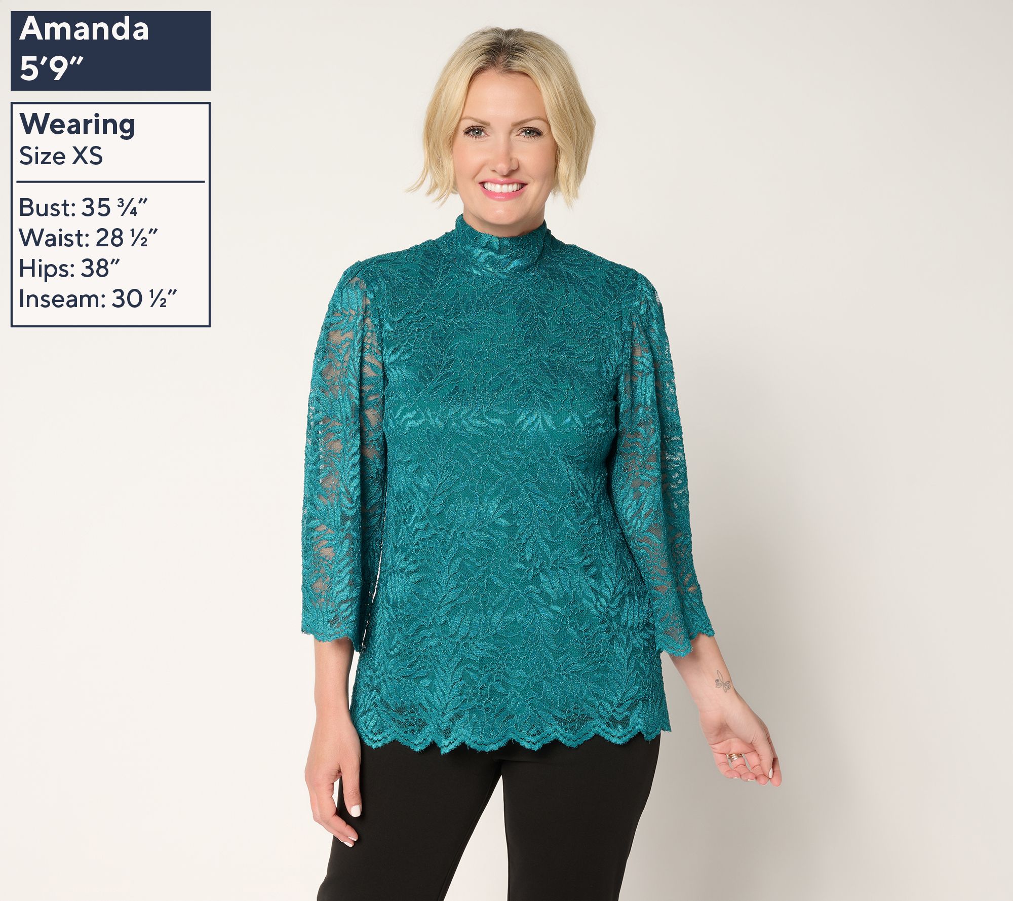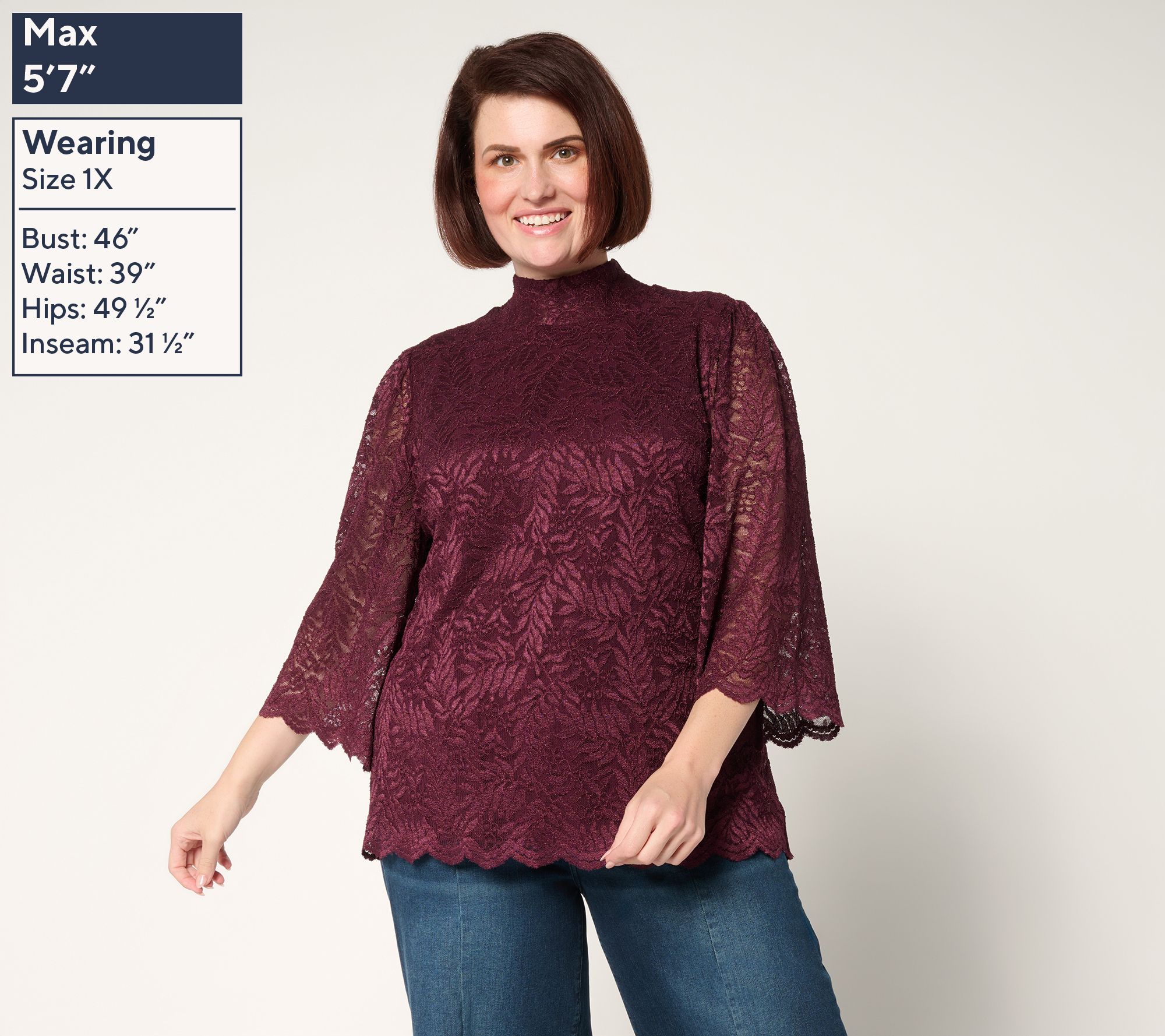 Make your entrance unforgettable in this stretch lace top, finished with fluttery bell sleeves and a sleek turtleneck. The soft knit has a fully lined body (for ease and confidence), while a keyhole back and scalloped edges offer standout details for your next event or special dinner. From Susan Graver.