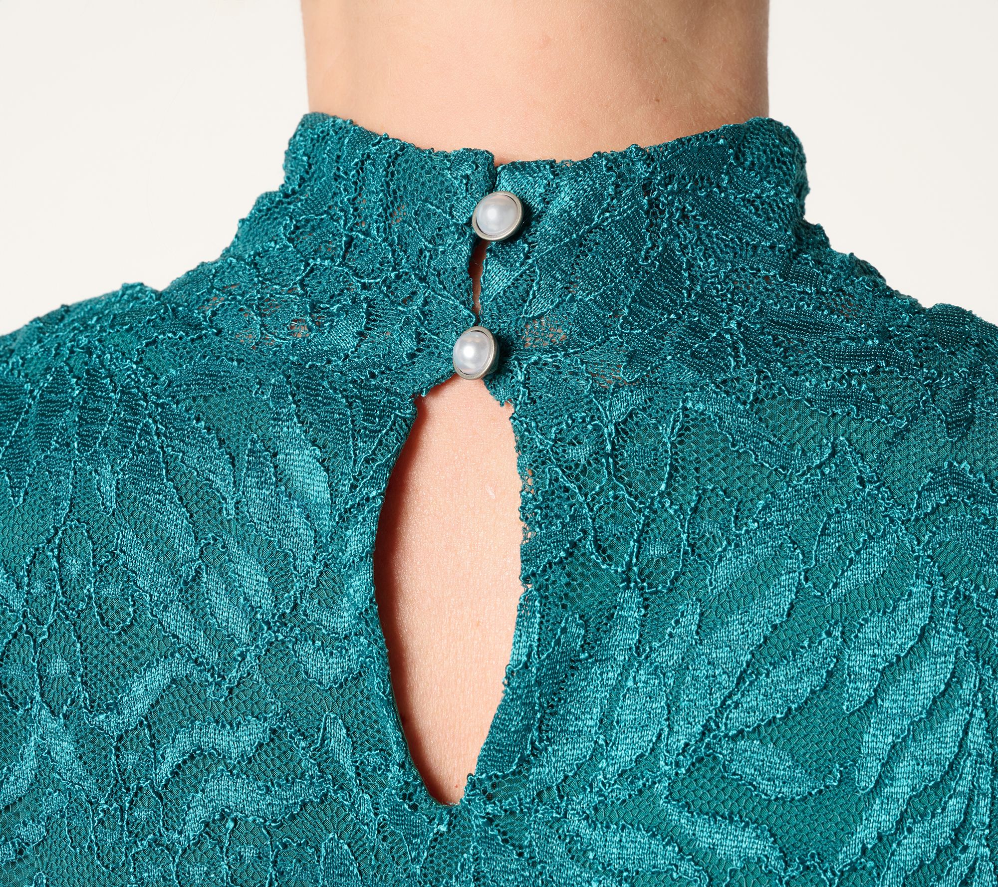 • Features turtleneck, keyhole opening at back with two loops and buttons, fully lined body, 3/4-length sleeves with gathers at top and bell openings, scalloped edges at sleeves and hem