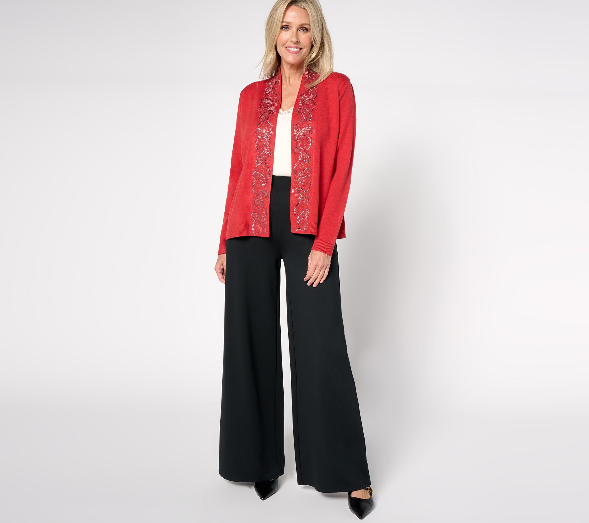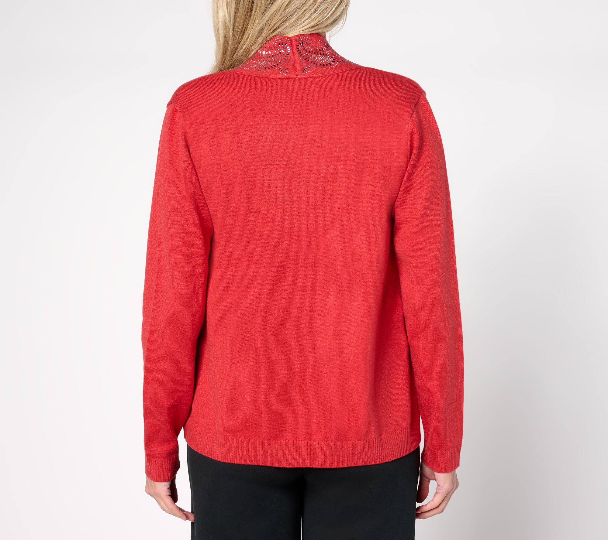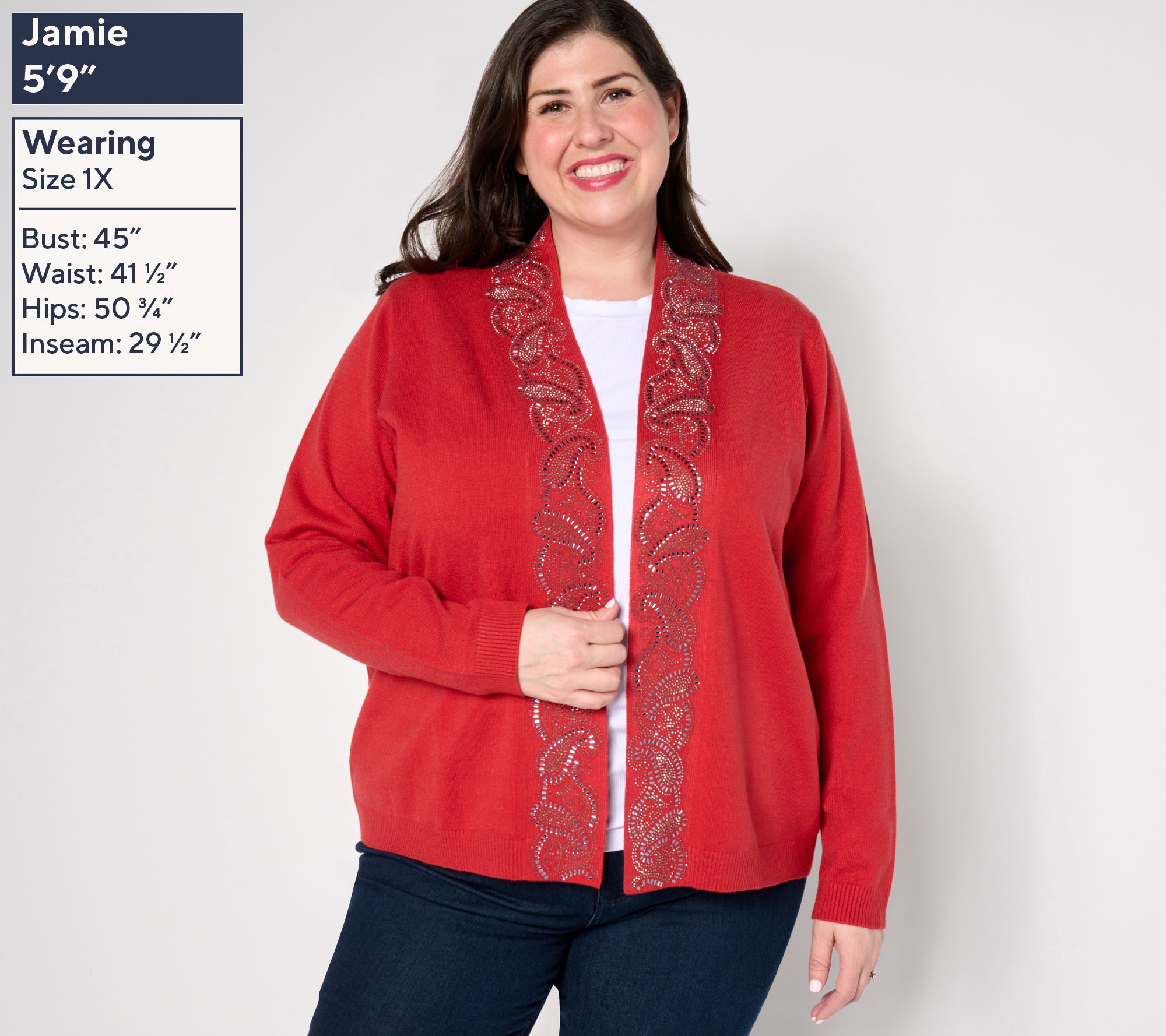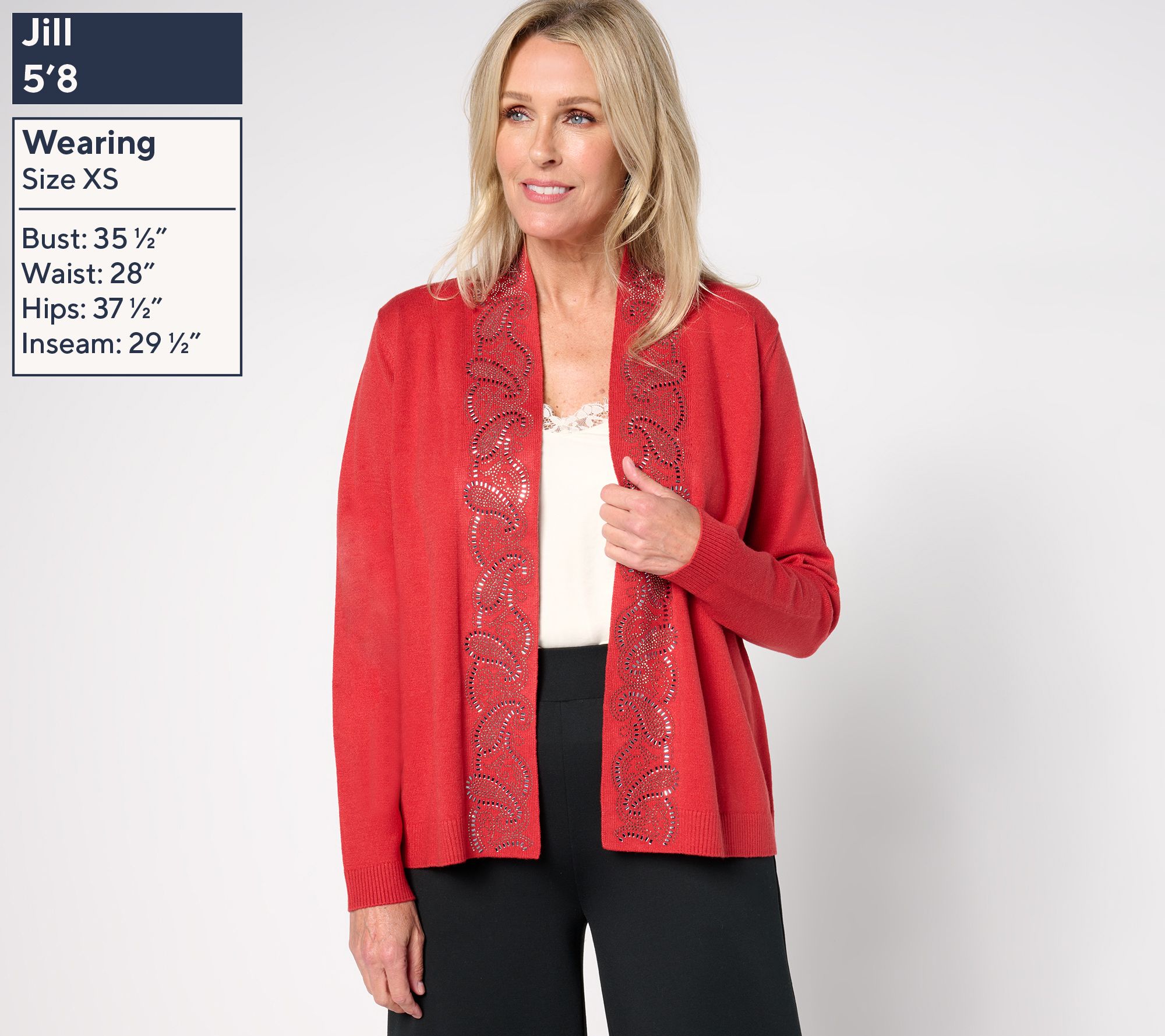 Seize the spotlight at your next festive occasion or special event with this standout sweater cardigan. The classic silhouette creates a luxe layered look, while the embellished open front and ribbed cuffs and hems complete the fab find. From Susan Graver.