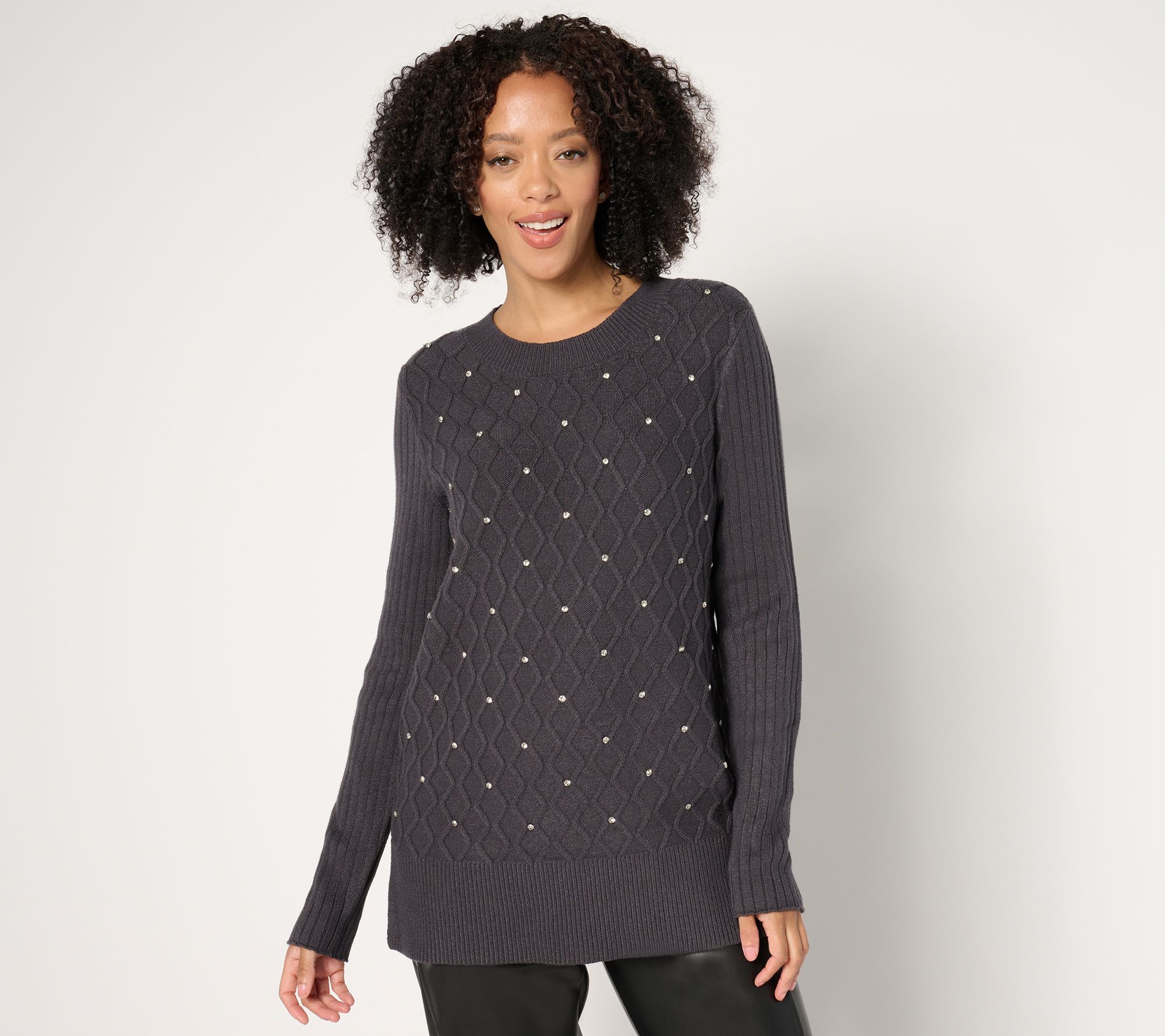 Don't you love when your seasonal wardrobe just comes together? Add this Susan Graver sweater tunic to your cool-weather lineup, and let its elegant embellishments and cable stitch details elevate your look. Featuring a crew neckline, ribbed sleeves, and hem slits for that extra bit of flair, it's a stand-out piece that pairs beautifully with everything from jeans to skirts. From Susan Graver.