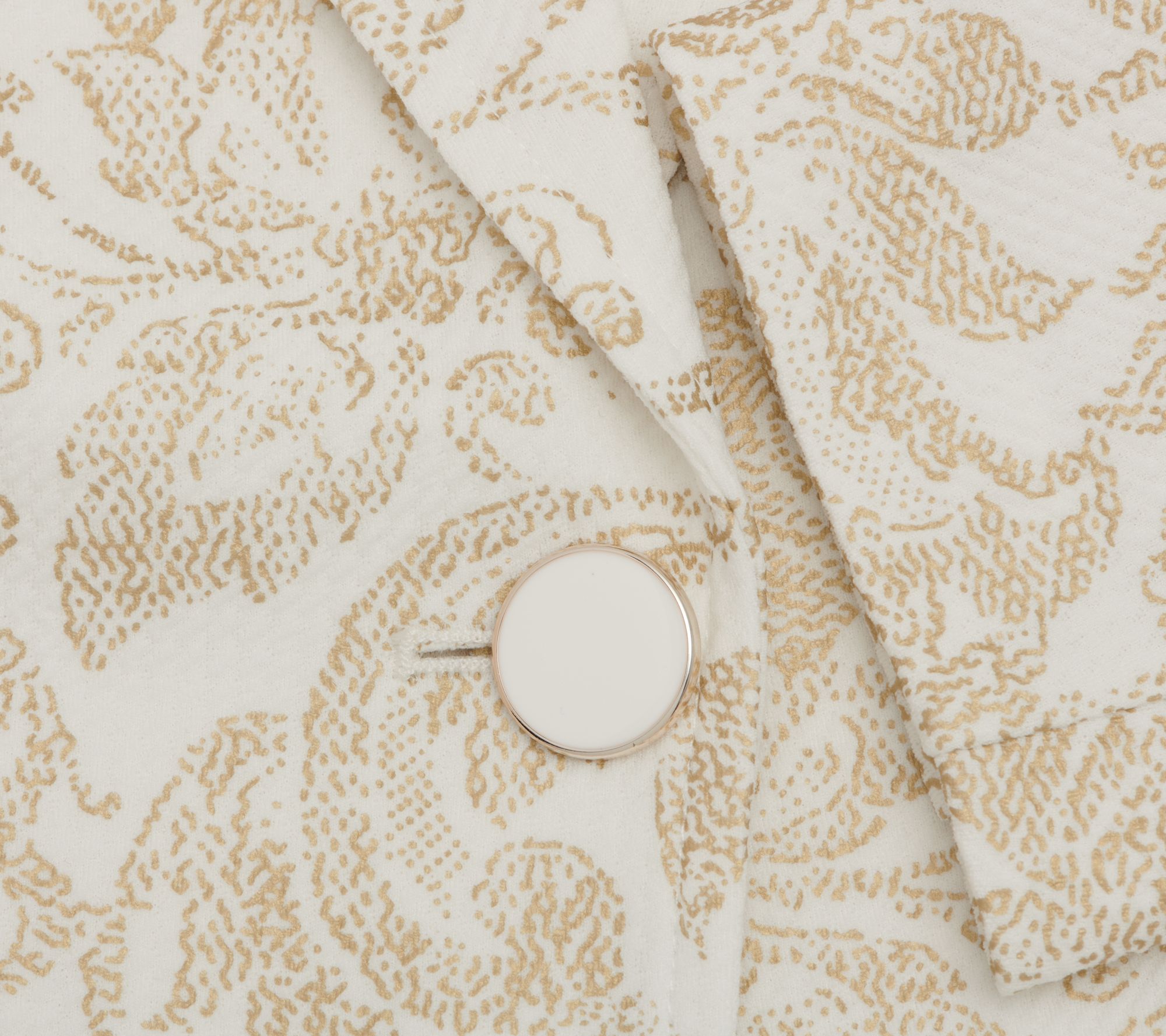 • Features: metallic print, notch collar, long sleeves, single button-front closure, welt pockets, back princess seaming, unlined
