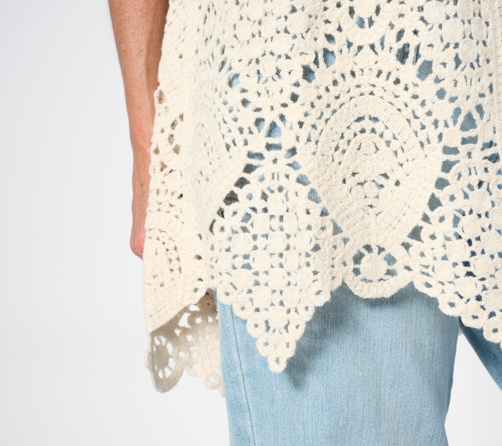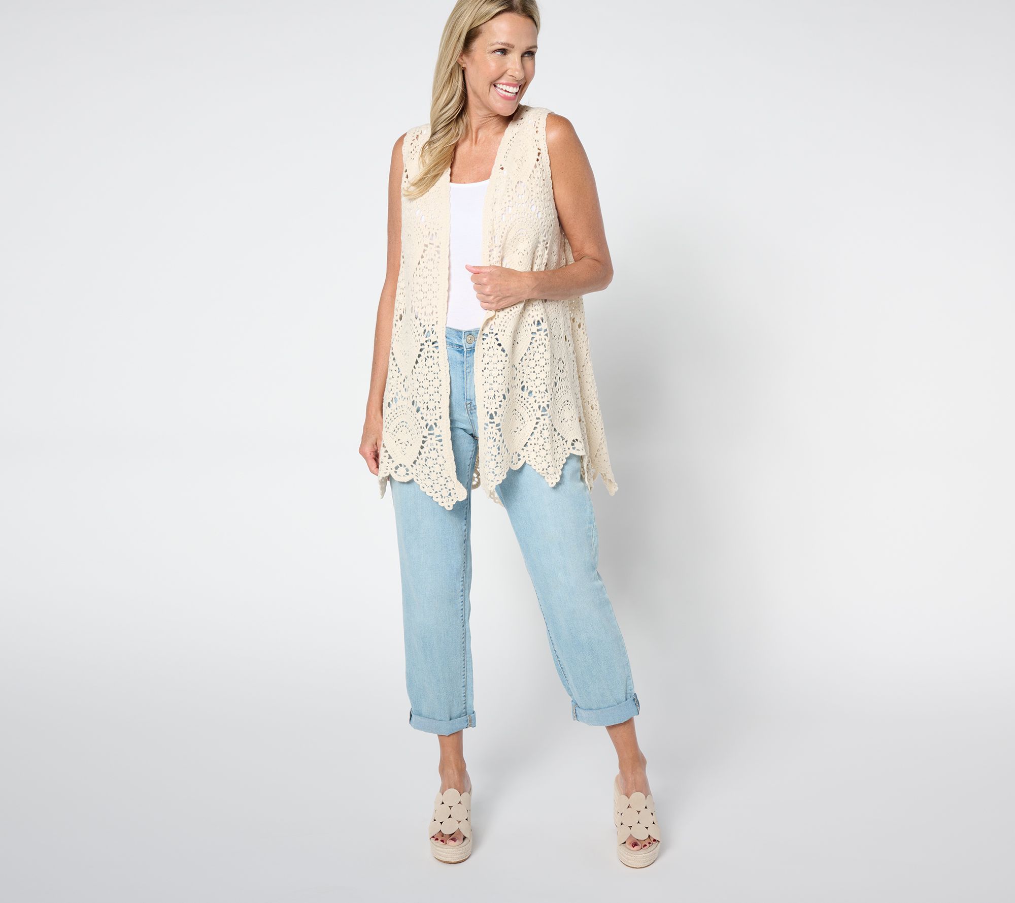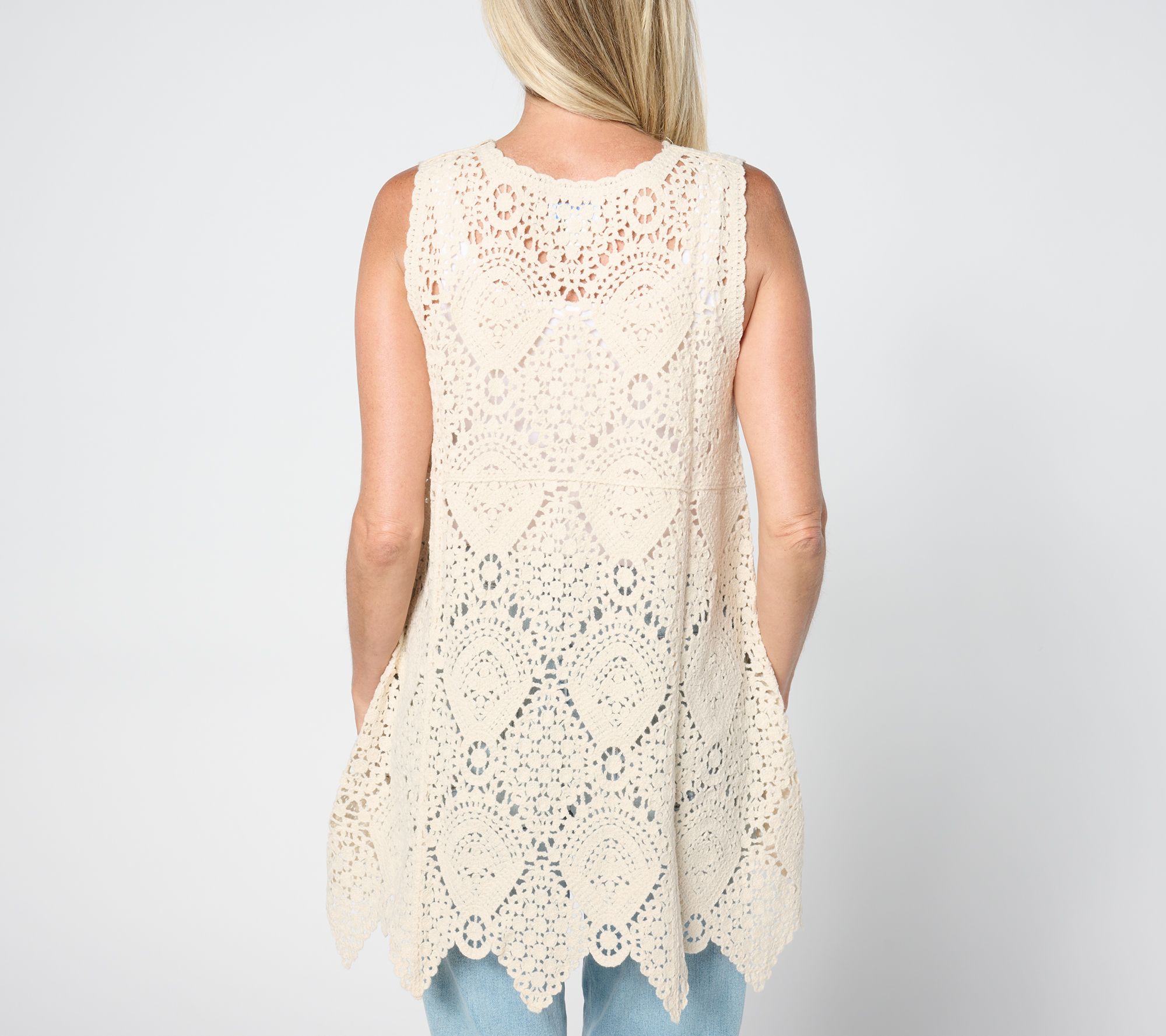 Add luxe Bohemian style to any look with this crochet vest. Layer it over a T-shirt and jeans will platform sandals or a flowy maxi dress for extra visual appeal. From Susan Graver.